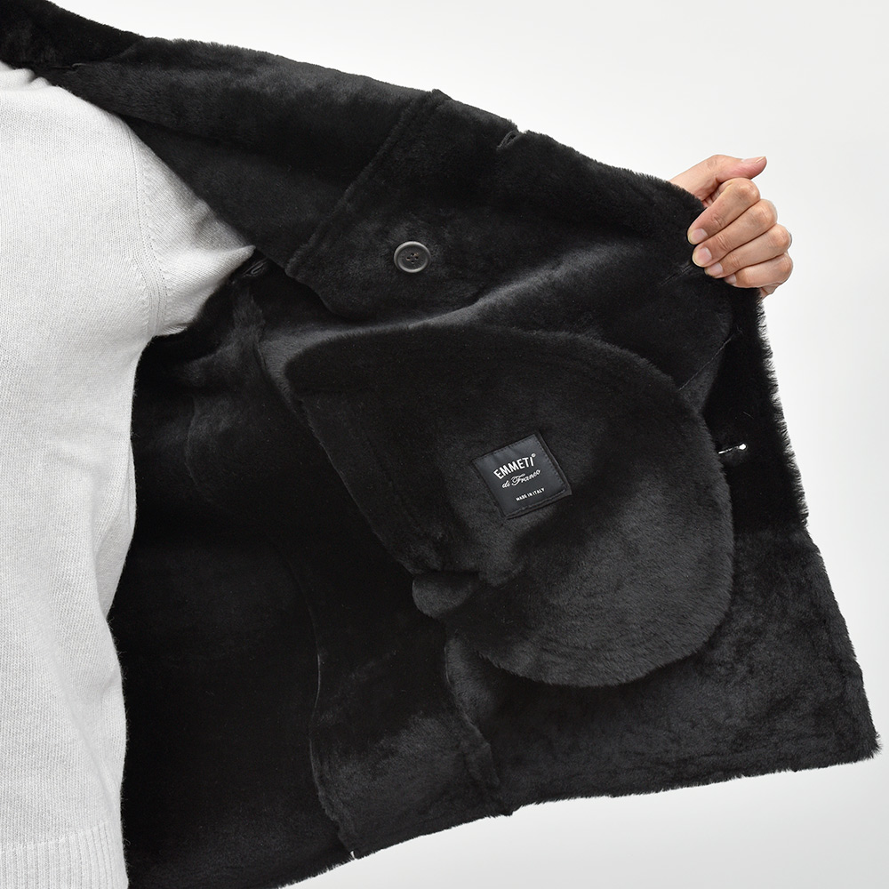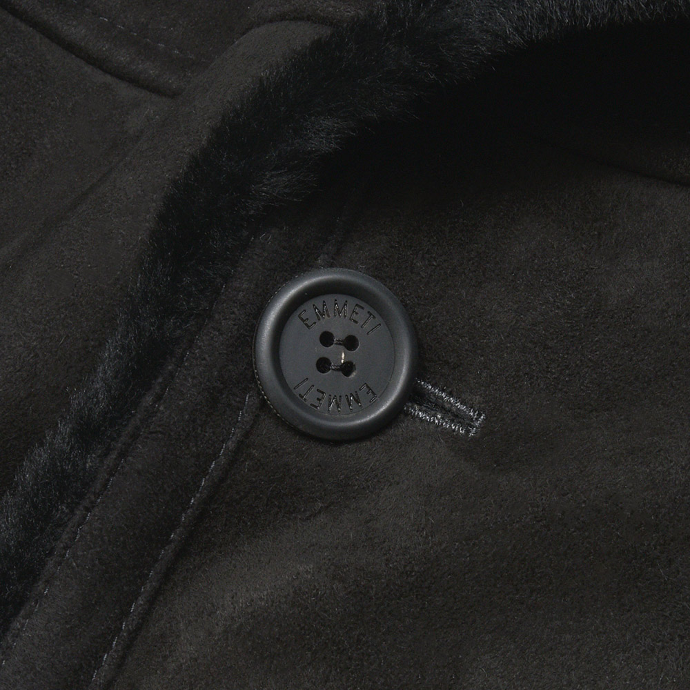 通常ラグジュアリーブランドで使用されているクオリティのレザーを、限りある着数分だけオーダーできる“SPレザー”シリーズ。こちらはEMMETI社では通常取り扱っていない、ハイグレードなムートン素材になります。表面のスエードはしっとりとしていて柔らかく、いつまでも撫でていたくなるもっちりとした風合い。また、ストレートヘアーを使用したラグジュアリーな雰囲気で、さらに上質なムートン素材ですので軽く非常に着やすい重量となっています。