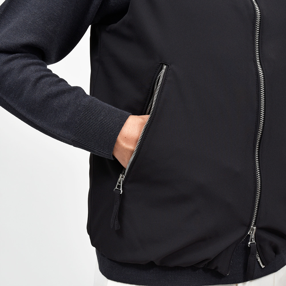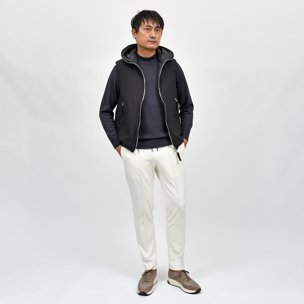 表地に使用されているファブリックは、giabsarchivioで今シーズン登場したニューファブリックの“ナイロンツイルジャージー”。目付け350gの秋から春の3シーズンで着用できる薄すぎず暑すぎない程よいウエイトに、ジャージーらしいもっちりとした触感と、ナイロンらしい光沢感を併せ持った上品な佇まい。伸縮性は言わずもがなで、斜めだけではなく縦にも横にも伸びるためストレスのない穿き心地です。また、ジャージー素材でありながらもウォッシャブル仕様となっており、自宅で洗濯できるという大きなアドバンテージを持っています。