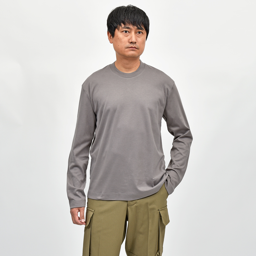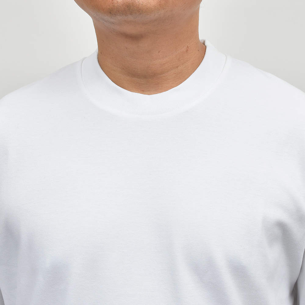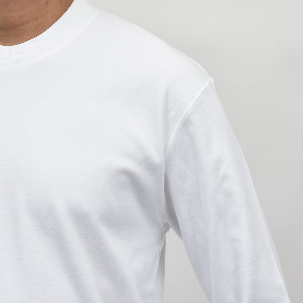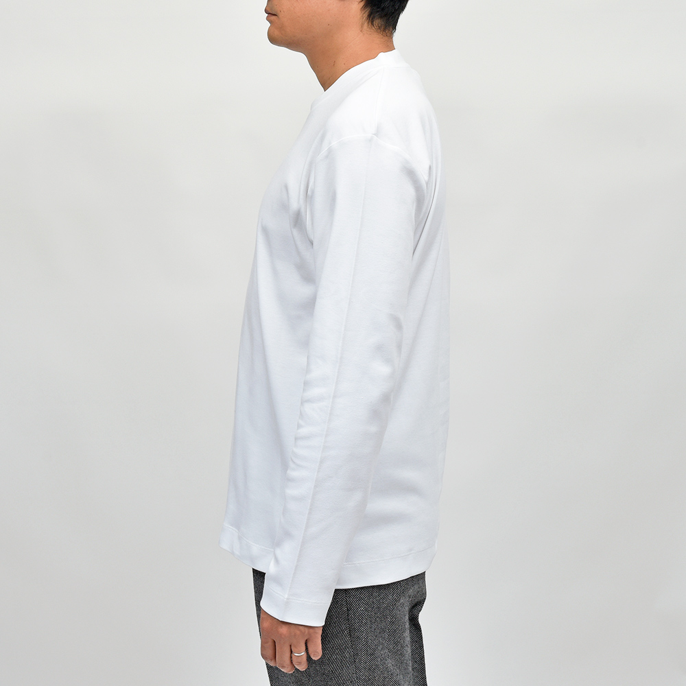 リラックス感あるフィッティングに、少し太めのネックリブ。さらに、しっかりとしたヘビーウェイトのブラッシュドコットン生地を使用することで、透け感を抑え一枚で着用できる頼もしい一枚となっています。