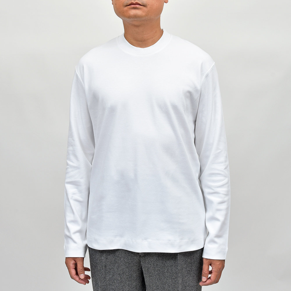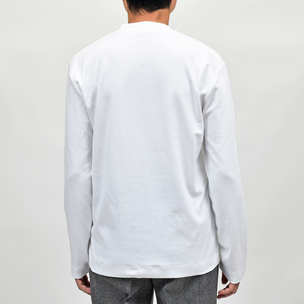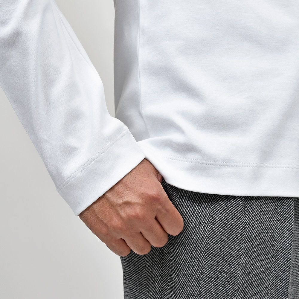 最高級のカリフォルニア産エクストラロングステープル(超長繊維)スーピマコットンを使用したこちらは、程よいコシがありつつも柔らかな肌触りのブラッシュドコットン生地。ブラッシュドコットン特有の少し起毛感のある質感は肌あたりが良く、非常に優れた着心地になります。