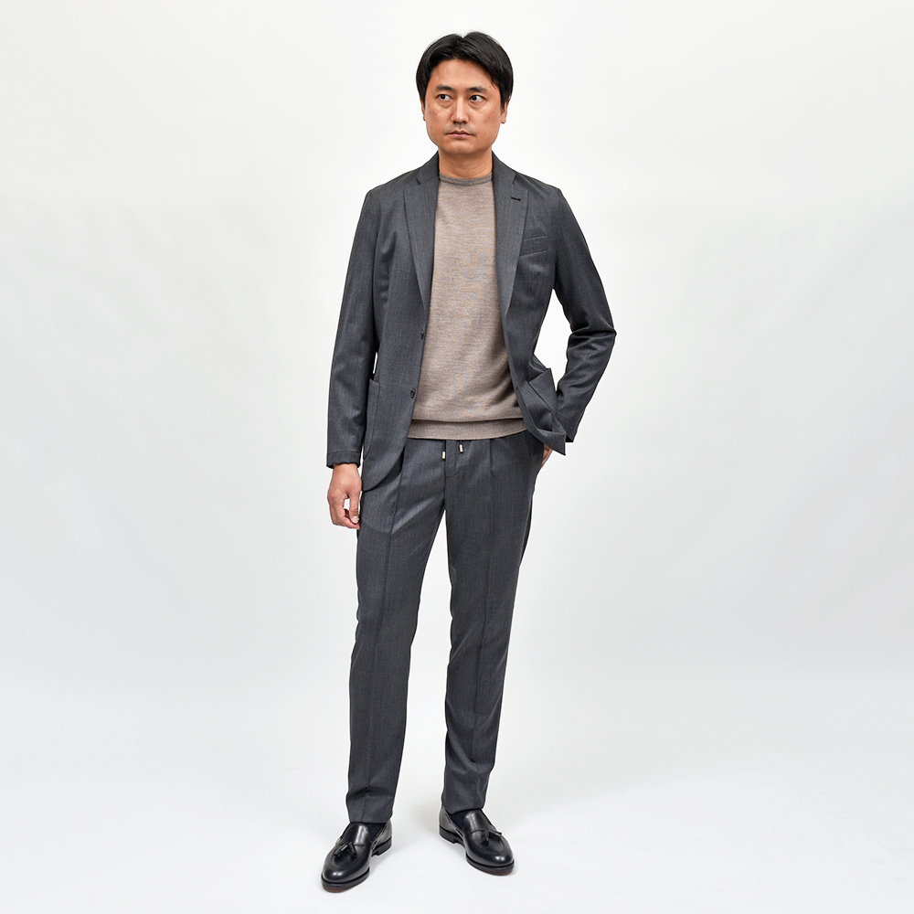 通常のラインよりもラグジュアリーなファブリックを使用したgiabsarchivioのハイエンドライン“giabsarchivio GOLD”。コチラは真夏以外で着用できるサージ生地のテクノウールになります。目付け275gと汎用性の高いややライトな生地に、高級感のある艶感。ほとんど起毛感のないサージですので、秋から春までの長い期間で着用可能です。また、ウォッシャブルですので家庭での洗濯が可能となった、非の打ち所がない逸品となっています。