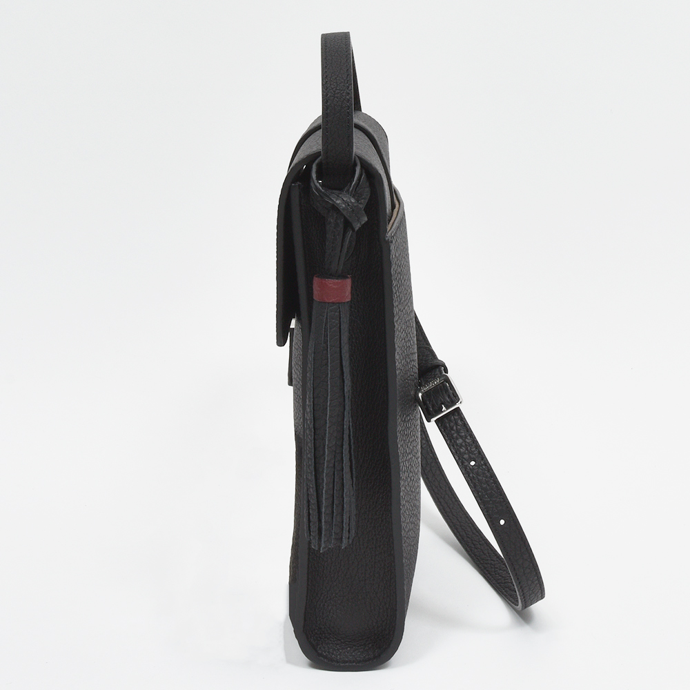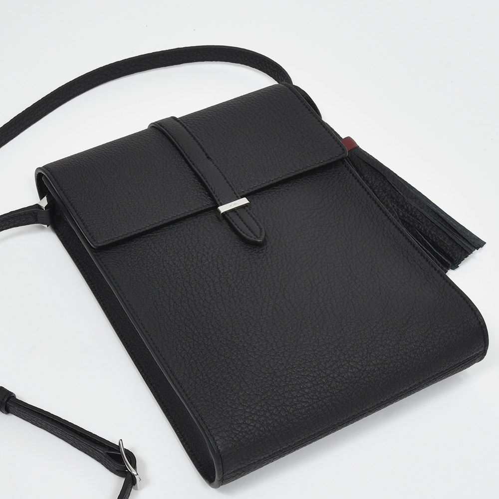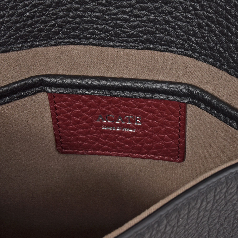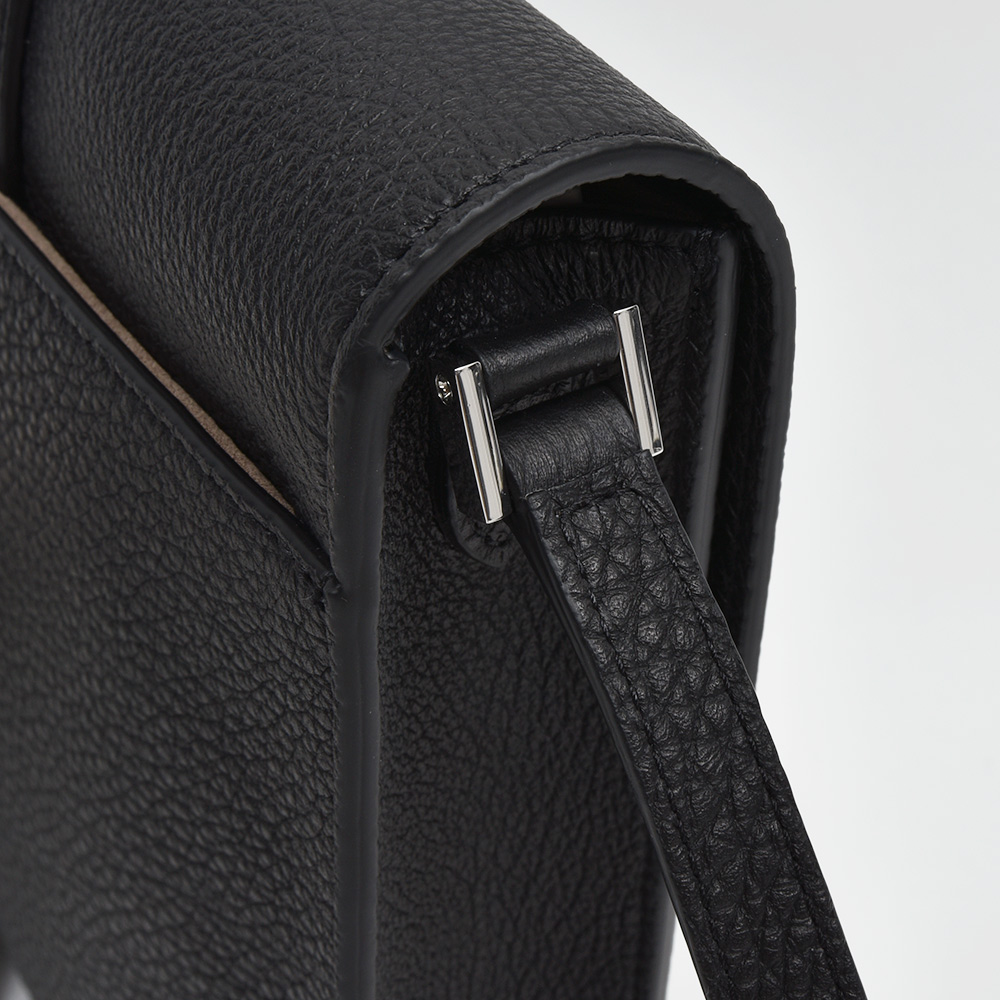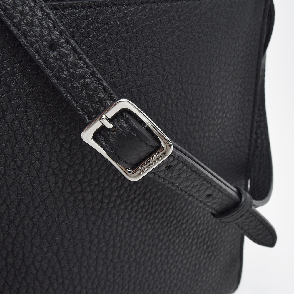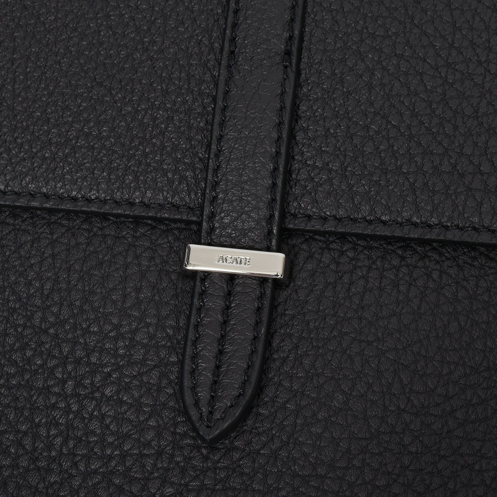 イタリア語で「歩く」という意味を持つモデル“CAMMINARE(カンミナーレ)”。その名の通りちょとした外出に重宝する、普段使いにぴったりなサイズ感です。フロント部分はACATEらしいストラップ付きのフラップ仕様で、端正で品のある印象。ショルダーストラップは5段階で調節できるため、トップスのボリュームによって長さを変えることができます。外側の背面にはポケットが付けられているため、スマホなどを入れるのにも非常に便利。また、ACATE特有のナチュラルシュリンクレザーを使用した上質な質感は、大人の装いをより一層高めてくれる期待感が膨らみます。