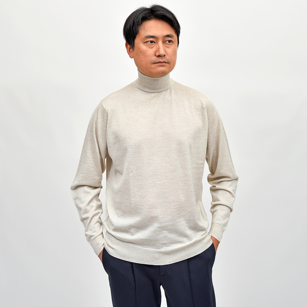 滑らかで仄かな光沢感を放ち、非常に手触りの良いエクストラファインメリノウールを使用した、定番ハイゲージの30ゲージシリーズ。やや透け感のあるハイゲージは、ジャケットなどのインナー使いは勿論のこと、サイズ感を少しゆったりめにすれば一枚で着用しても雰囲気のあるスタイルになります。JOHN SMEDLEYでは定番のタートルネックニットモデル“LEVINE”は、ネックが高過ぎず低過ぎない日本人にも合いやすい設定となった汎用性の高い一品です。