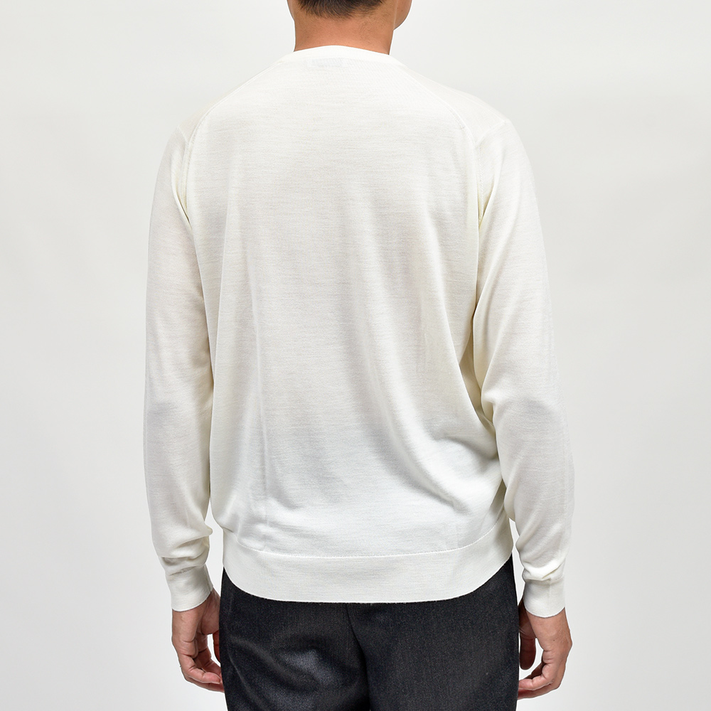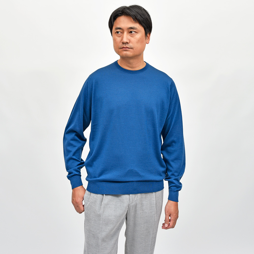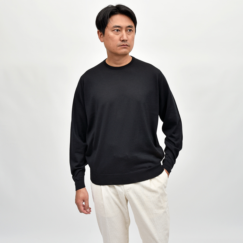 滑らかで仄かな光沢感を放ち、非常に手触りの良いエクストラファインメリノウールを使用した、定番ハイゲージの30ゲージシリーズ。やや透け感のあるハイゲージは、ジャケットなどのインナー使いは勿論のこと、サイズ感を少しゆったりめにすれば一枚で着用しても雰囲気のあるスタイルになります。JOHN SMEDLEYでは定番のクルーネックニットモデル“SCANLAN”は、Tシャツやシャツとの重ね着は勿論、一枚で着てもスタイリングに品のある表情を作り上げてくれます。