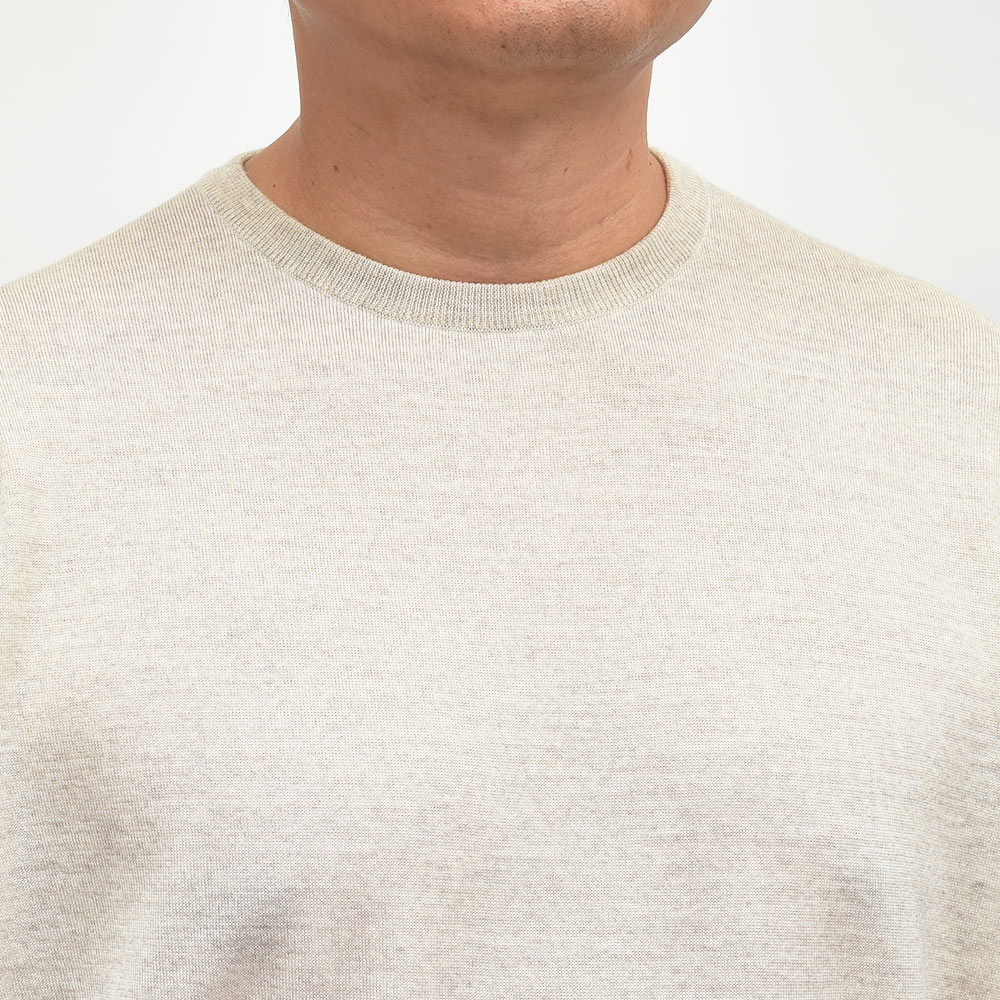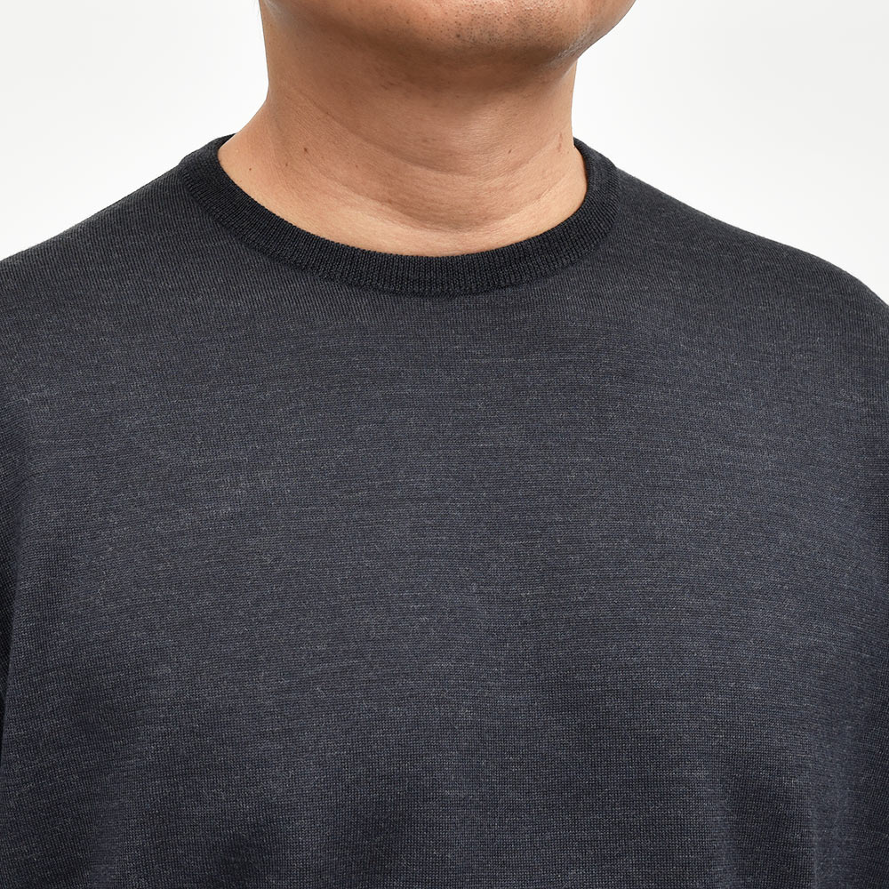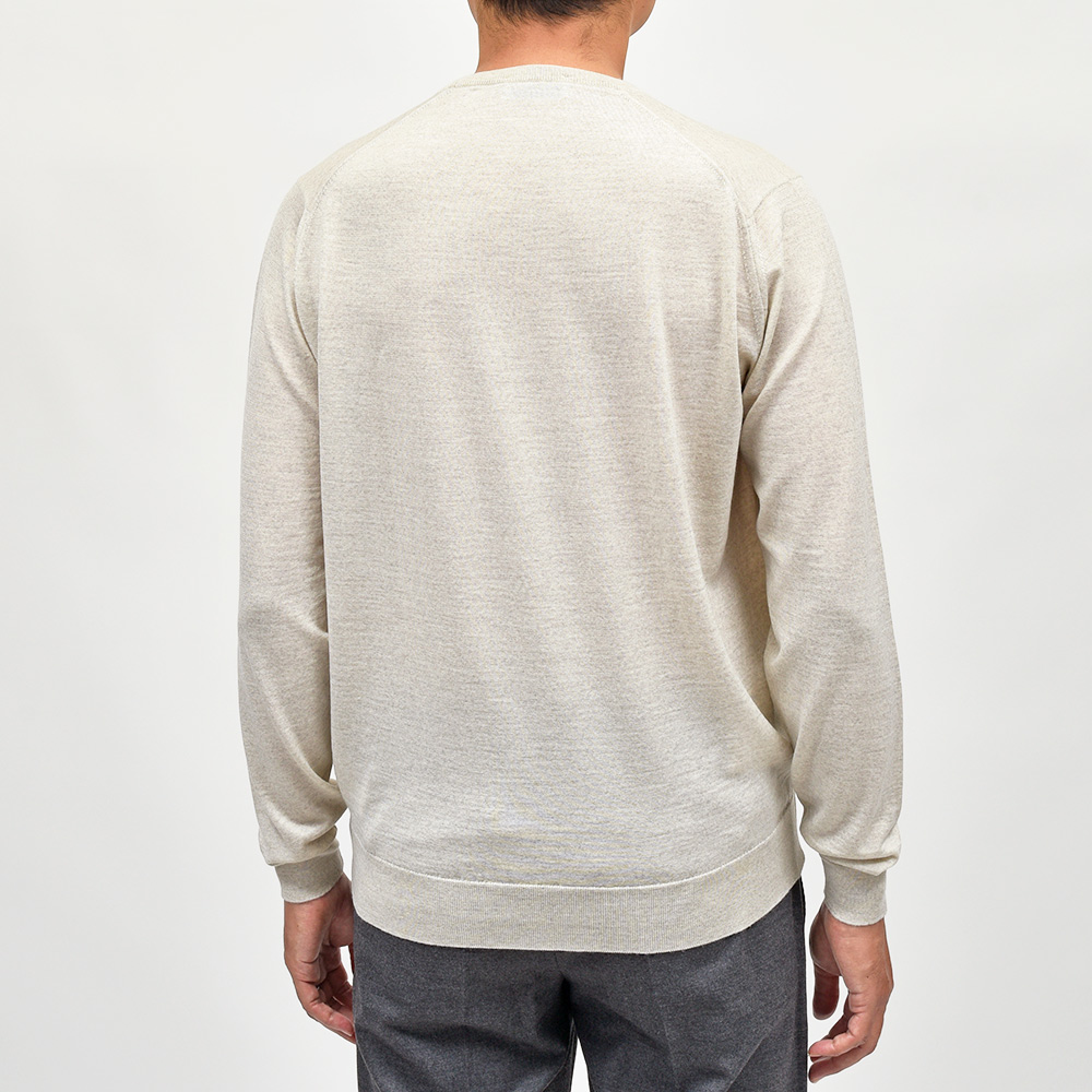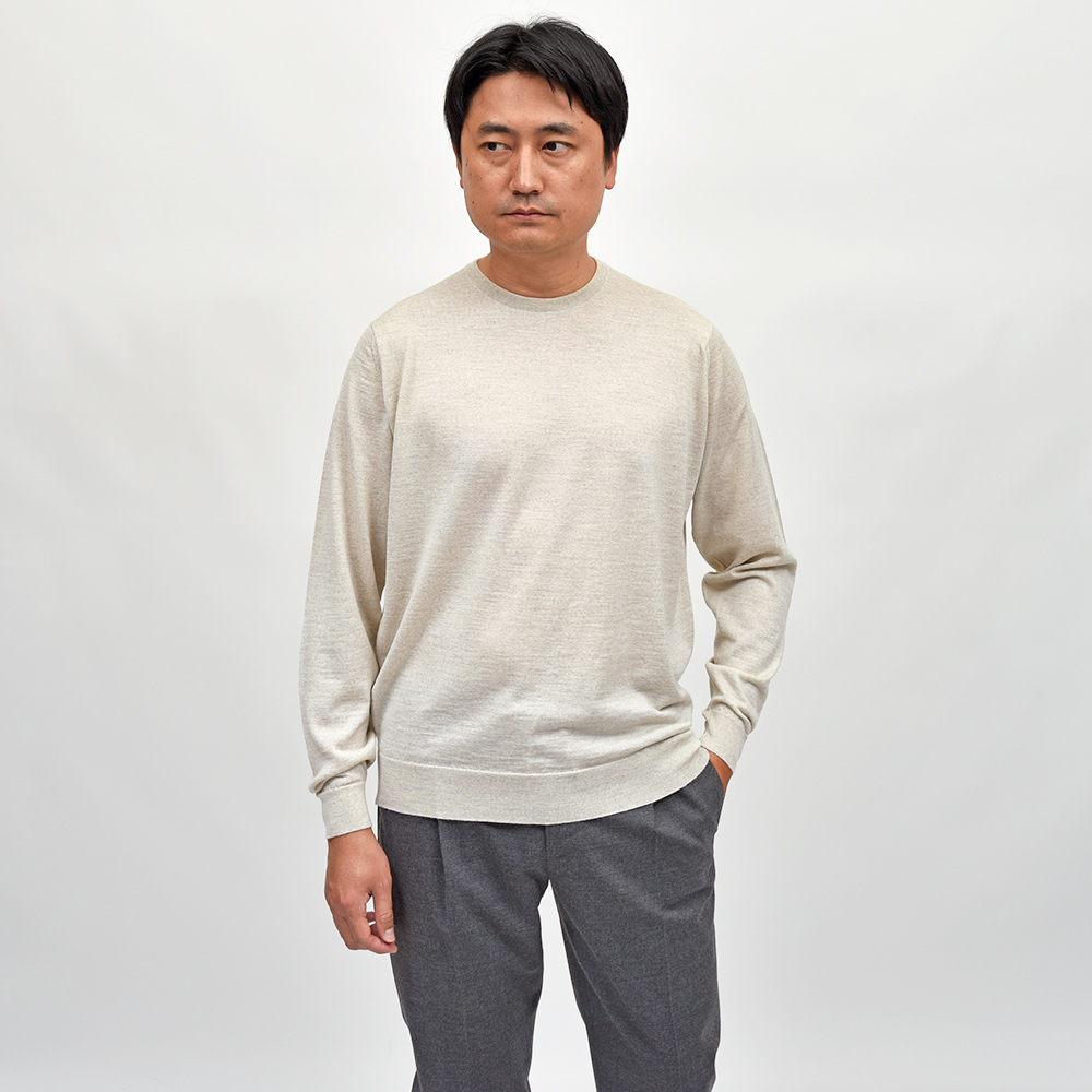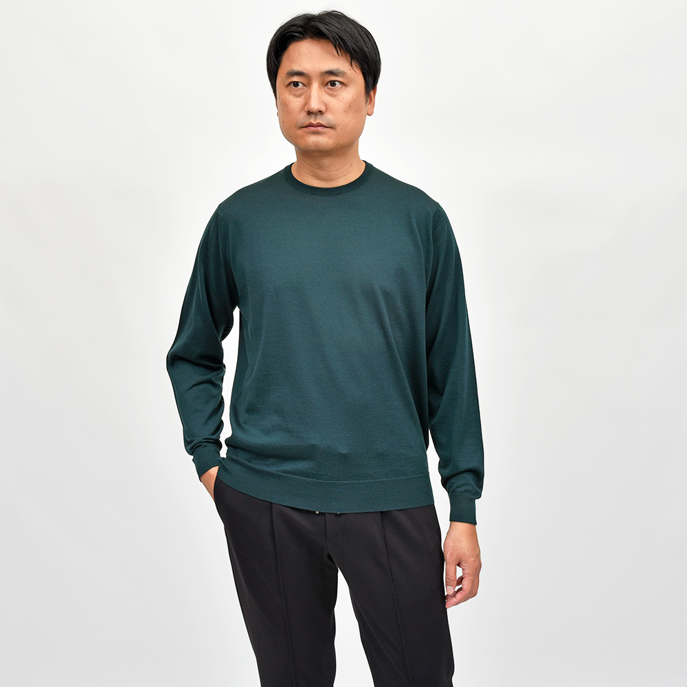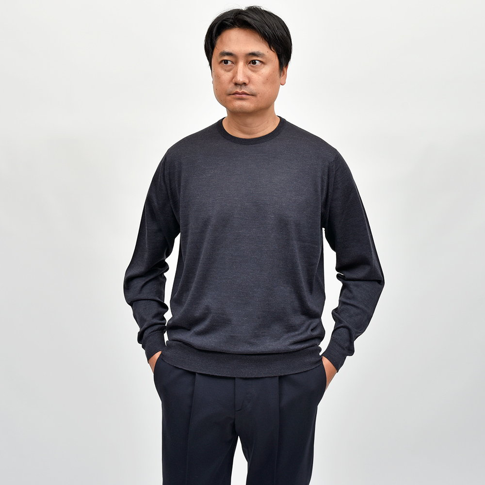 少しラフな見え方になるクルーネックニットだからこそ、上品な質感のエクストラファインメリノウールとの相性は抜群です。