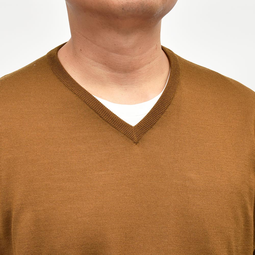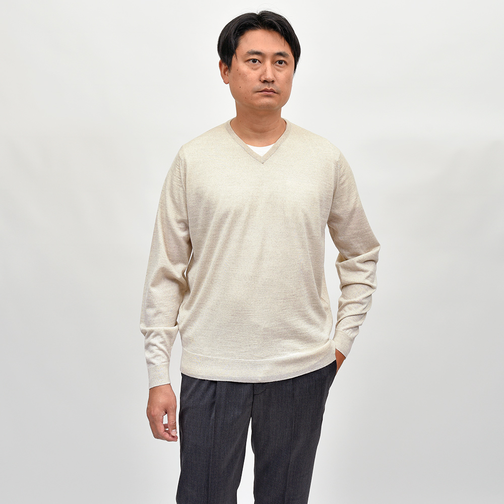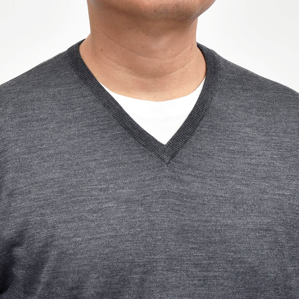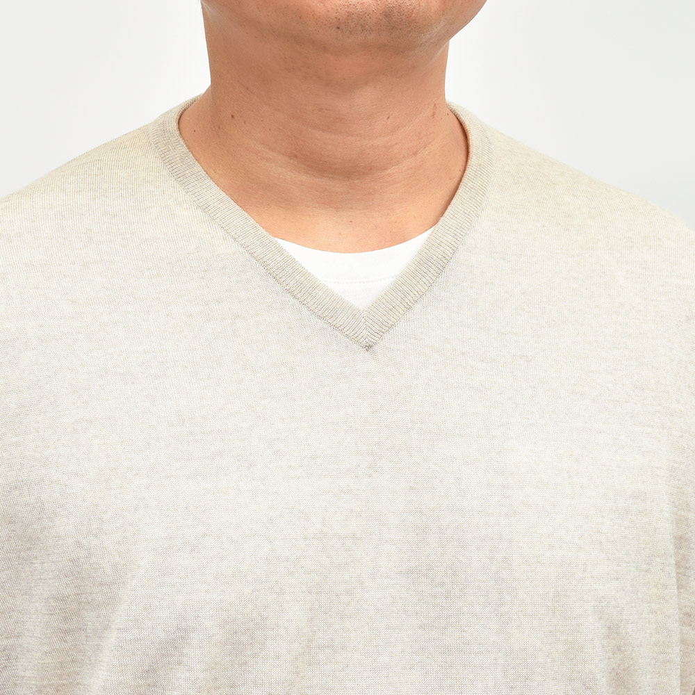 滑らかで仄かな光沢感を放ち、非常に手触りの良いエクストラファインメリノウールを使用した、定番ハイゲージの30ゲージシリーズ。やや透け感のあるハイゲージは、ジャケットなどのインナー使いは勿論のこと、サイズ感を少しゆったりめにすれば一枚で着用しても雰囲気のあるスタイルになります。JOHN SMEDLEYでは定番のVネックニットモデル“PACKHAM”は、シャツとの重ね着は勿論、Tシャツの上に着ても上品なカジュアルスタイルを作り上げてくれます。