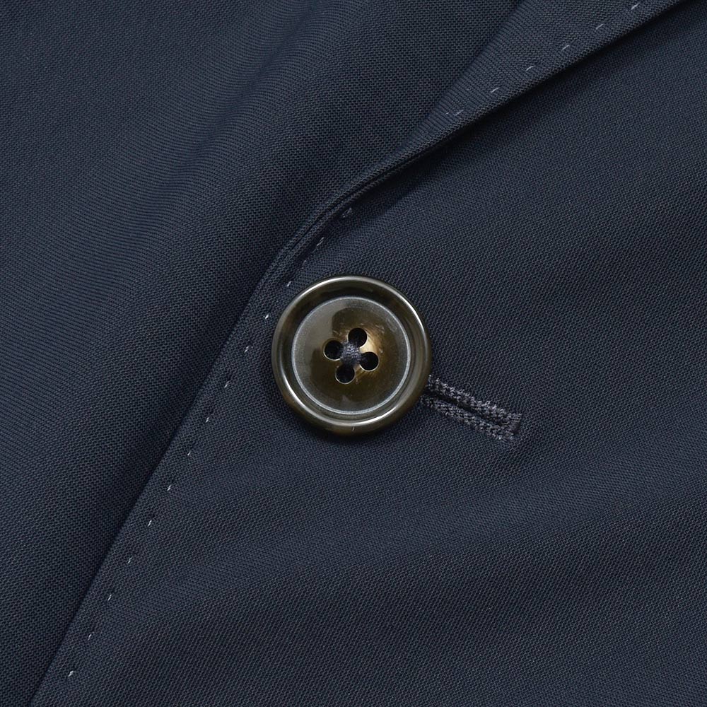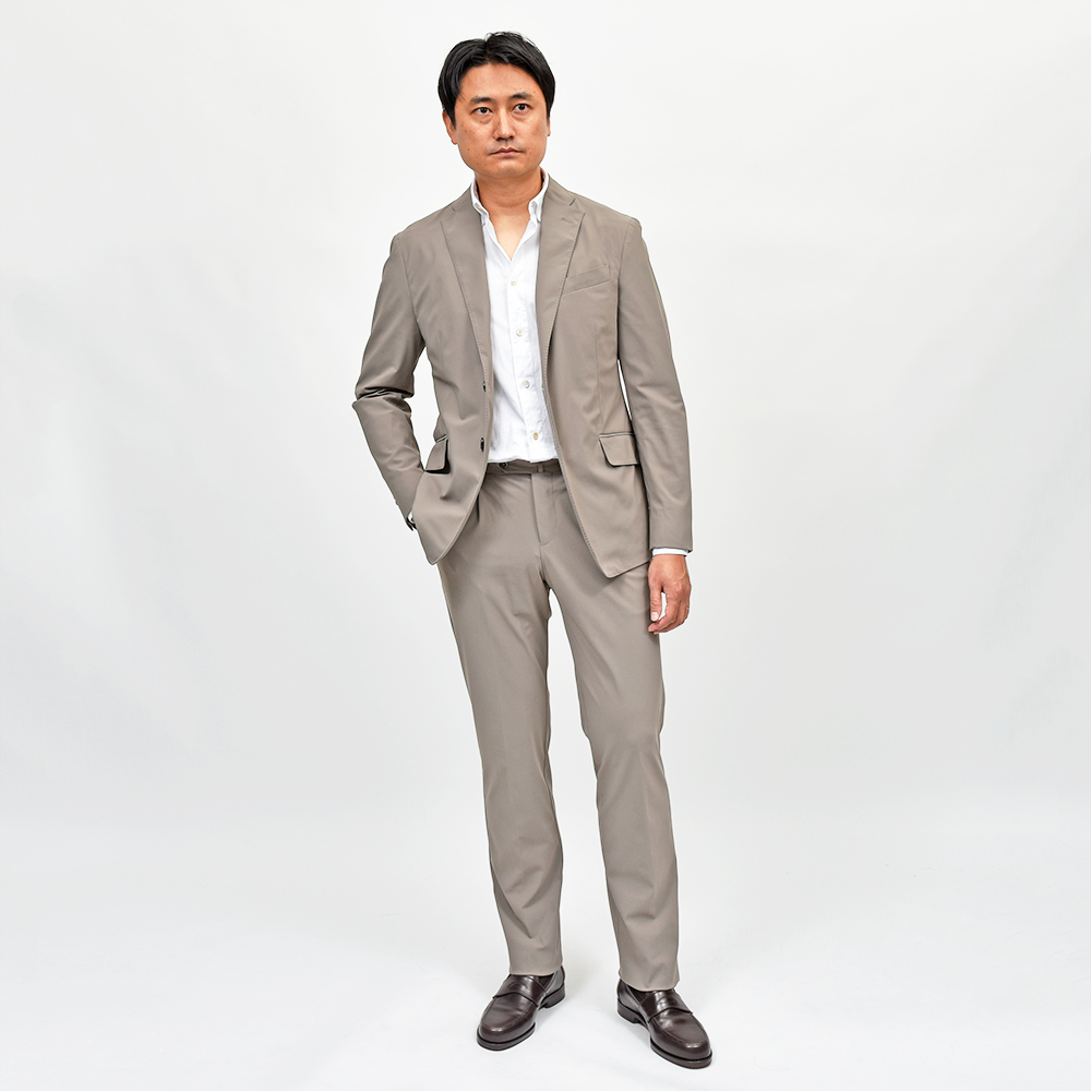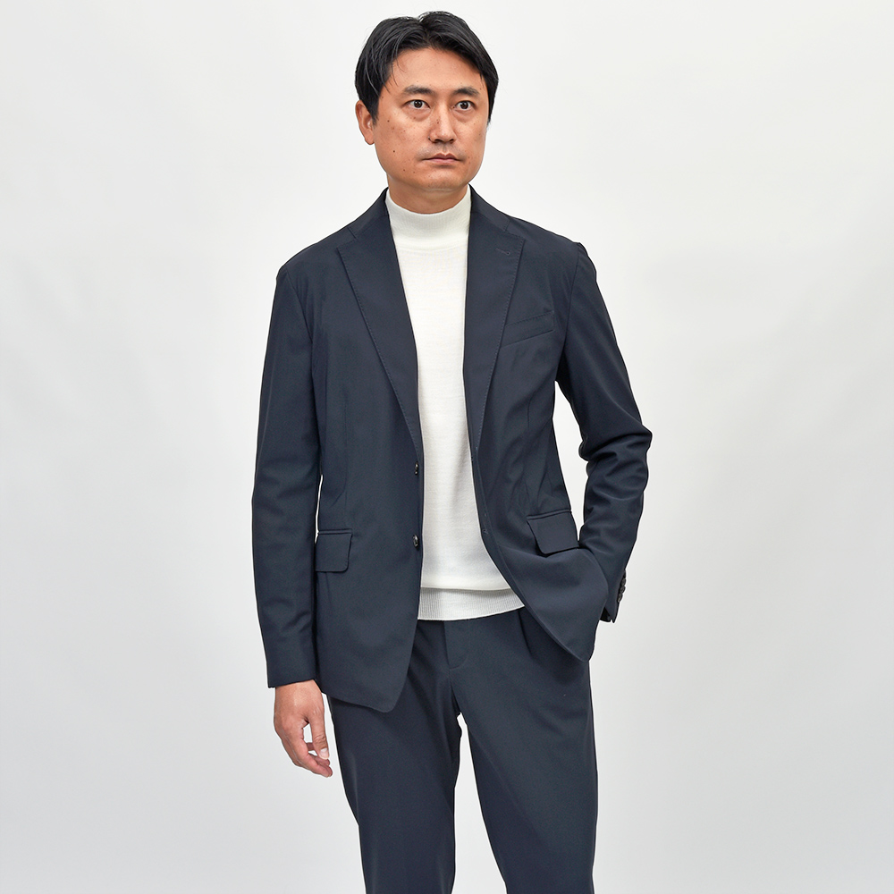モデルは2つボタンにシングルジャケット。広すぎないモダンな印象のラペル幅に、フラップポケットと袖の本切羽仕上げは本格的なジャケットの仕立てです。