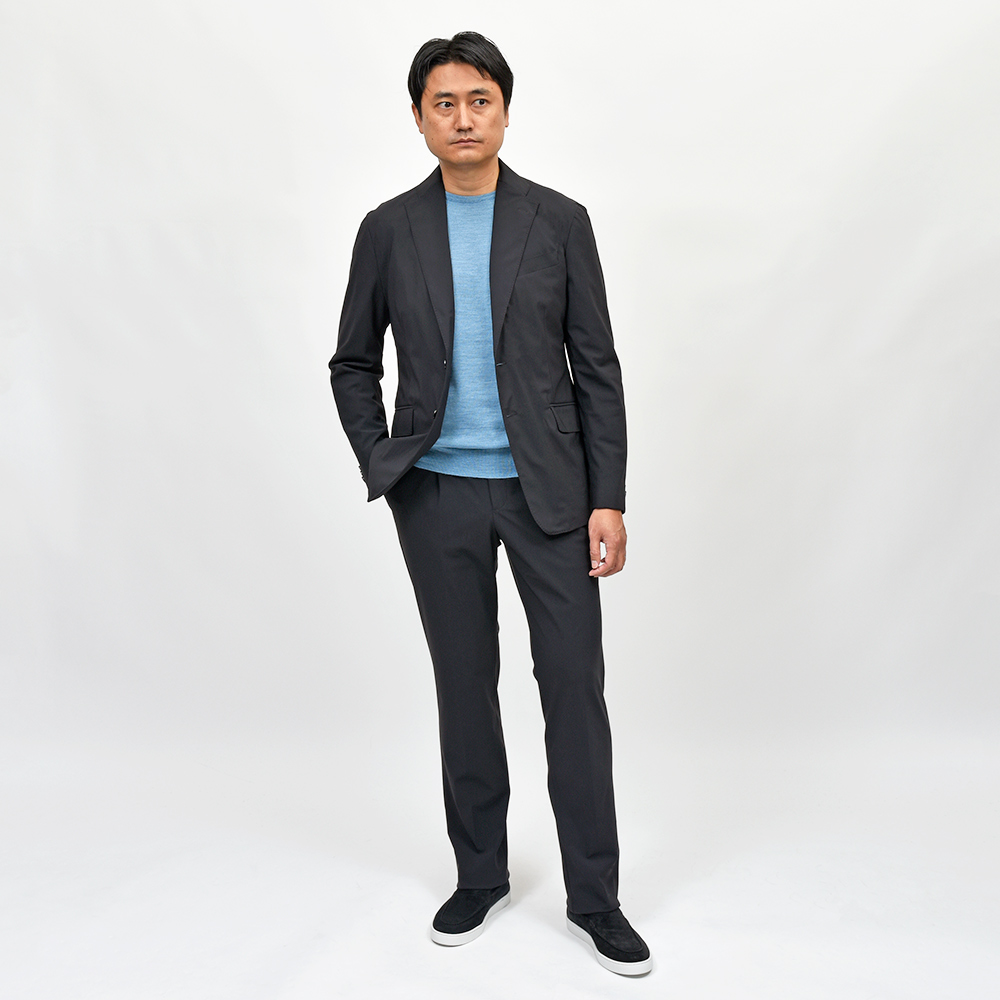 (画像のスタッフは182cm76kgでダークネイビー・ブラックはサイズ50を、グレーベージュはサイズ48を着用しています。