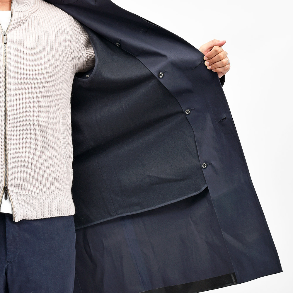 言わずと知れたMACKINTOSHのゴム引き生地は、二枚の生地の間に天然ゴムを塗り圧着することで高い防水性と防風性を持ちます。また、全ての縫い目の裏側には職人の手作業によって止水テープが貼られており、それによって完全な防水のコートを作り上げることができます。