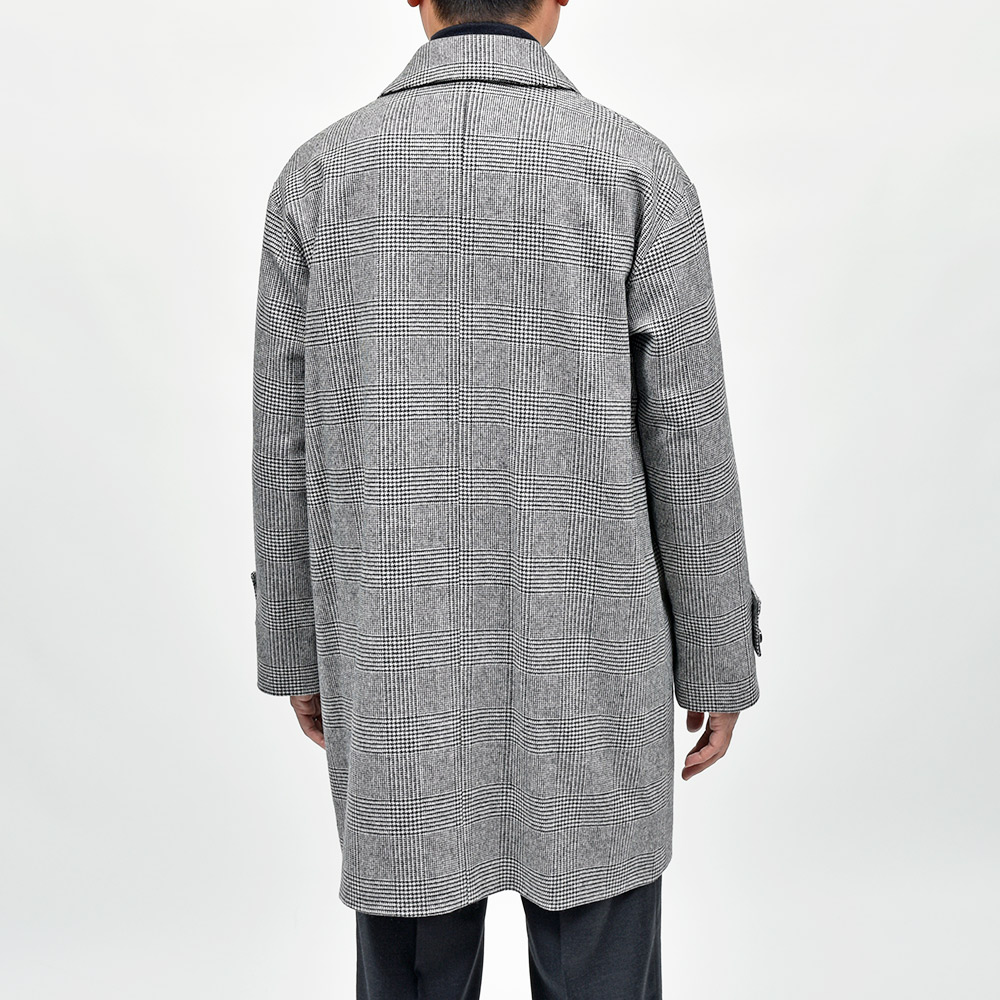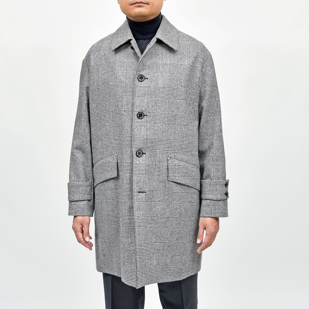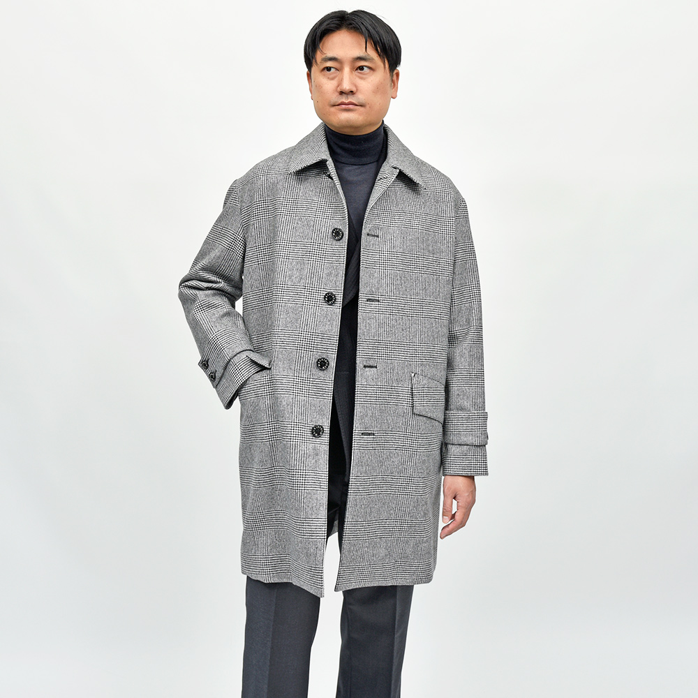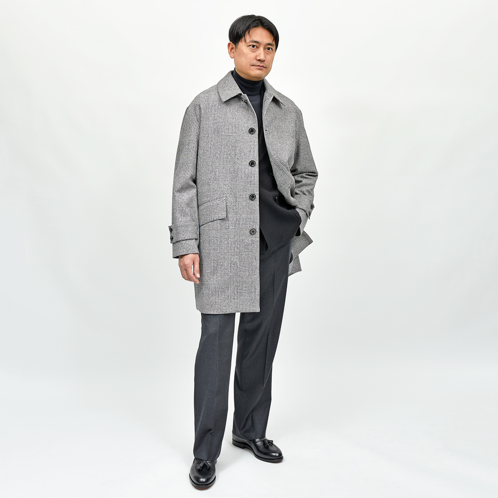 メリノウールを使用した滑らかでドレープ感が美しいライトフランネル生地。柔らかでありながらも張りのあるタッチが上品な佇まいを生んでいます。また、ブラック×ホワイトのグレンチェック柄は、オーセンティックな印象がモダンなサイズ感のコートをリアリティのある雰囲気にしてくれます。