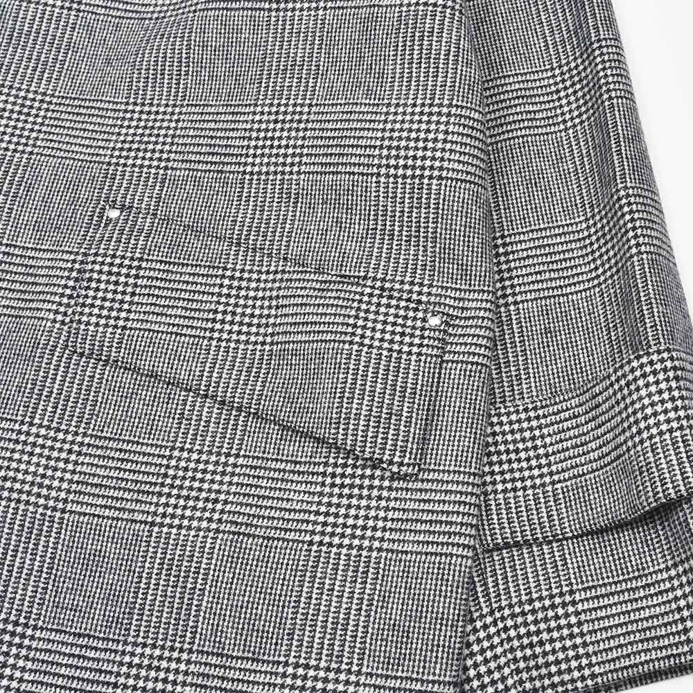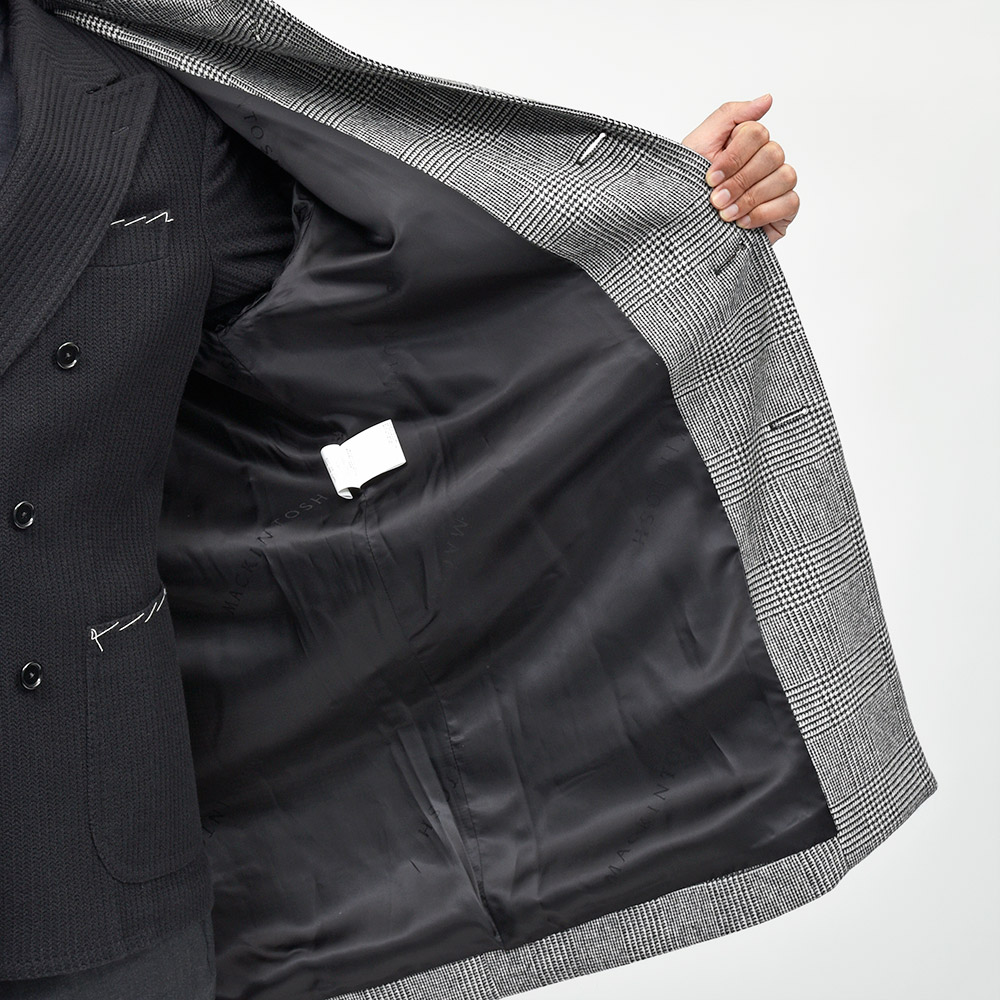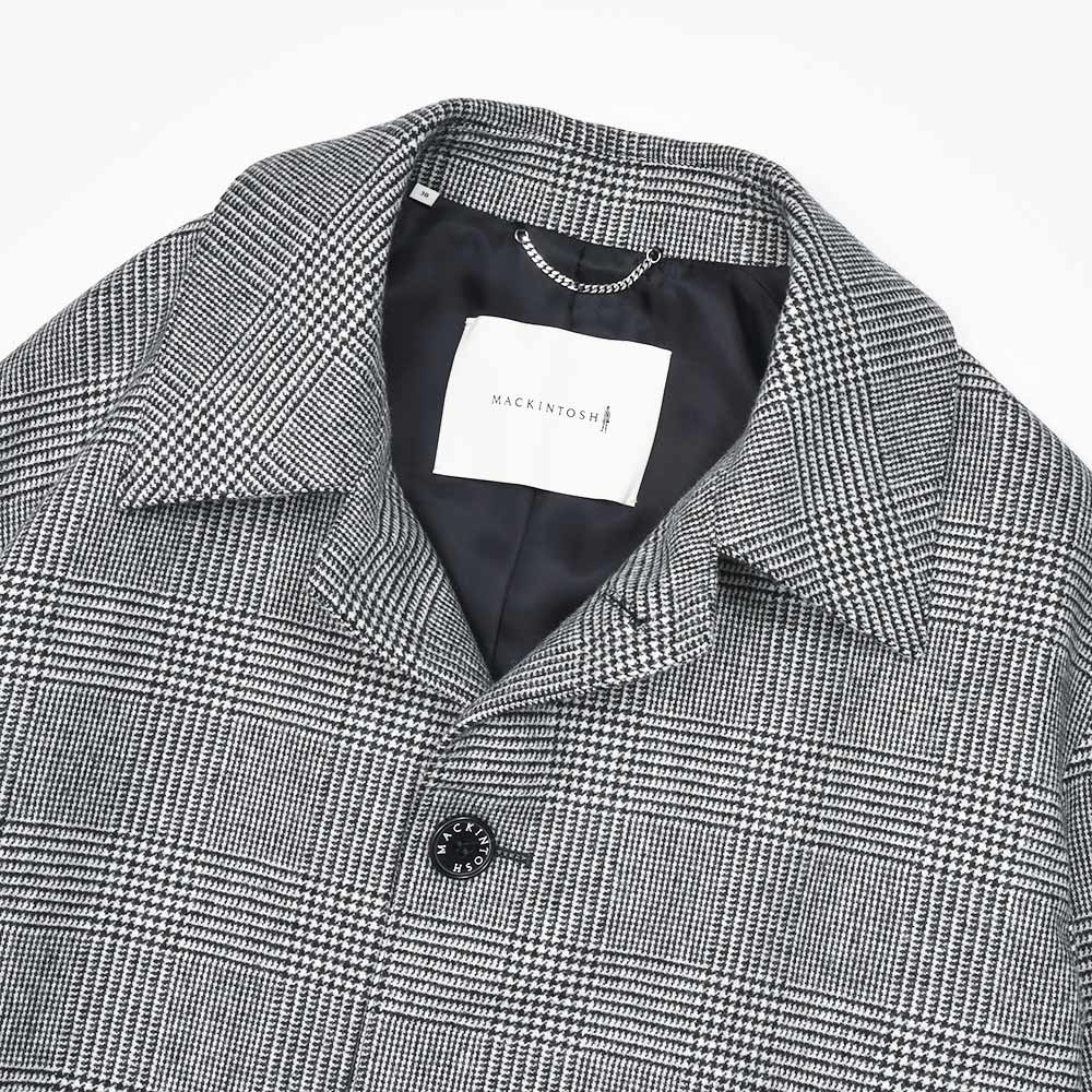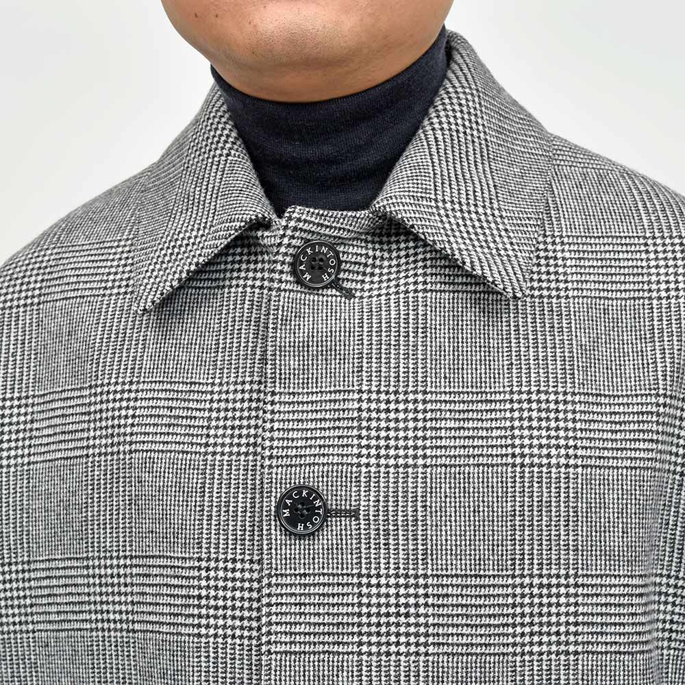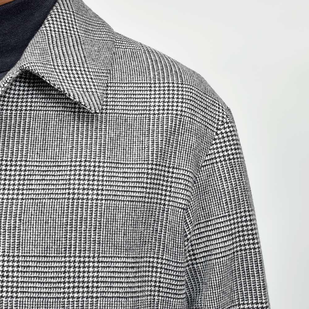 メリノウールを使用した滑らかでドレープ感が美しいライトフランネル生地。柔らかでありながらも張りのあるタッチが上品な佇まいを生んでいます。また、ブラック×ホワイトのグレンチェック柄は、オーセンティックな印象がモダンなサイズ感のコートをリアリティのある雰囲気にしてくれます。