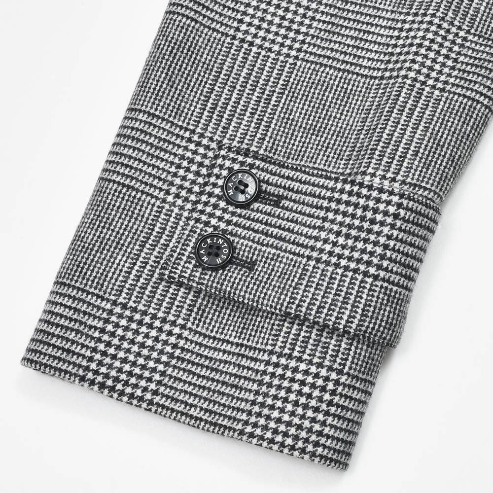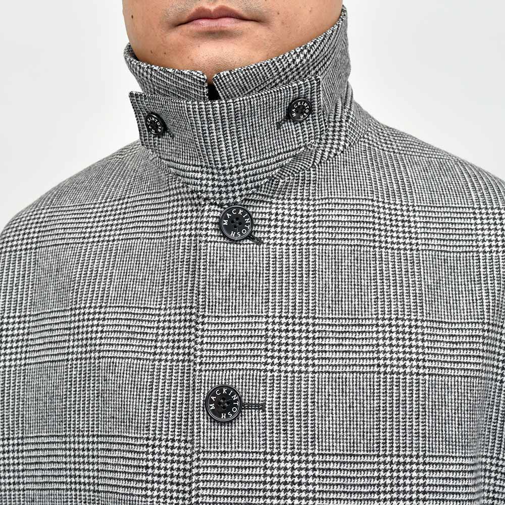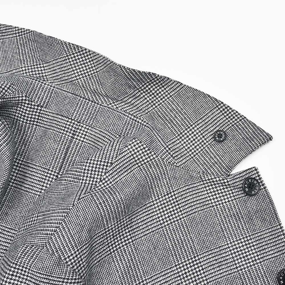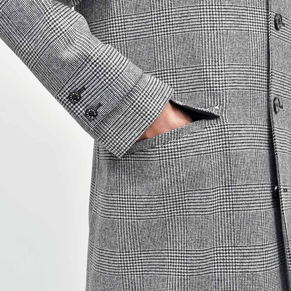メリノウールを使用した滑らかでドレープ感が美しいライトフランネル生地。柔らかでありながらも張りのあるタッチが上品な佇まいを生んでいます。また、ブラック×ホワイトのグレンチェック柄は、オーセンティックな印象がモダンなサイズ感のコートをリアリティのある雰囲気にしてくれます。
