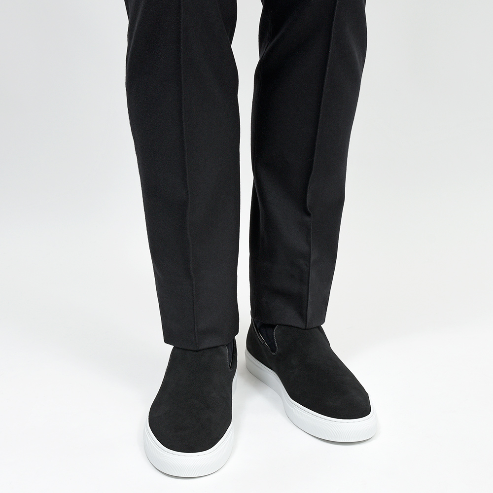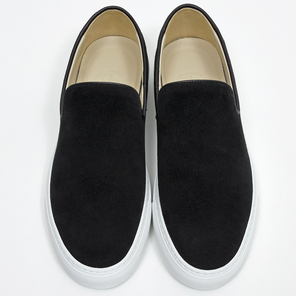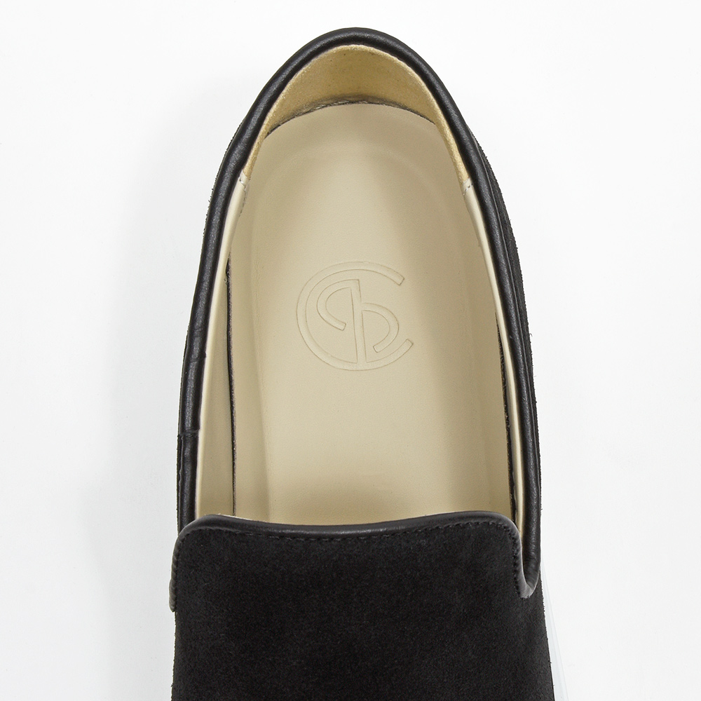 アッパーに使用されている上質なカーフスエードは勿論、インナーレザーや天然ゴムを使用したソールに至るまで、全てイタリア製の素材を使用しています。また、インソールにはクッションを何層にも重ねることで土踏まずのアーチをサポートし、高級紳士靴に使用されるシャンク入りのアウトソールを採用することで、包まれるような履き心地と安定感を実現。スウェーデンのストックホルムでデザインされたC.QPは、世界屈指のハイブランドのスニーカーを請け負うポルトガルの工房で、熟練の職人がハンドメイドで作り上げています。上質な素材と卓越した技術によって、このC.QPらしいラグジュアリーな雰囲気が生み出されています。