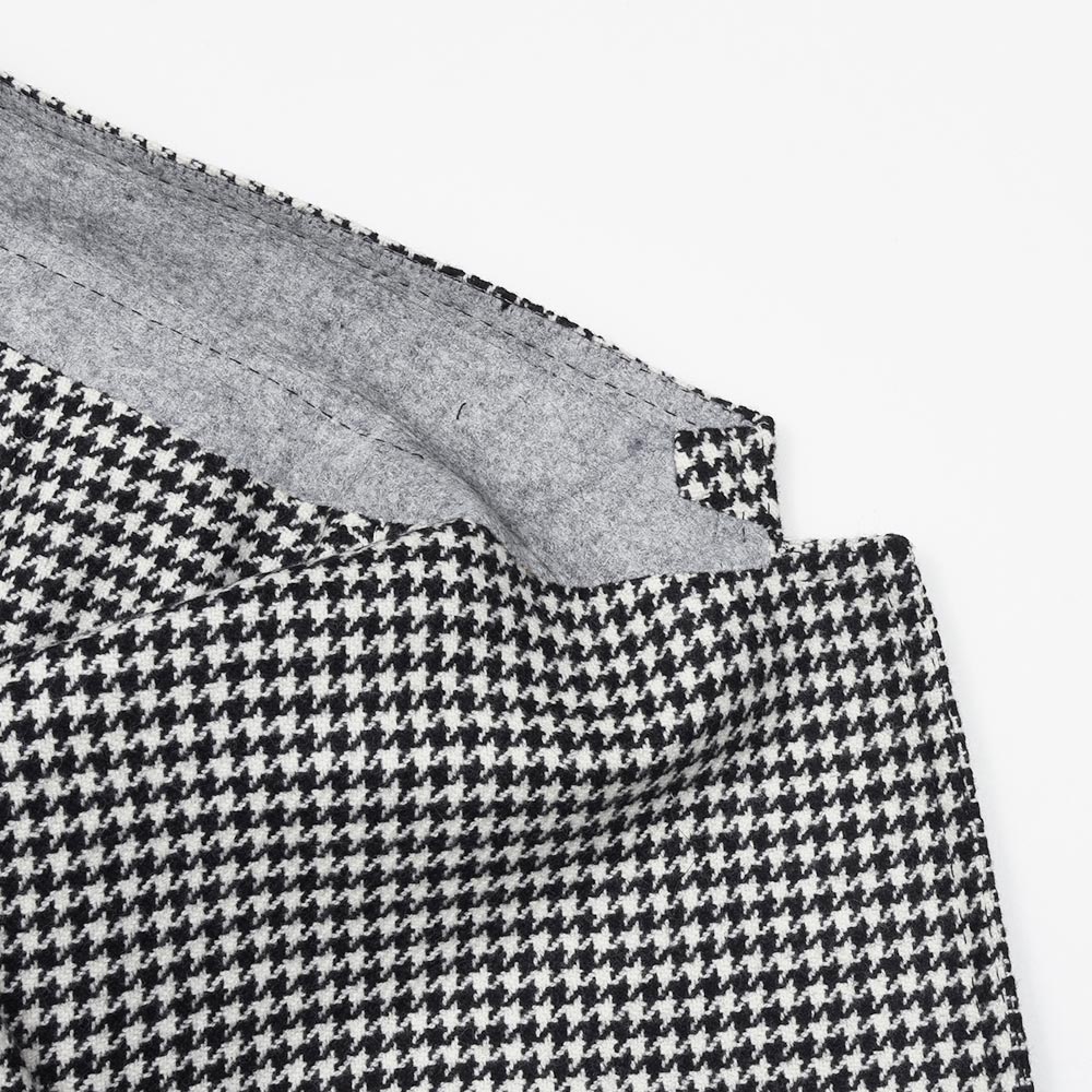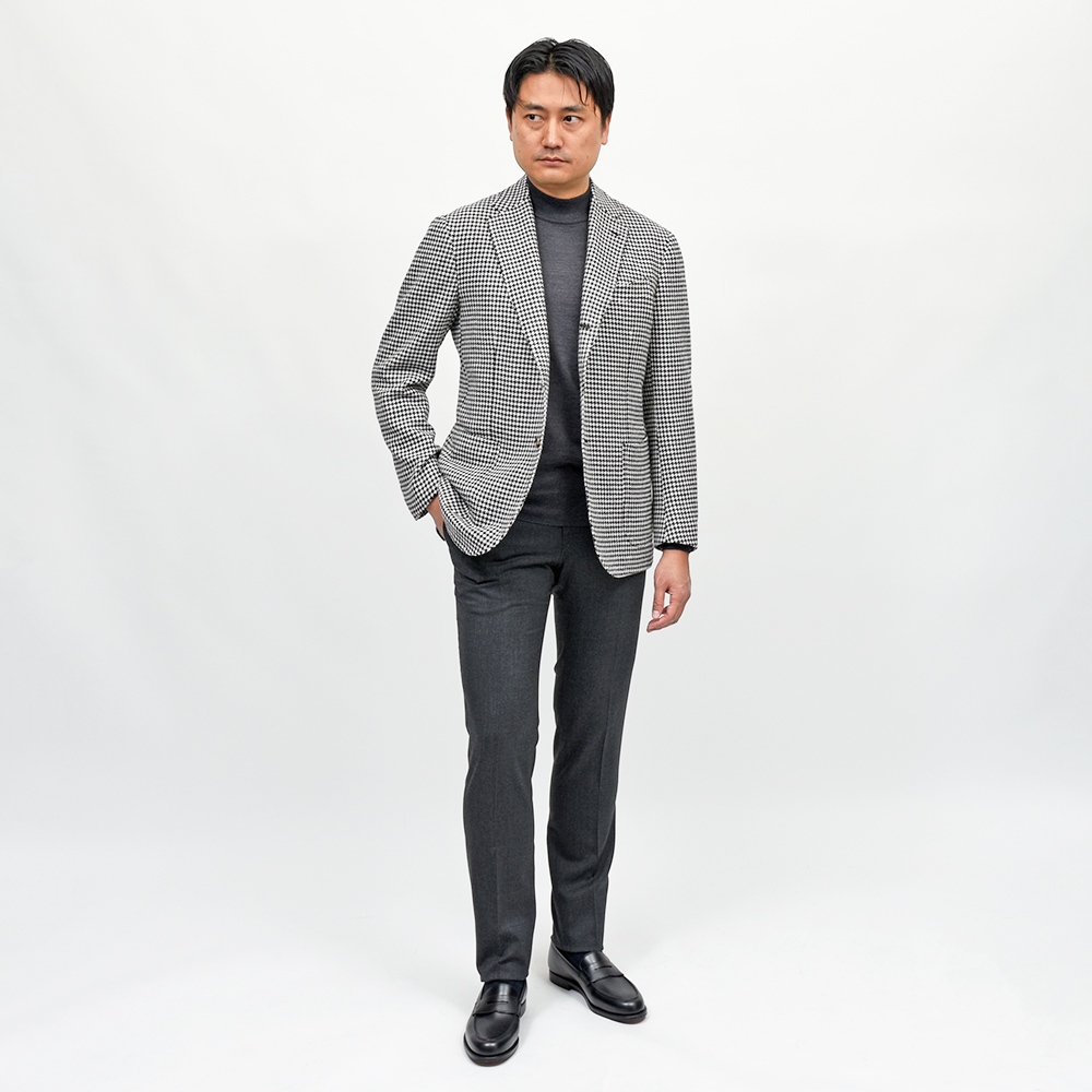 ツイード調の見た目ですが、目付け310gと秋冬素材ではやや軽いウエイトのハウンドトゥース。起毛感はありながらも目付けが軽いため、昨今の気候が加味された一着となっています。ブラック×ホワイトのハウンドトゥースは、何とも言えないモダンな色気を香らせています。