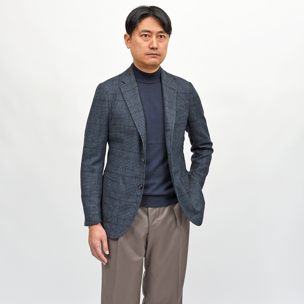 秋冬ではやや軽い目付け290gのグレンチェックジャケットは、ヴァージンウール×カシミヤの贅沢な素材使い。ヴァージンウールの滑らかな光沢感に、カシミヤのふんわりと柔らかなタッチがクラス感のある佇まいです。また、副資材をほとんど省いた段返り3つボタンシングルジャケットのニューモデル“GINZA”を採用。裏地も袖裏のみと非常に軽やかでありながらも、アンコンジャケットとは思えないエレガントな姿を作り上げてくれます。