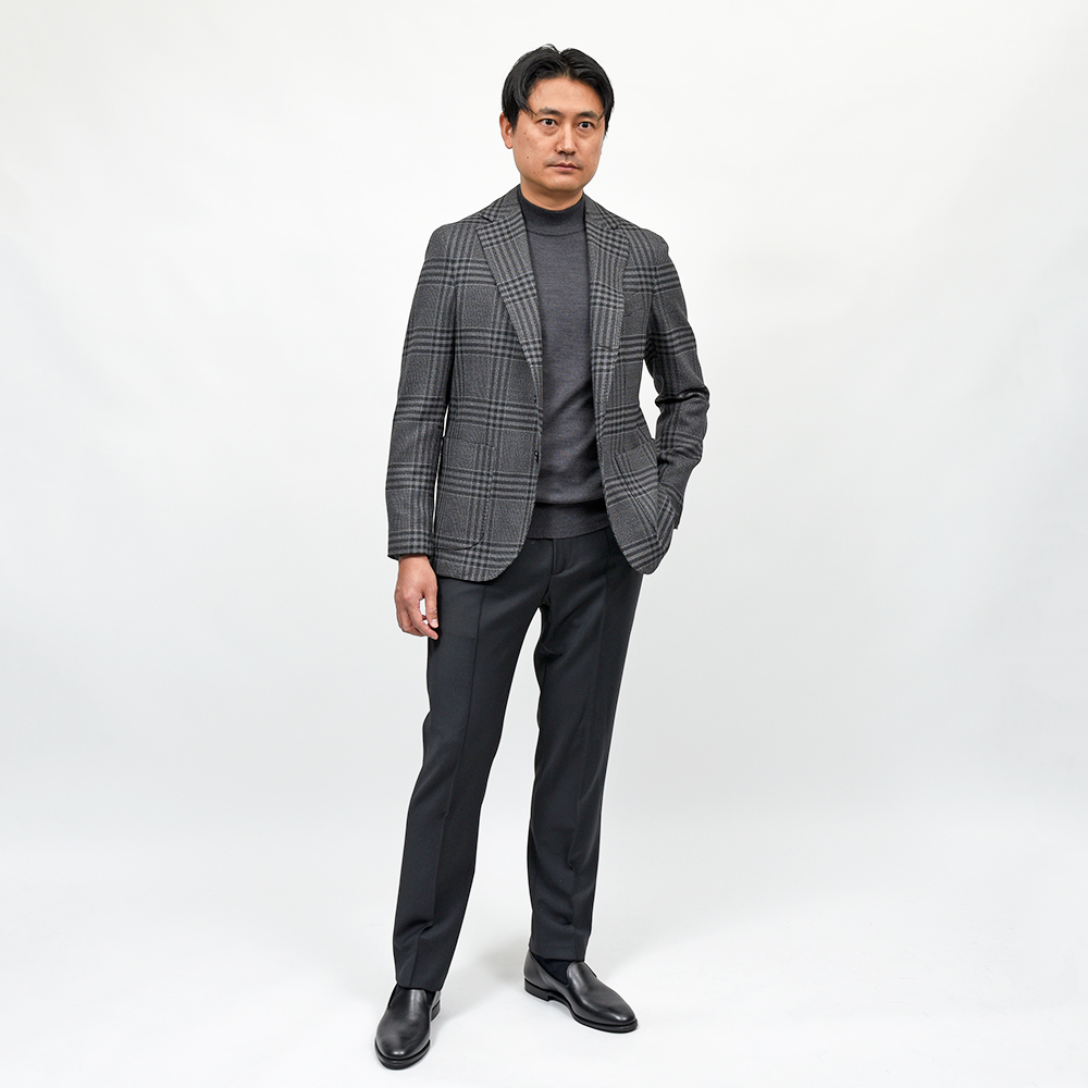 目付け395gのウール素材を使用したグレンチェックジャケット。少しドライなタッチのファブリックを使用しており、真夏以外の3シーズンで着用することができます。また、ほのかなストレッチ性に、グレー×ブラックのグレンチェックはシックな印象でモダンな佇まいを生んでいます。