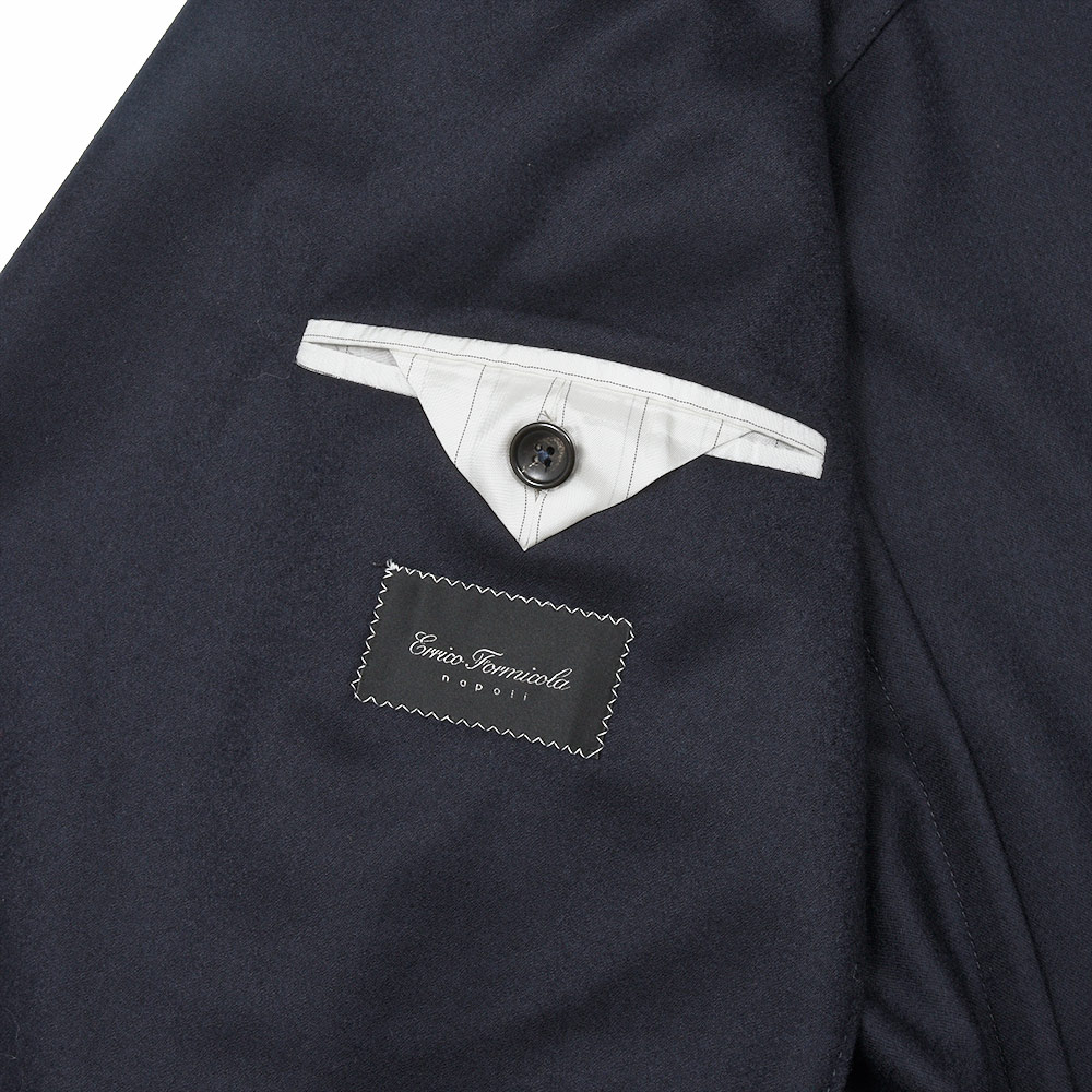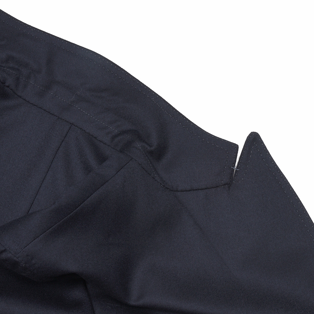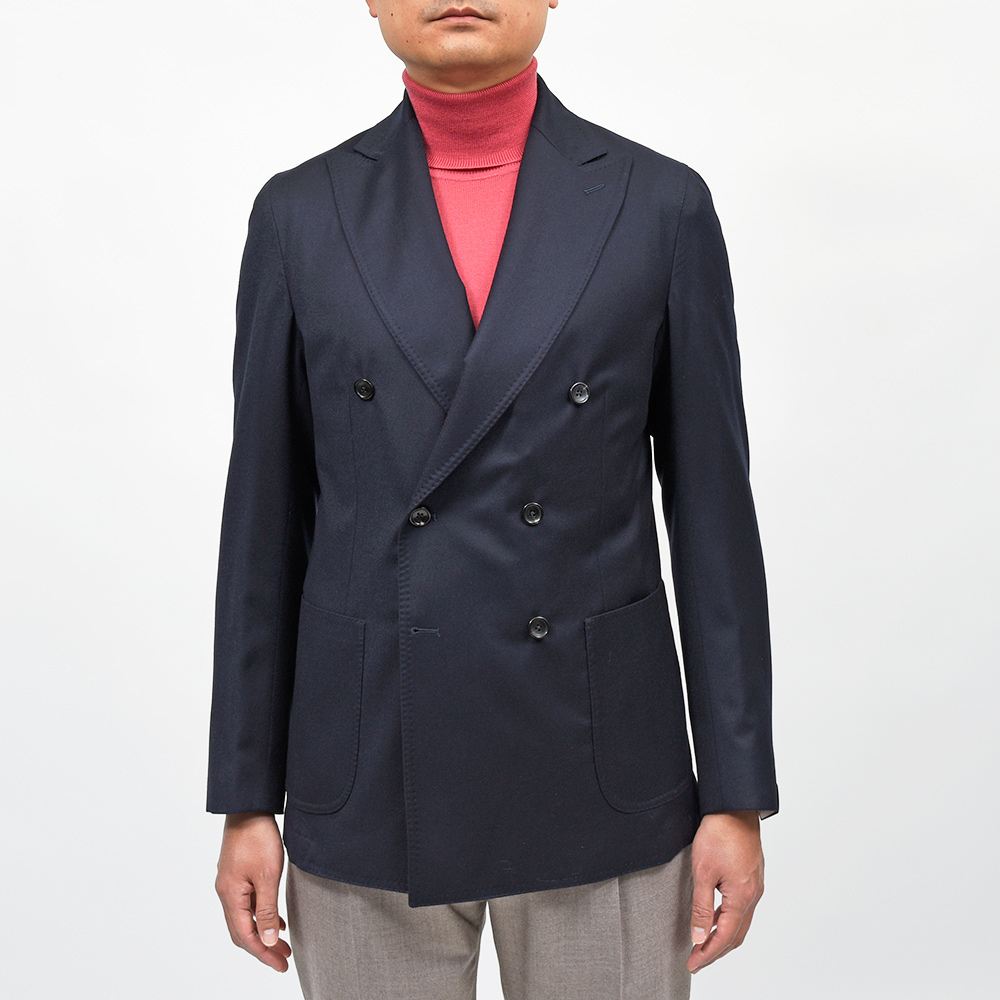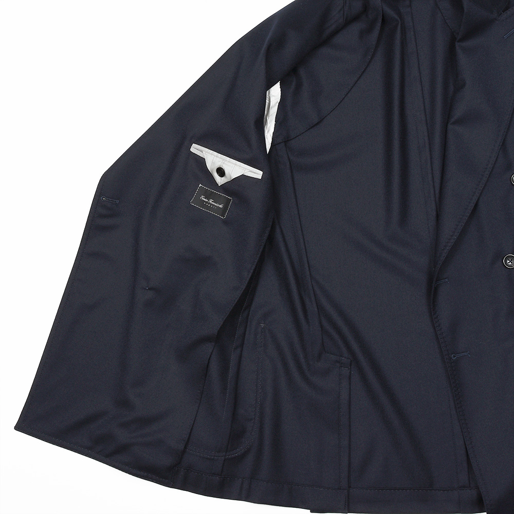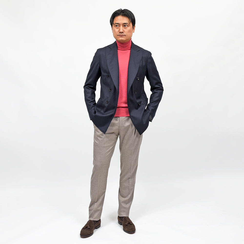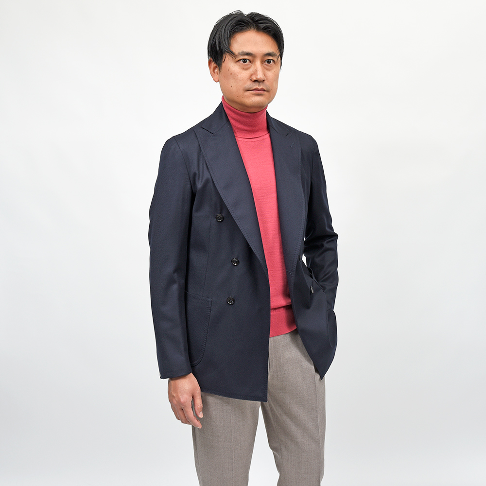 秋冬生地では軽い目付けのウールサキソニーは、カシミヤを混紡することで非常に滑らかで柔らかな質感。少しストレッチ性がありウエイトも軽く、起毛感もほどほどなので、秋口から春先まで活躍してくれる一着です。また、しなやかな生地感による美しいドレープも見逃せません。
