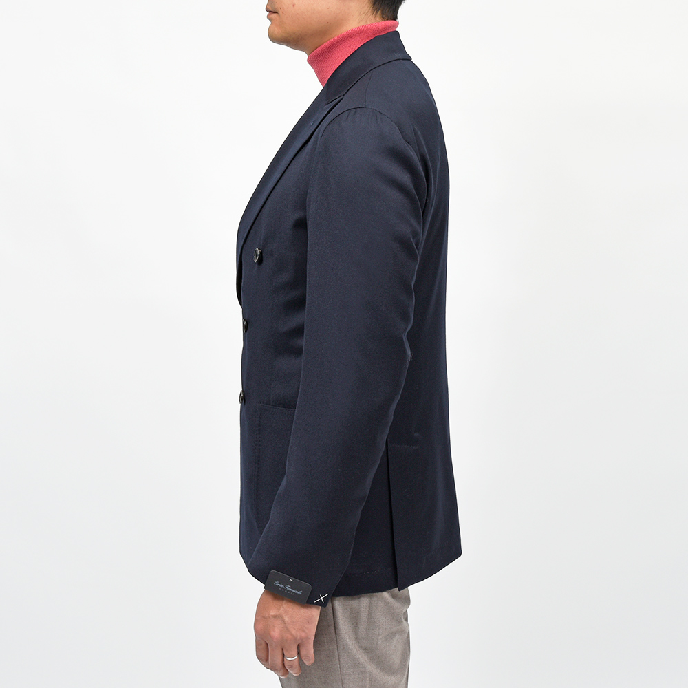 スタンダードなフィッティングが魅力のダブルブレストモデル“MARCO DP”。太過ぎず細過ぎないモダンな表情のラペル幅に、ドロップ7のクラシカルなスリムシルエットになります。一部接着芯を使用したアンコン仕立ての軽やかな着心地でありながらも、程よくドレスライクに見える仕立ての良さを感じることができます。