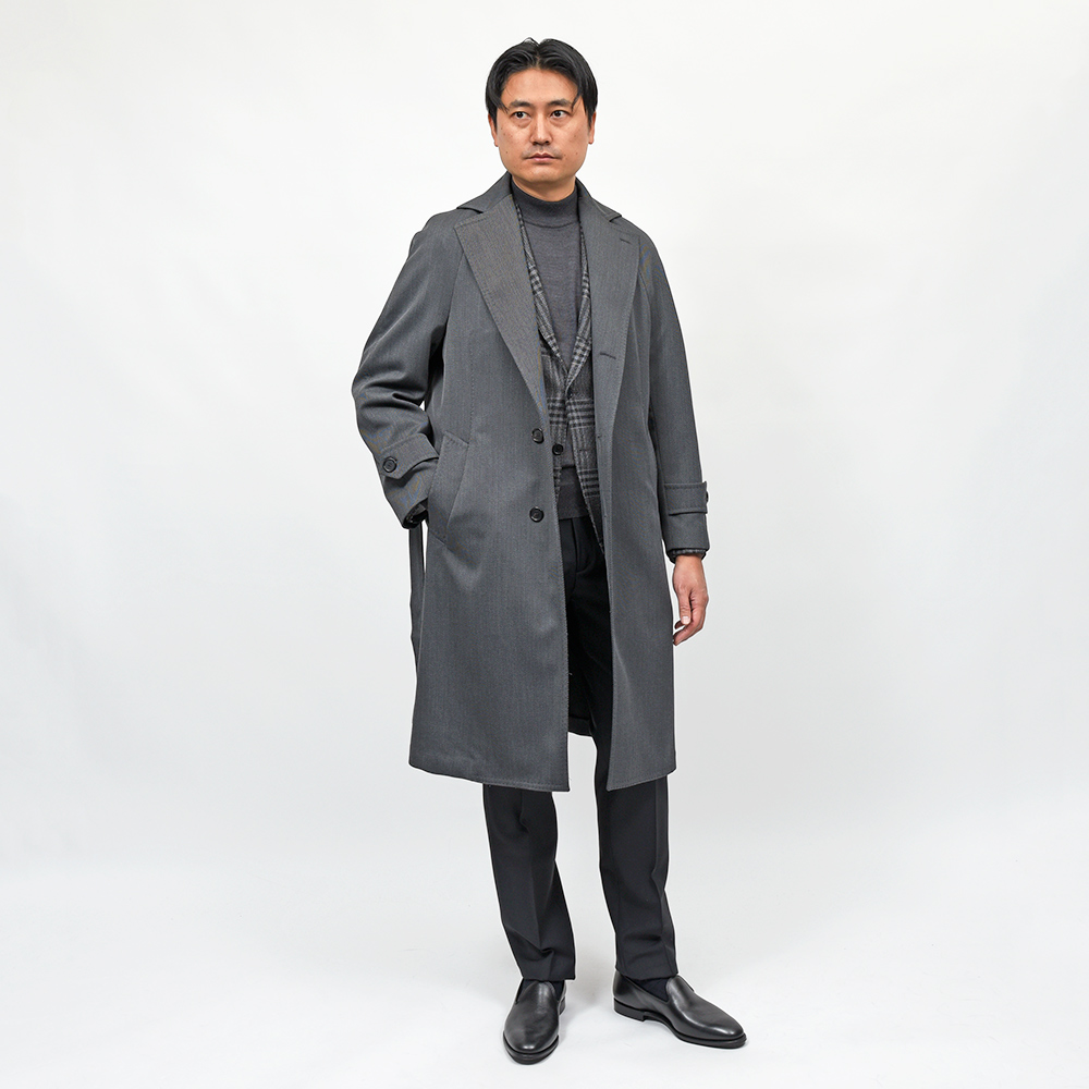 こちらのラグランスリーブコートは、いつも通りのサイズを着るとオーバーサイズシルエット。ワンサイズ落とすとややドレスライクなキレイめにも着れるシルエットになります。袖は可動域を確保した3枚はぎ仕立て、さらにラグランスリーブで一番の難所である肩付けは非常に美しく、そしてナチュラルな落ち感に仕上げた秀逸なモデルになります。