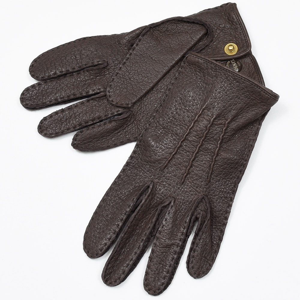 高級とされるペッカリーレザーを使用。ペッカリーレザーといえば”DENTSのグローブ”と言われるほどの代名詞となっています。ペッカリーレザーは軽くて丈夫、摩擦にも強く通気性も良い革と言われ、着用してみると伸縮性に優れ独特の柔らかさと風合いがあります。これは他の革では決して真似する事が出来ず、感覚の鋭い人間の手で使用するグローブに最も適した素材はペッカリーとゆう結論に至ります。 DENTSにのみ許されたフィット感は、マスターカッターと言われる熟練の職人による技術と経験によるところが大きく、DENTSのグローブが『第二の皮膚』と云われる所以がそこにあります。