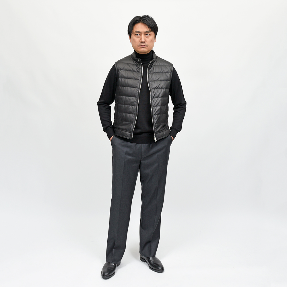 サイズ48でジャストサイズです。程よくゆとりのあるフィッティングで、細すぎず太すぎずちょうどいい感じです。滑らかなラムナッパを贅沢に使用したダウンベストです!