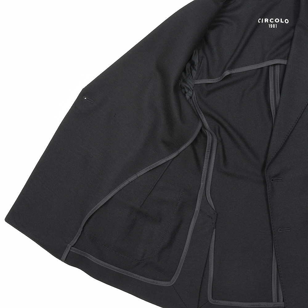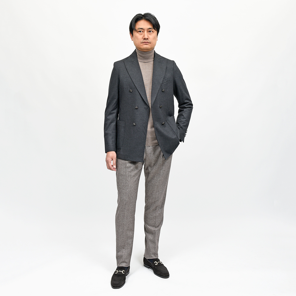 少し起毛感を持たせたヴァージンウール×カシミヤ素材は、非常にライトな生地感にヴァージンウールの滑らかと、カシミヤの柔らかさが合わさった高級感ある風合い。化学繊維を用いることなく、この風合いで伸縮性を持ったジャージー生地というのは、テキスタイルメーカーであるCIRCOLO 1901ならでは。