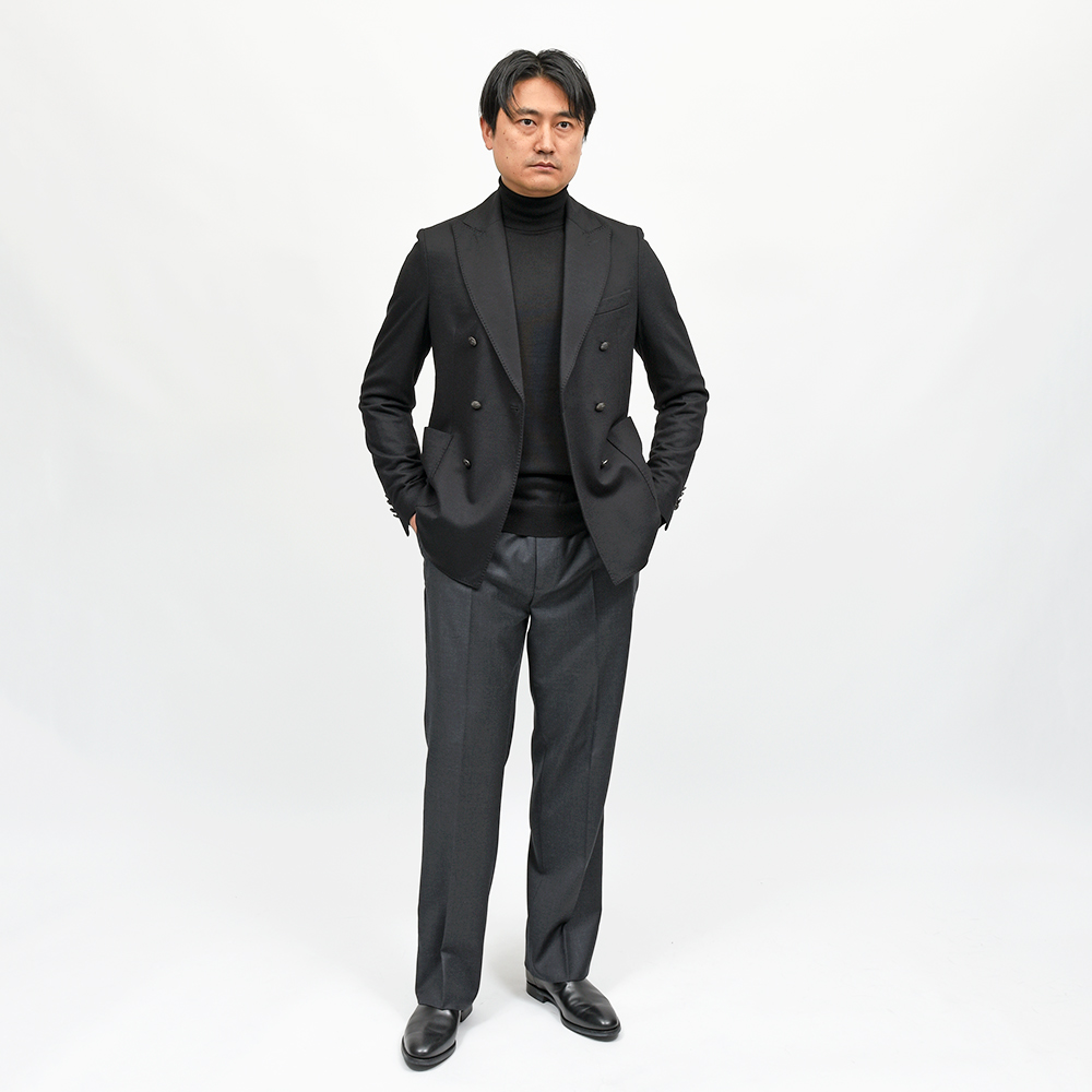 (画像のスタッフは182cm76kgでチャコールグレーはサイズ50を、ブラックはサイズ48を着用しています。