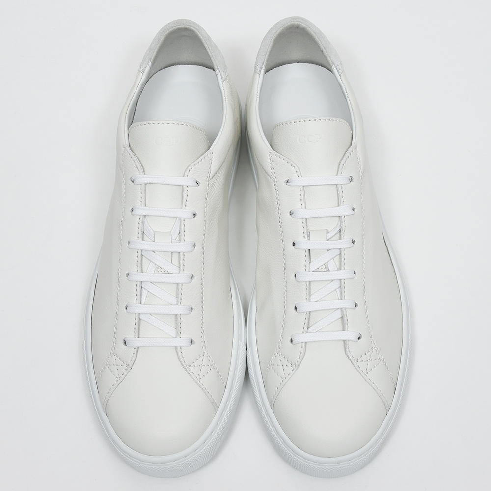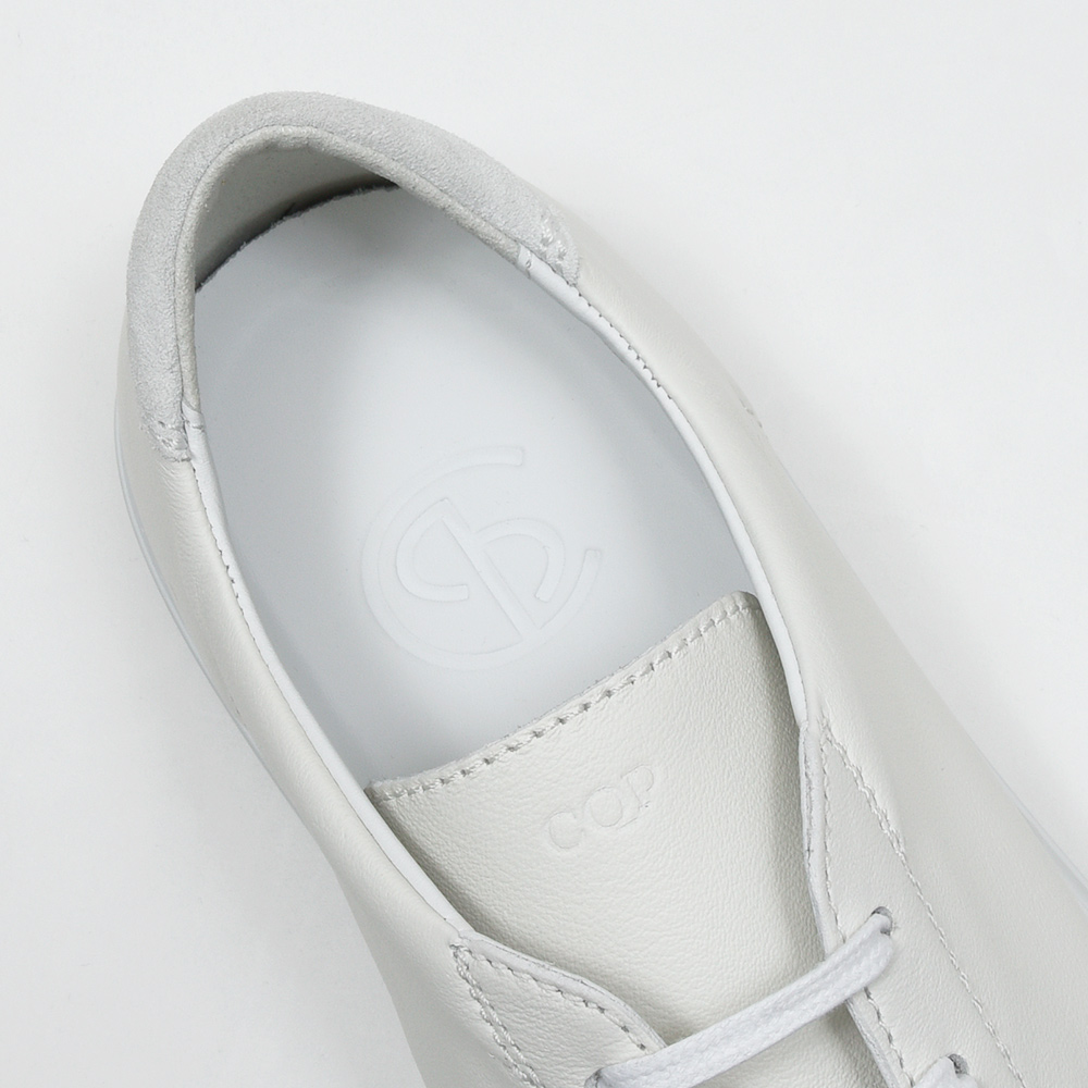 アッパーに使用されている上質なカーフレザーは勿論、インナーレザーや天然ゴムを使用したソールに至るまで、全てイタリア製の素材を使用しています。また、インソールにはクッションを何層にも重ねることで土踏まずのアーチをサポートし、高級紳士靴に使用されるシャンク入りのアウトソールを採用することで、包まれるような履き心地と安定感を実現。スウェーデンのストックホルムでデザインされたC.QPは、世界屈指のハイブランドのスニーカーを請け負うポルトガルの工房で、熟練の職人がハンドメイドで作り上げています。上質な素材と卓越した技術によって、このC.QPらしいラグジュアリーな雰囲気が生み出されています。