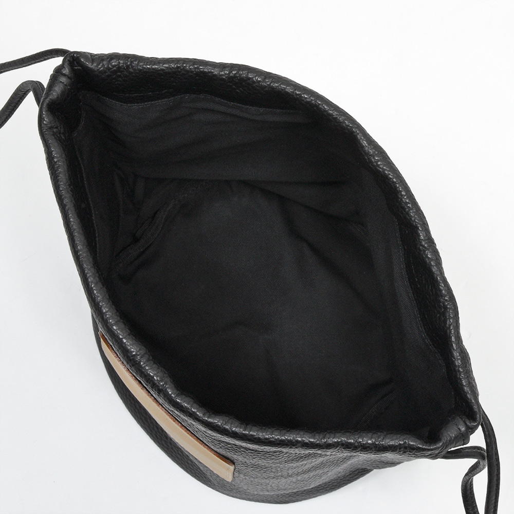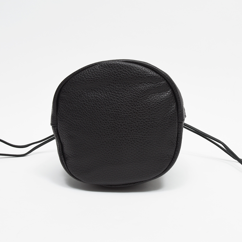 非常に柔らかなシュリンクレザーを使用した巾着型バッグ。ミニマルなデザインですが、上質な革の質感や、フロント部分にはちょっとしたポケットにもなっているブランドロゴが刻印されたレザーパーツがアクセントに。財布やスマートフォン、ハンカチなどの小物を入れても余裕のあるサイズ感は日常使いに打って付け。また、キズが付きにくいシュリンクレザーですので、デイリーユースで持ちやすいアイテムとなっています。