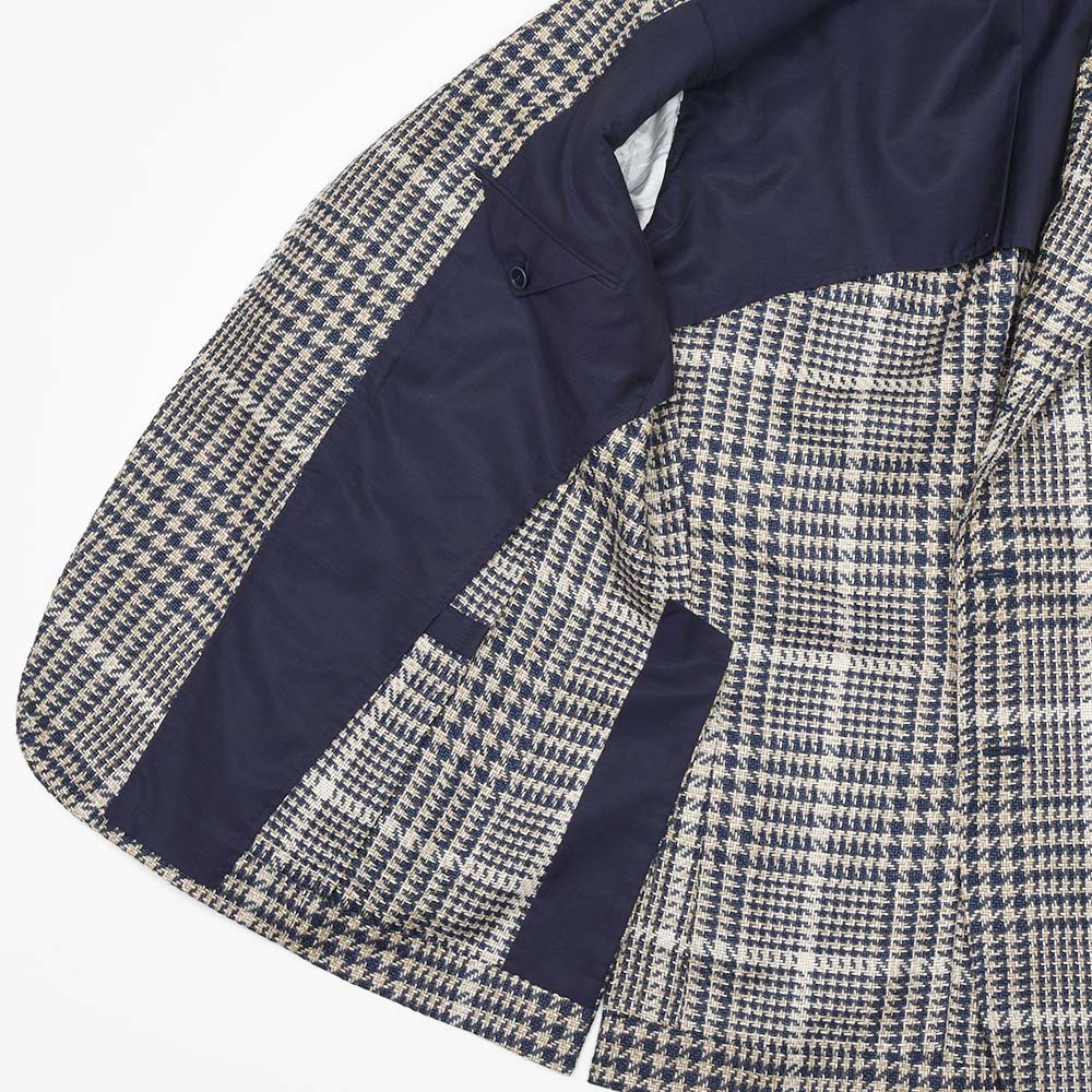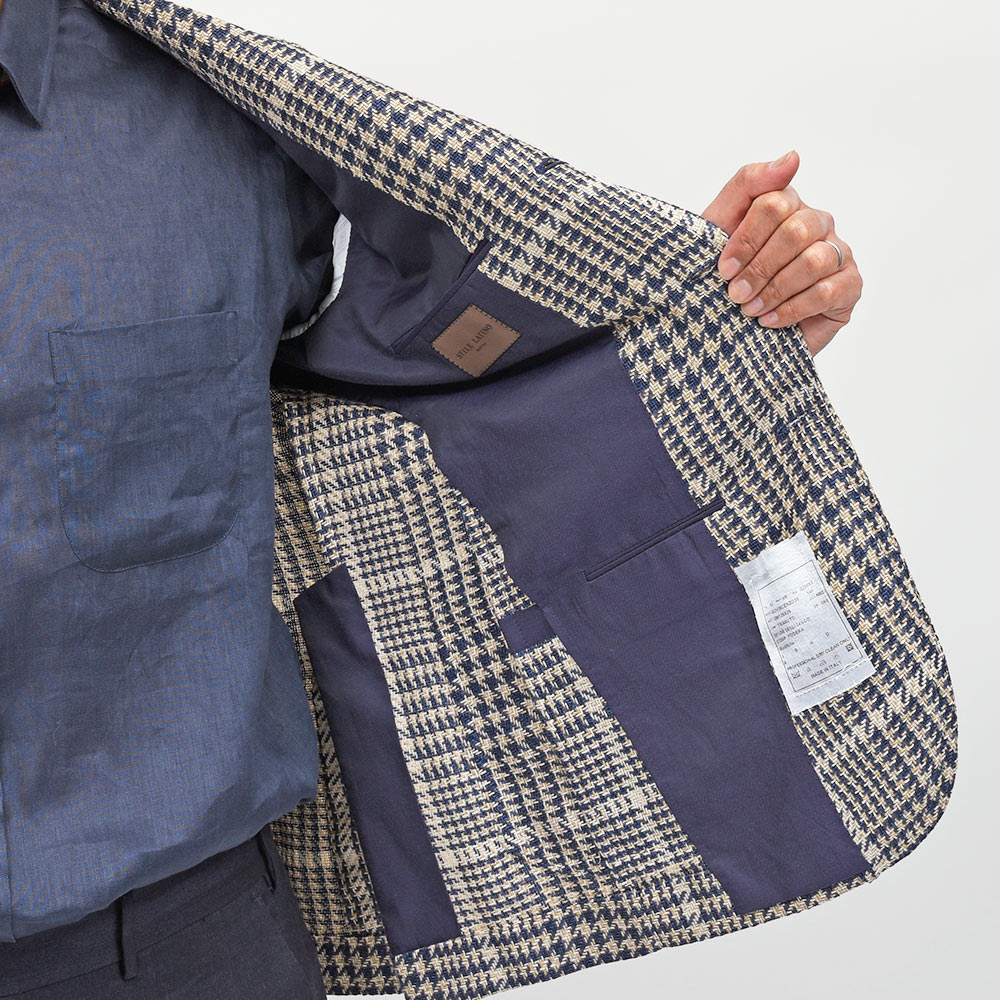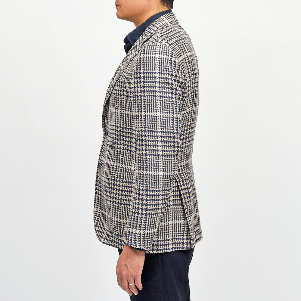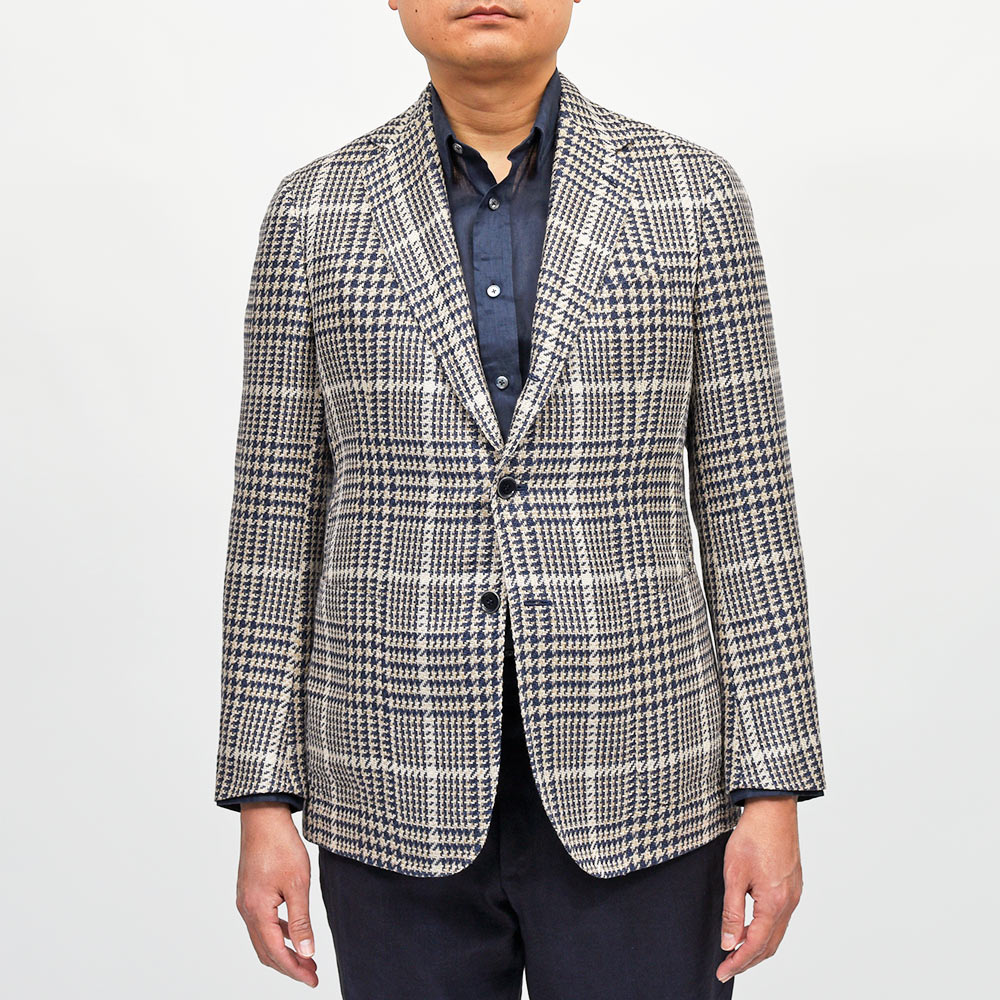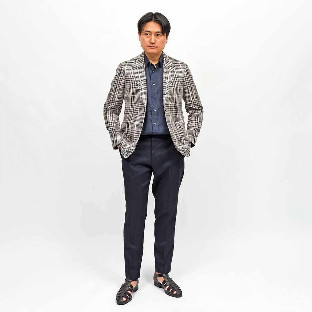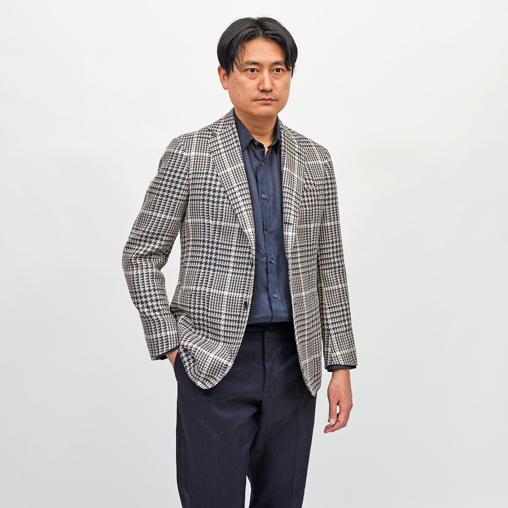 目付け280gのシルク×リネン×コットン素材を使用したグレンチェックジャケット。こちらは春夏にピッタリなドライなタッチの質感を持つ、STILE LATINOのエクスクルーシブファブリックになります。シルクの艶感とリネンの清涼感、コットンのしなやかさを持ち合わせており、シワが入りにくい質感が特徴です。ブラウンベージュとダークネイビーのグレンチェックに、ベージュのオーバーペーン。このどこにもない色合わせは、ヴィンチェンツォ氏らしい一着と言えます。