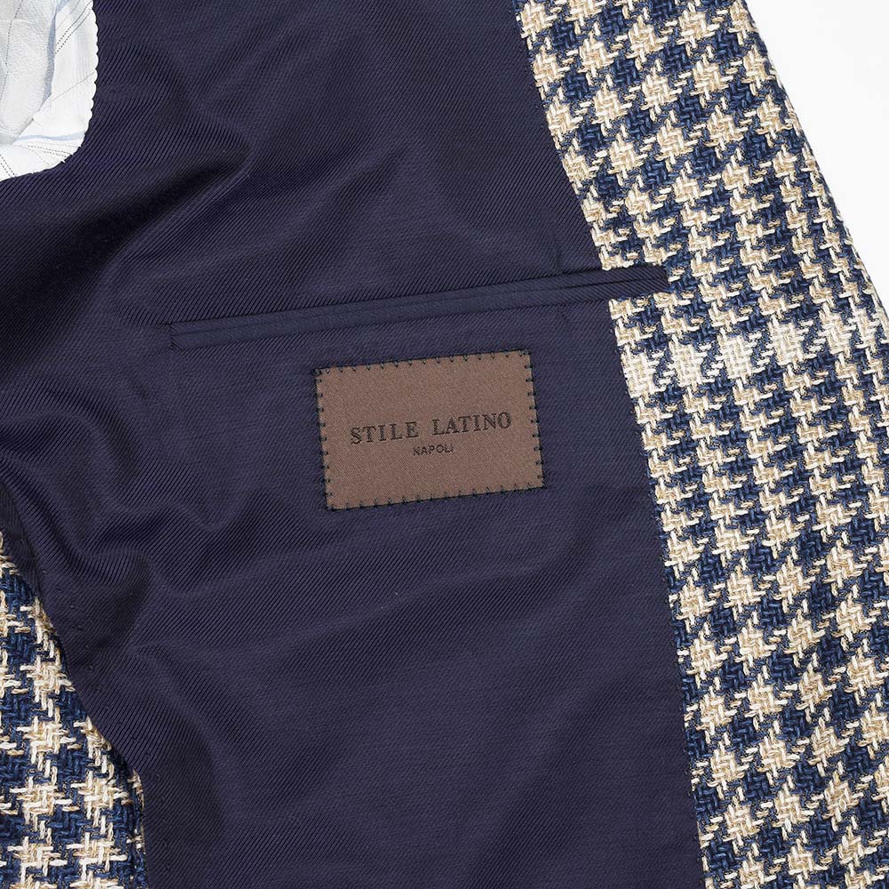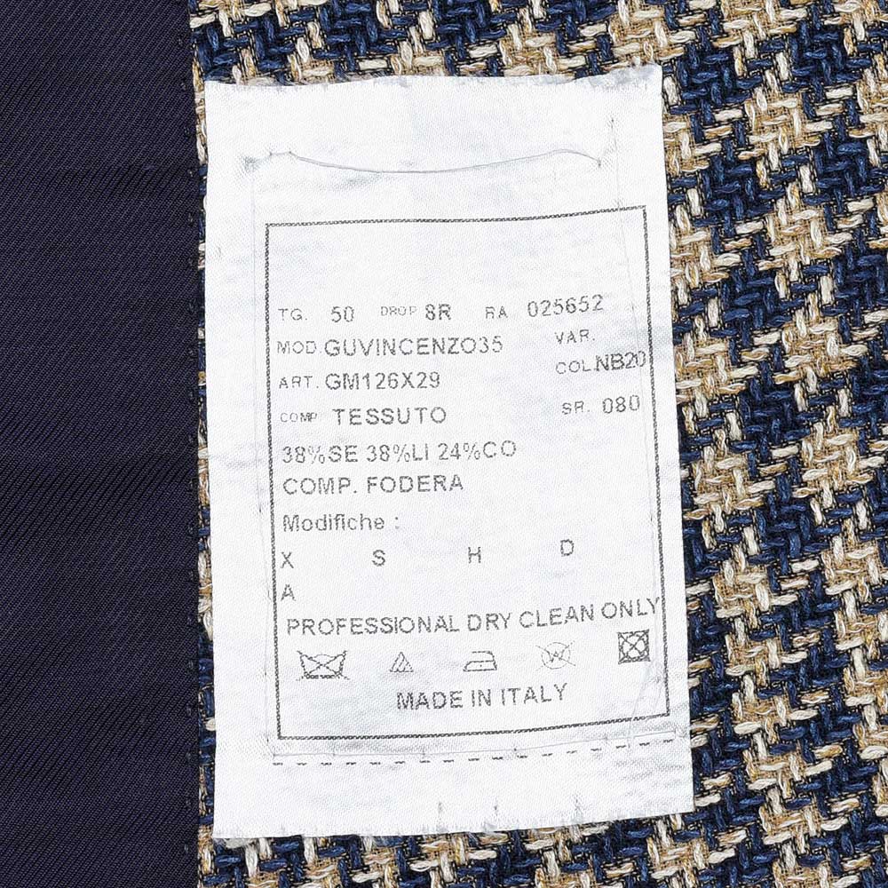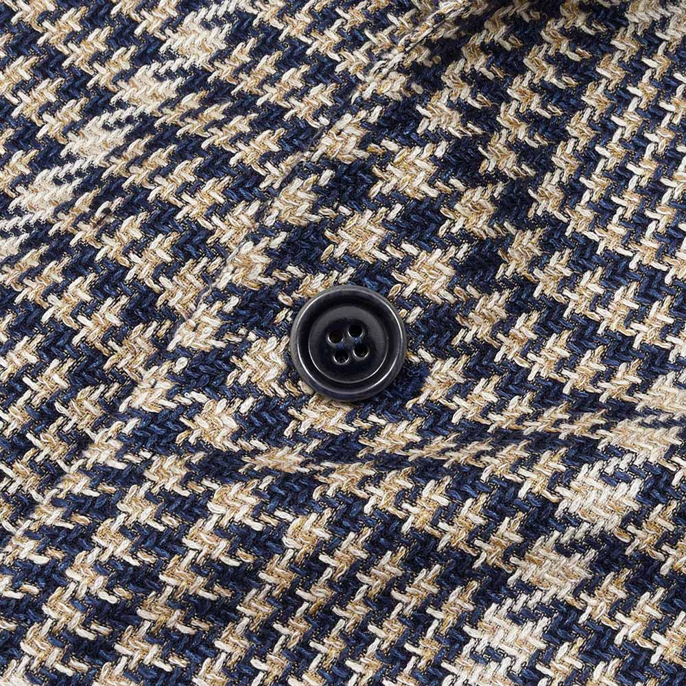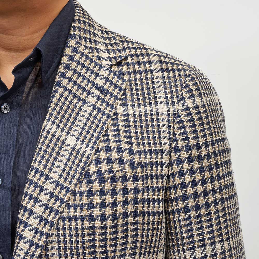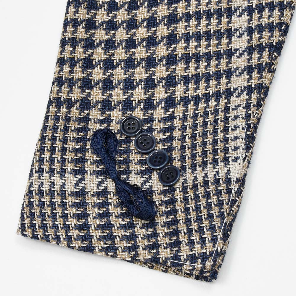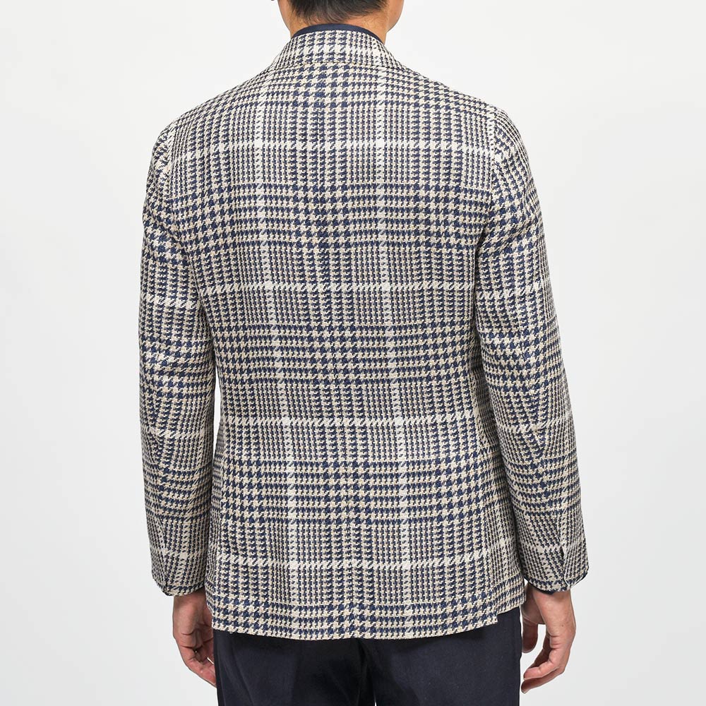 目付け280gのシルク×リネン×コットン素材を使用したグレンチェックジャケット。こちらは春夏にピッタリなドライなタッチの質感を持つ、STILE LATINOのエクスクルーシブファブリックになります。シルクの艶感とリネンの清涼感、コットンのしなやかさを持ち合わせており、シワが入りにくい質感が特徴です。ブラウンベージュとダークネイビーのグレンチェックに、ベージュのオーバーペーン。このどこにもない色合わせは、ヴィンチェンツォ氏らしい一着と言えます。