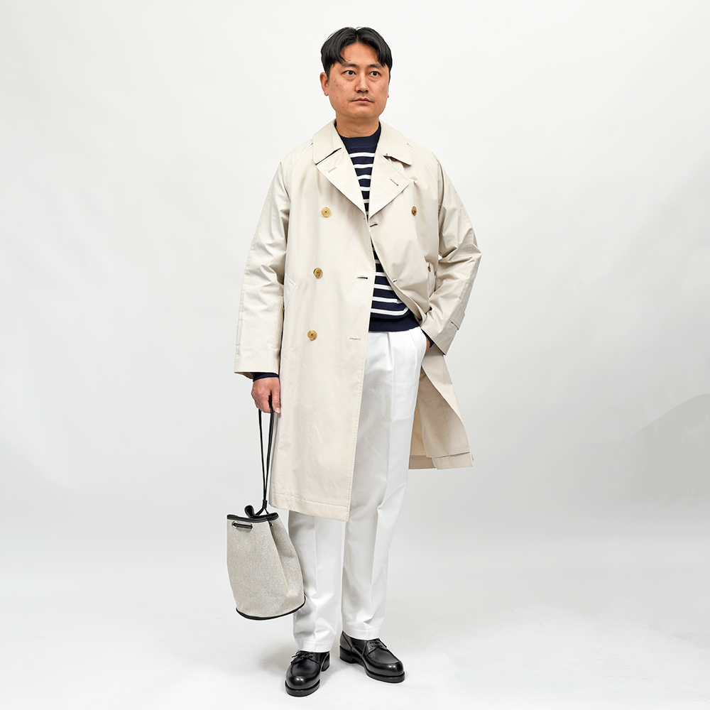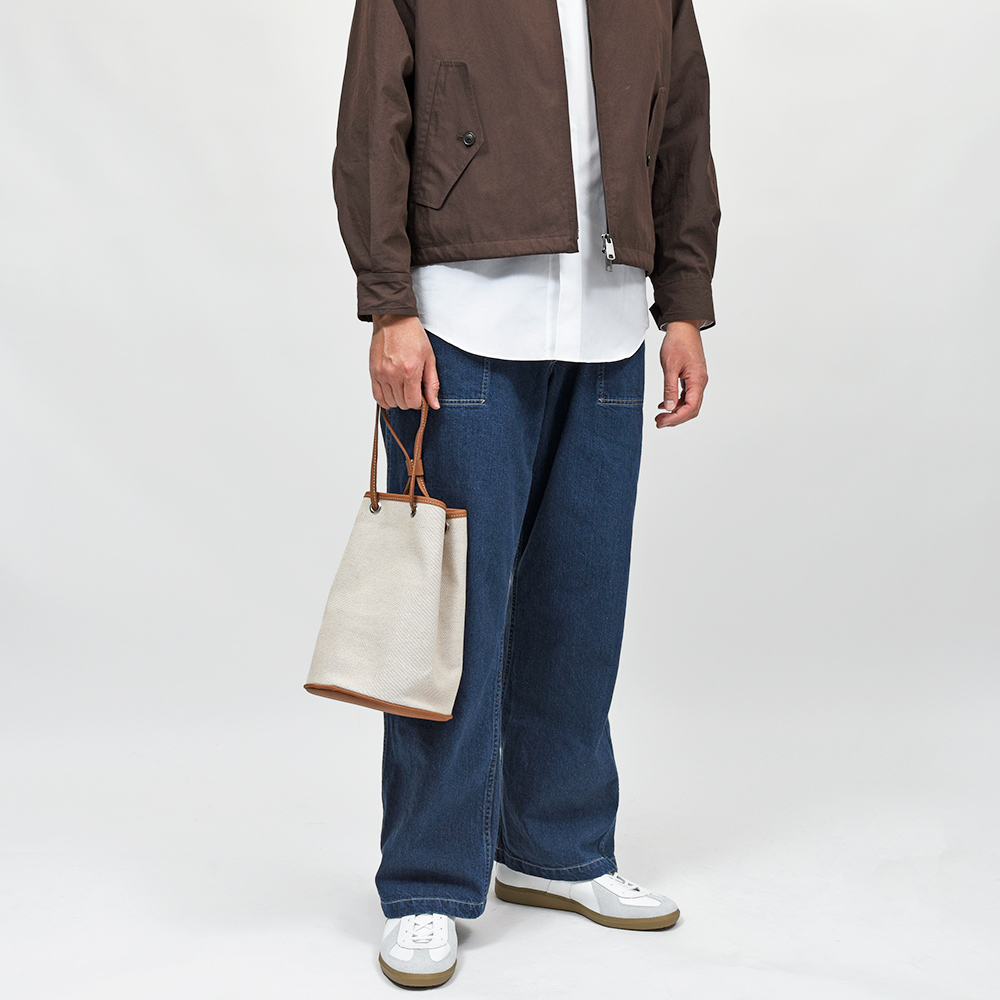 季節を問わないコンビ素材の巾着バッグは、程よい抜け感を作りつつも品の良いスタイルに仕上げてくれるスグレモノです。