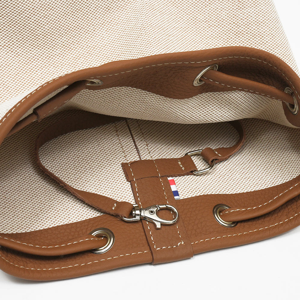 フランスのレミーカリア社の型押しではないトップグレードのグレインレザーと、フランスC.A.C社の最高峰のキャンバス素材を使用。グレインレザーは滑らかで柔らかく、かつハリがありモチッとした高級感のある風合い。キャンバスは種類の違う2本の糸で織り撥水加工を施した、エレガントな見た目とは裏腹な高い耐久性を兼ね備えています。革の裁断はほどんどが手作業で行われており、すべての工程を一人の職人が仕上げることで高い品質を維持し、妥協のない物作りを今なお続けています。