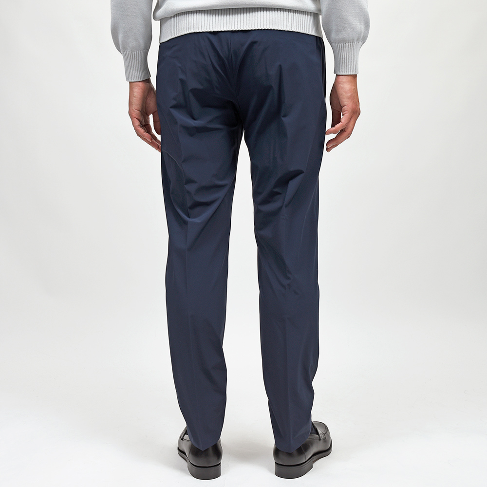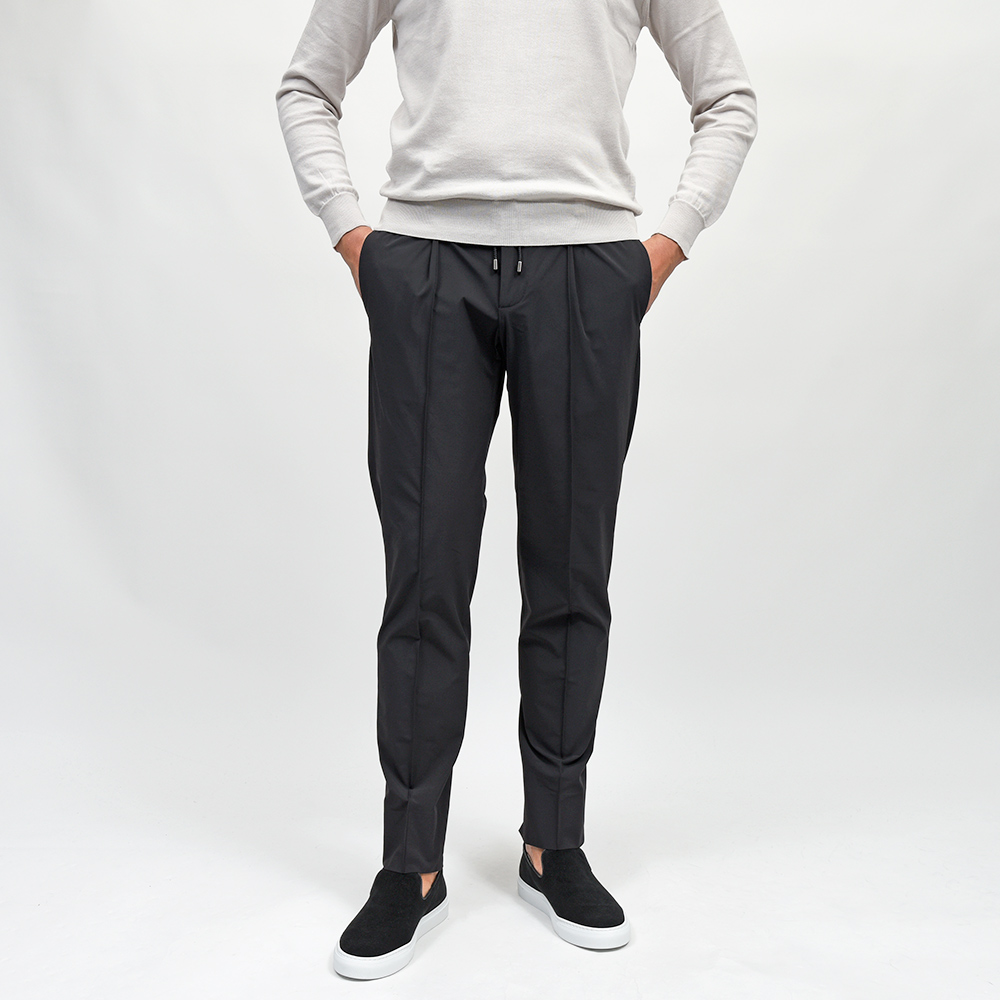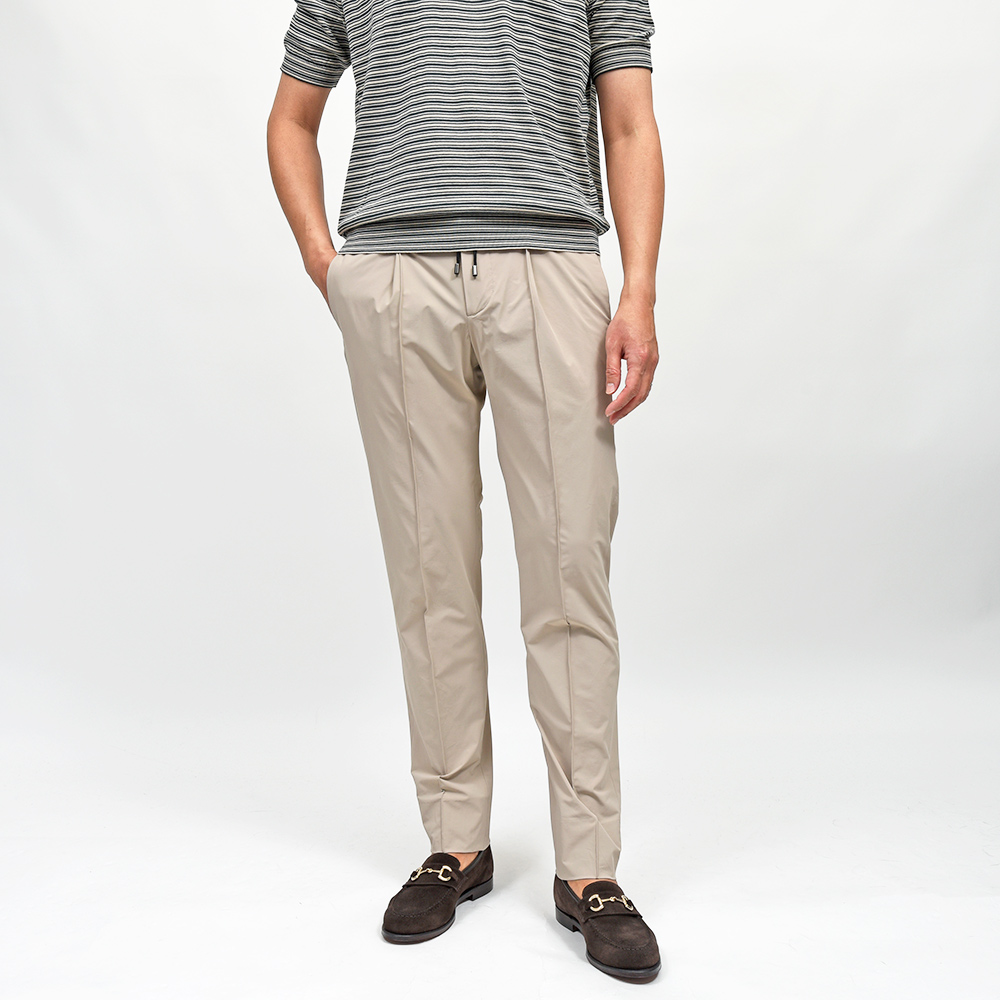 MASACCIOはフロントクリースをステッチで抑えることで、美しいラインがいつまでも続く永遠を約束された特別な一本です。ウエストのサイドにはゴムが入っており、ウエストは4cmほど伸縮してくれるリラックスした穿き心地。ドローコードは内側に隠すことができるため、ベルトを巻くとビジネスにも対応する、リラック顔にもドレス顔にも変化の効く万能なアイテムです。