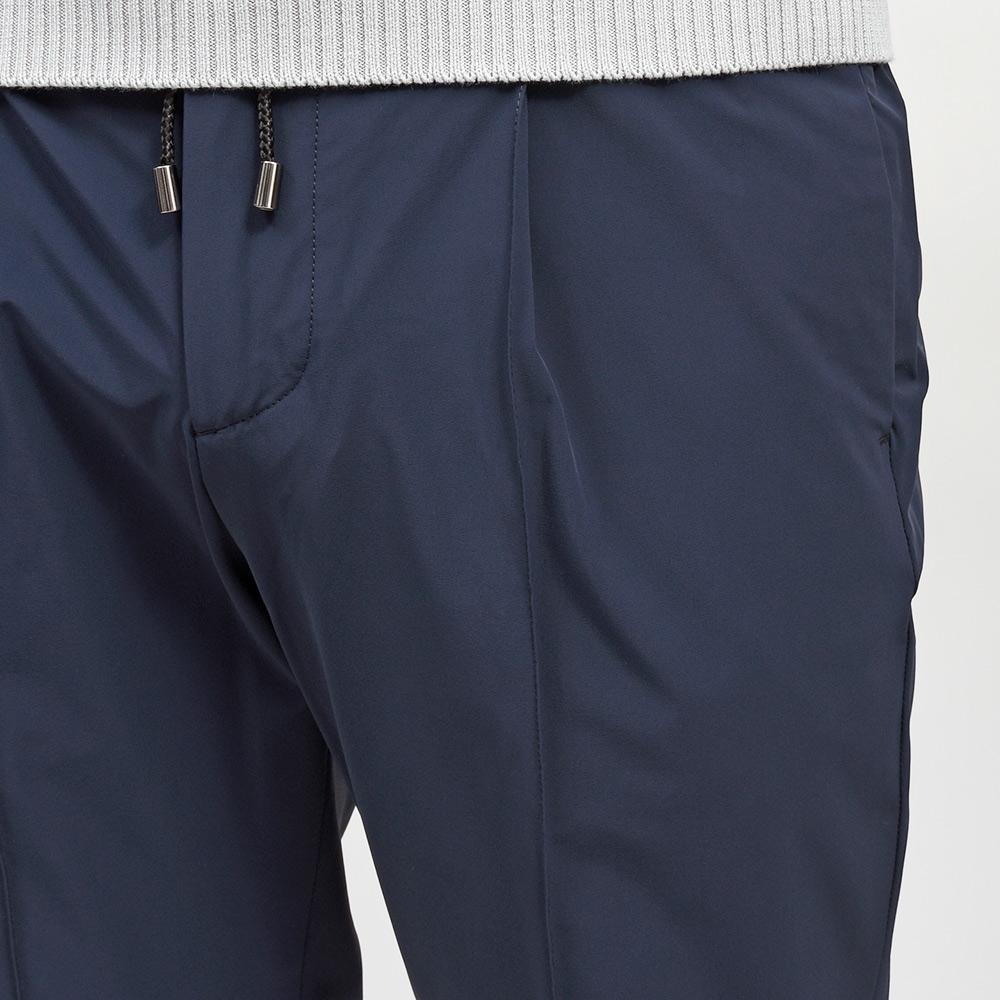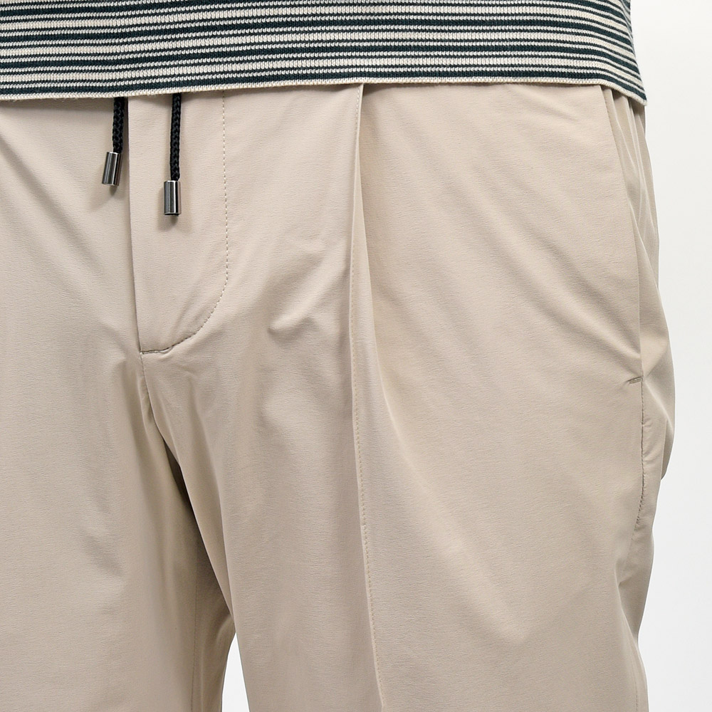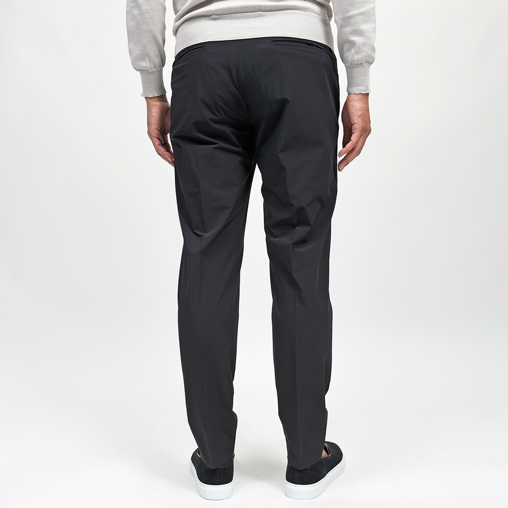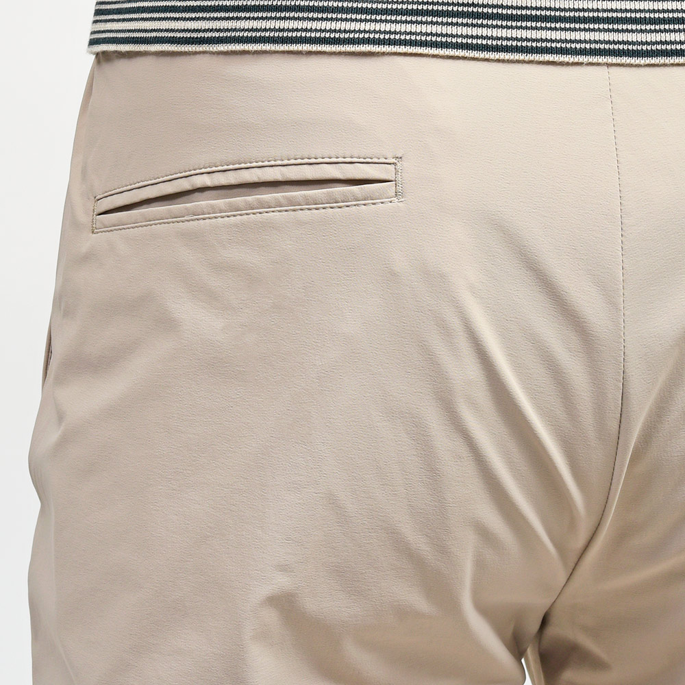 MASACCIOはフロントクリースをステッチで抑えることで、美しいラインがいつまでも続く永遠を約束された特別な一本です。ウエストのサイドにはゴムが入っており、ウエストは4cmほど伸縮してくれるリラックスした穿き心地。ドローコードは内側に隠すことができるため、ベルトを巻くとビジネスにも対応する、リラック顔にもドレス顔にも変化の効く万能なアイテムです。