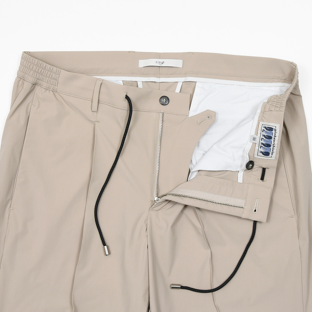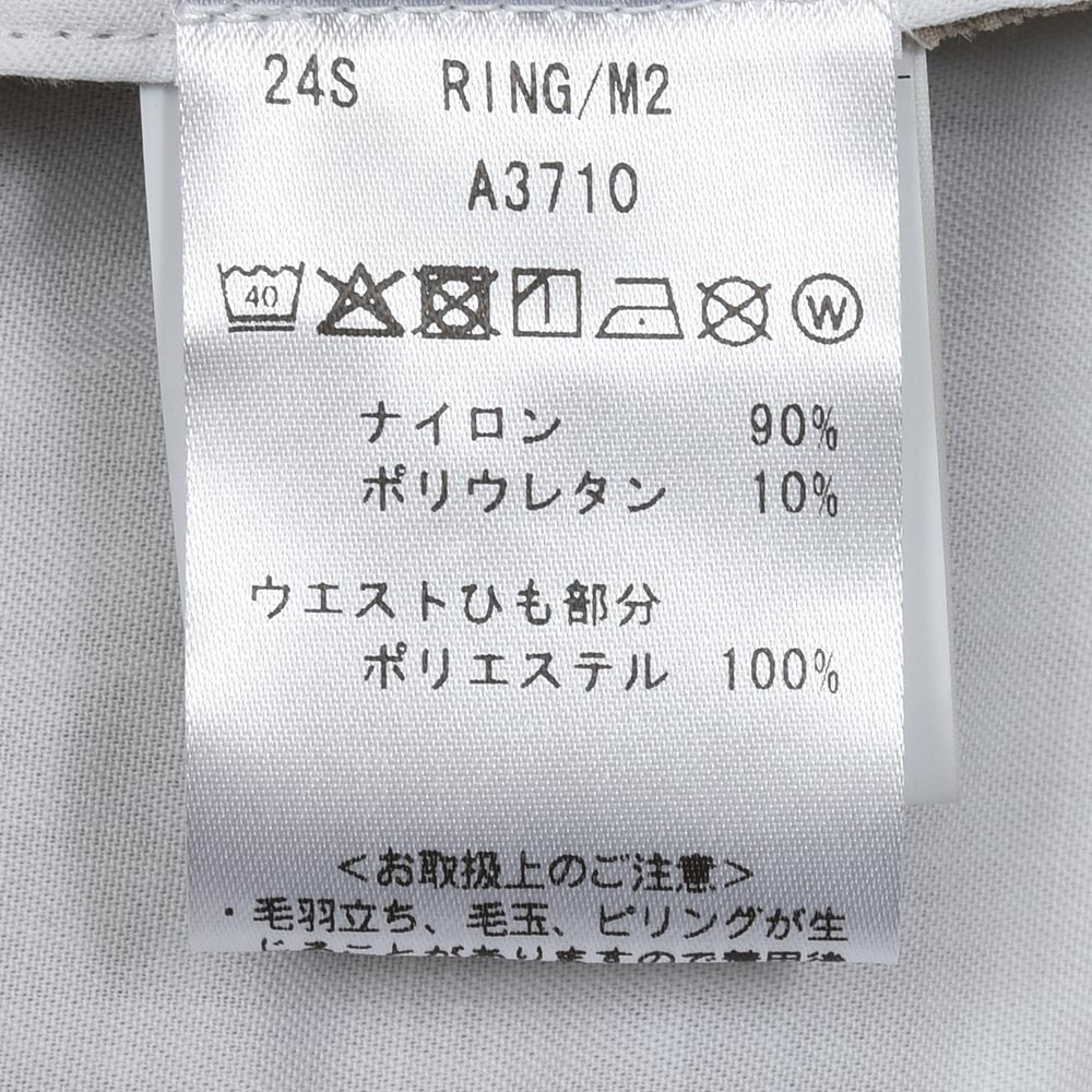 爆発的ヒットを記録したring初となるgiab's ARCHIVIO×ringの別注品、その名も“ring”。モデル名を決めかねていたバイヤー陣に対して、デザイナーの中新井氏の鶴の一声により決定した感慨深い一品です。そして、2020SSシーズンから“ring”をさらにアップデートした“ring2”が登場。1プリーツ入り“MASACCIO”のベースはそのままに、ドローコードをラグジュアリーな雰囲気が漂うイントレチャートに変更。さらに、マーベルトを-0.5cm幅を狭め、股上は+0.5cm深くすることでリラックス感が増しています。膝幅+0.5cmとそれぞれハーフサイズアップし、ふくらはぎの突っ張りを軽減しました。