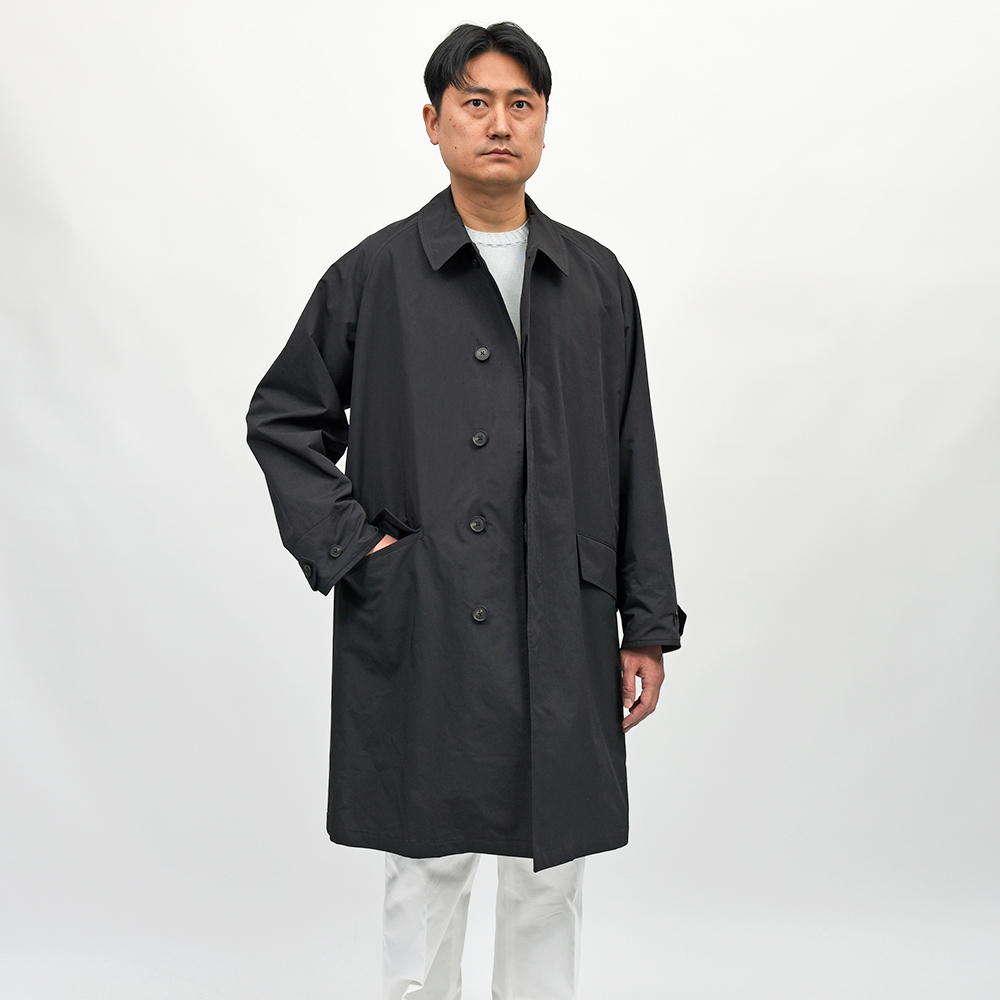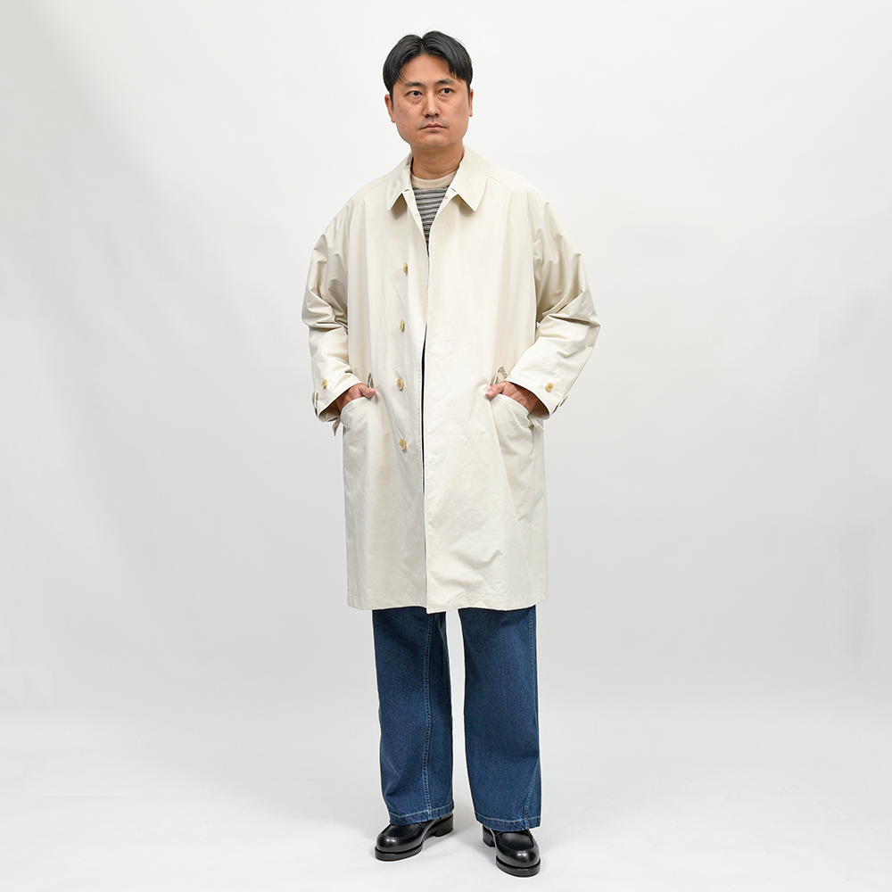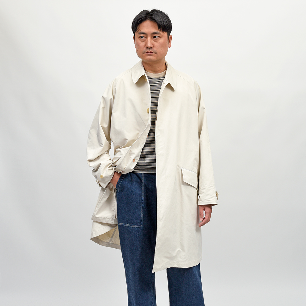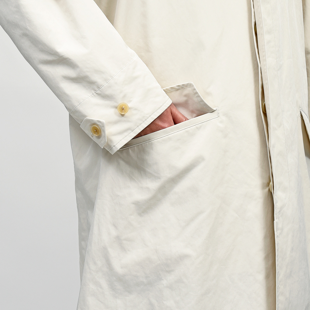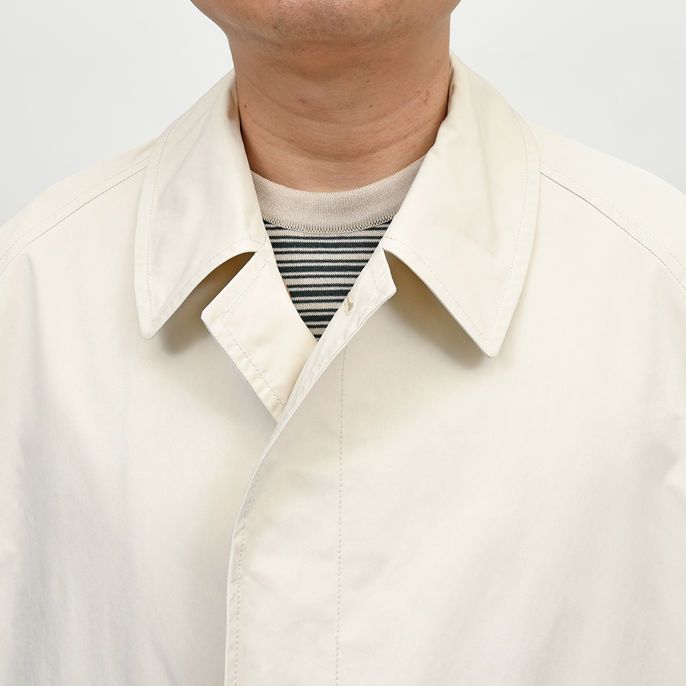 ゆったりとしたリラックスシルエットに、膝丈のハーフレングスのバルカラーコート。裾幅もやや広めに設定されているため、バサっと羽織るだけで風雅な動きを作り出してくれます。また、美しくドレープする高密度ミルクロスとも抜群の相性です。