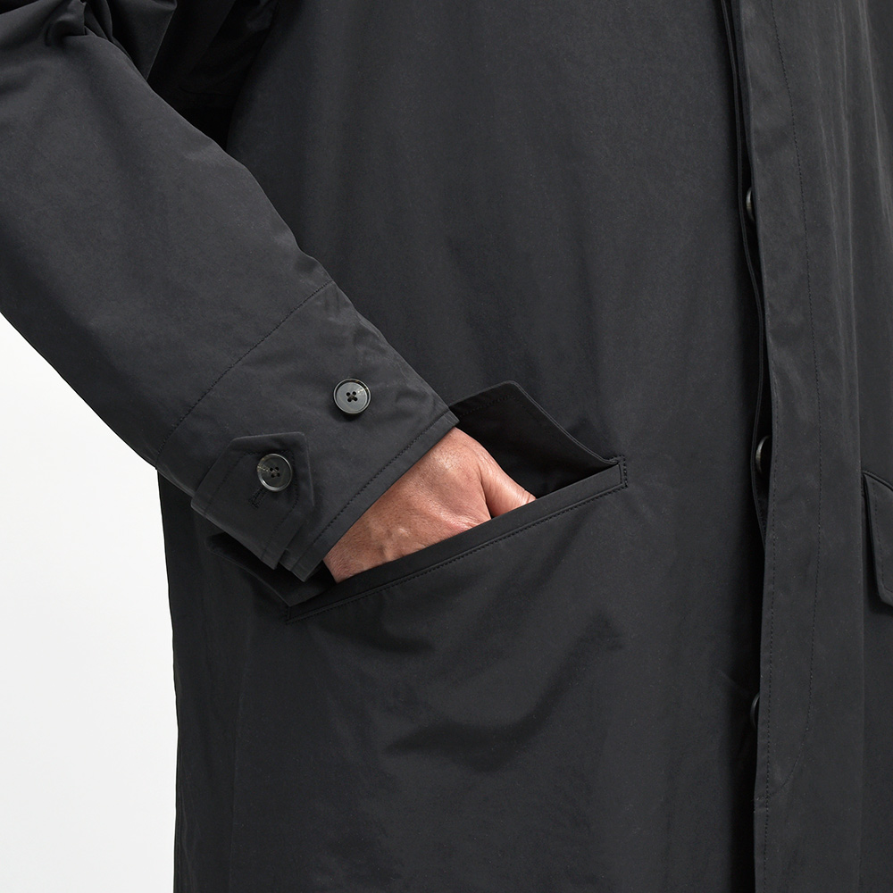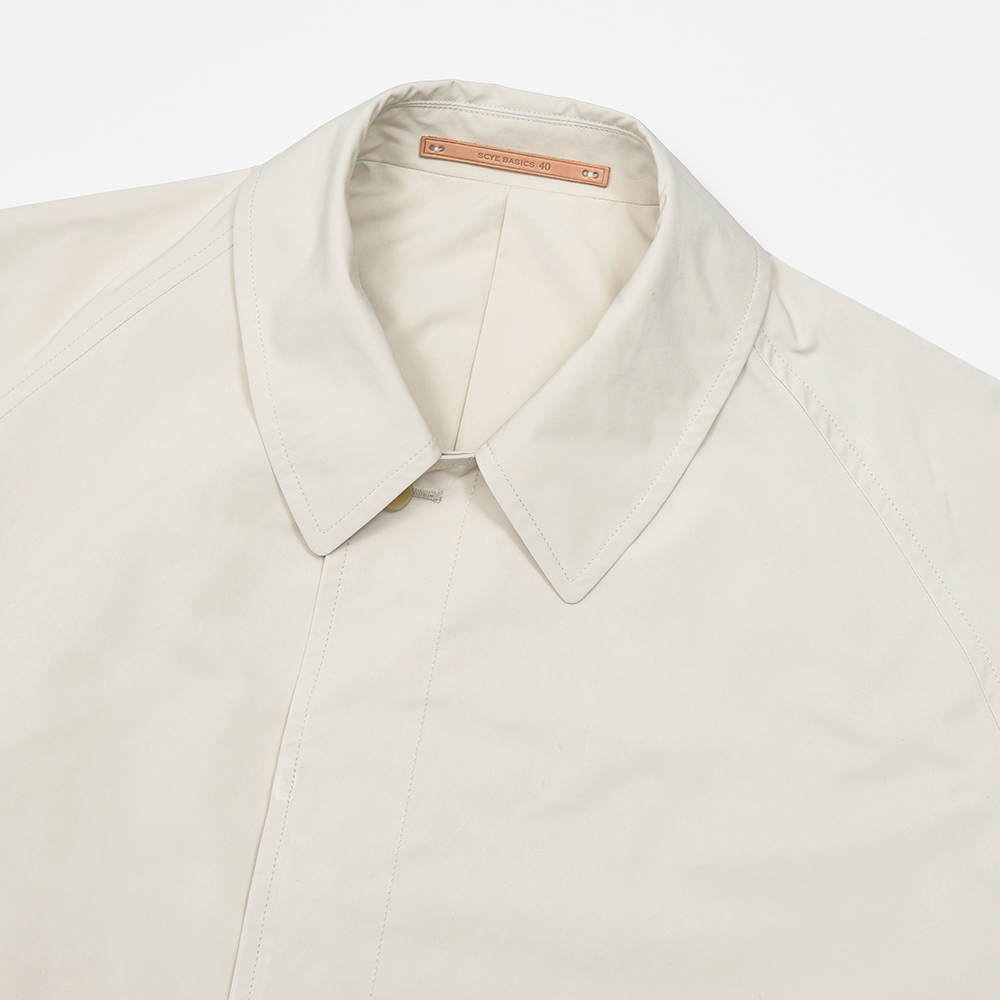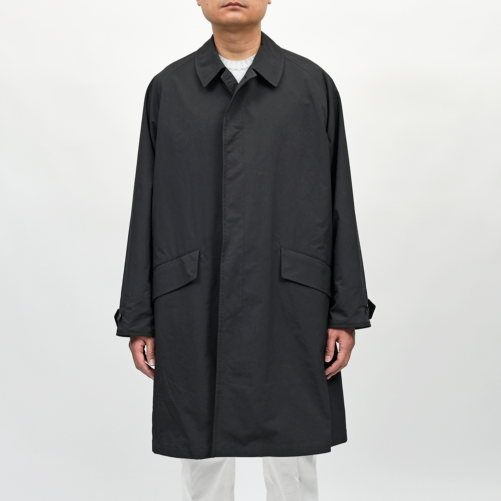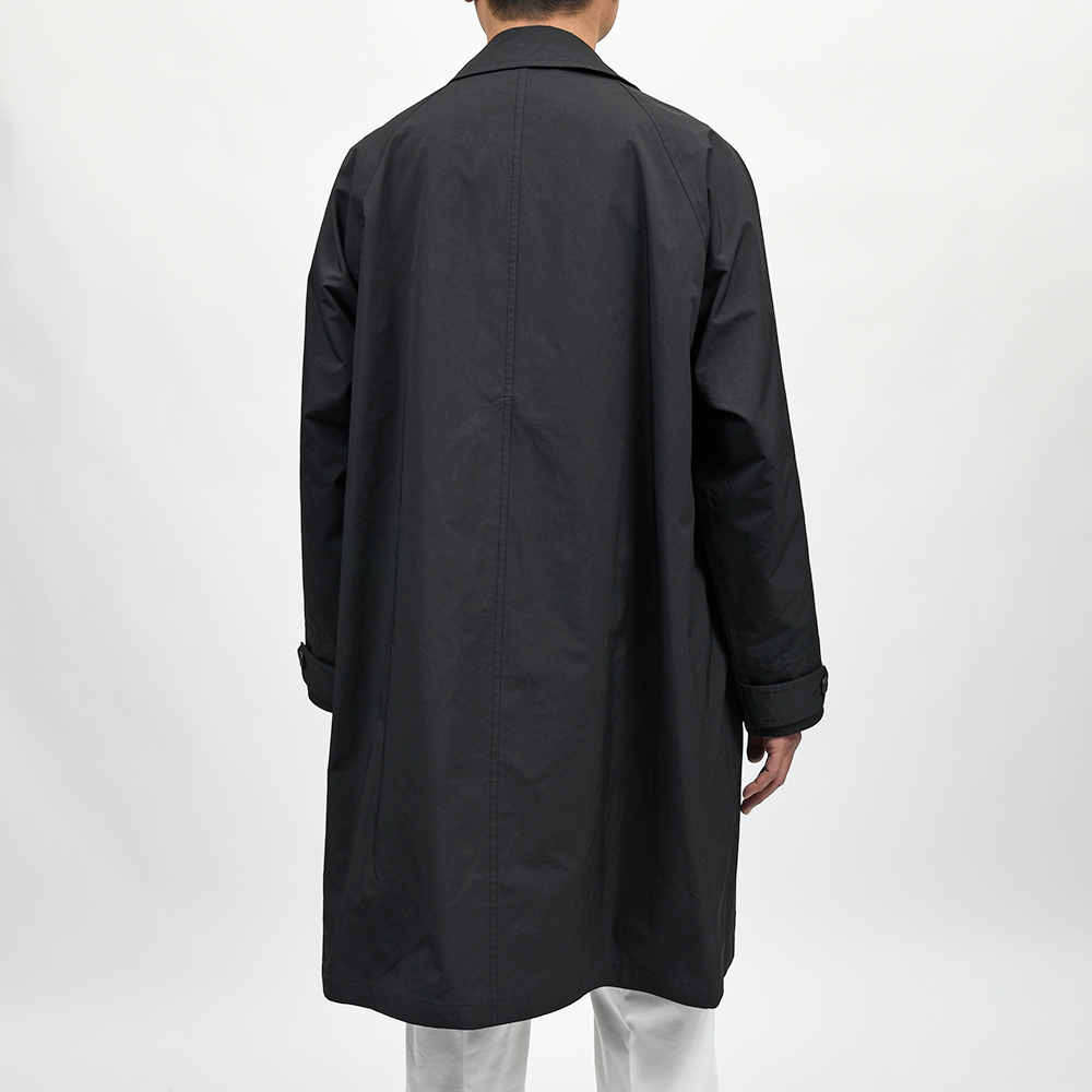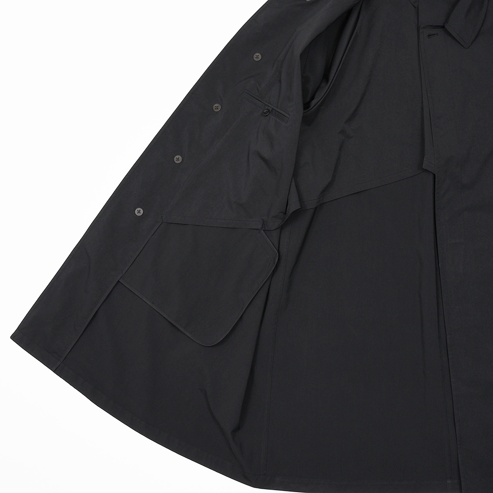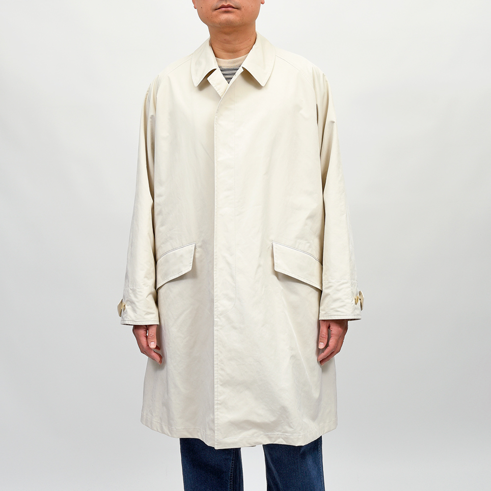 ゆったりとしたリラックスシルエットに、膝丈のハーフレングスのバルカラーコート。裾幅もやや広めに設定されているため、バサっと羽織るだけで風雅な動きを作り出してくれます。また、美しくドレープする高密度ミルクロスとも抜群の相性です。