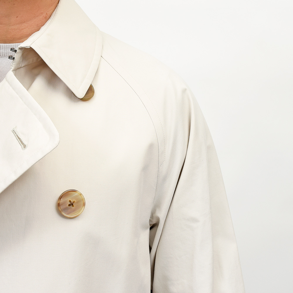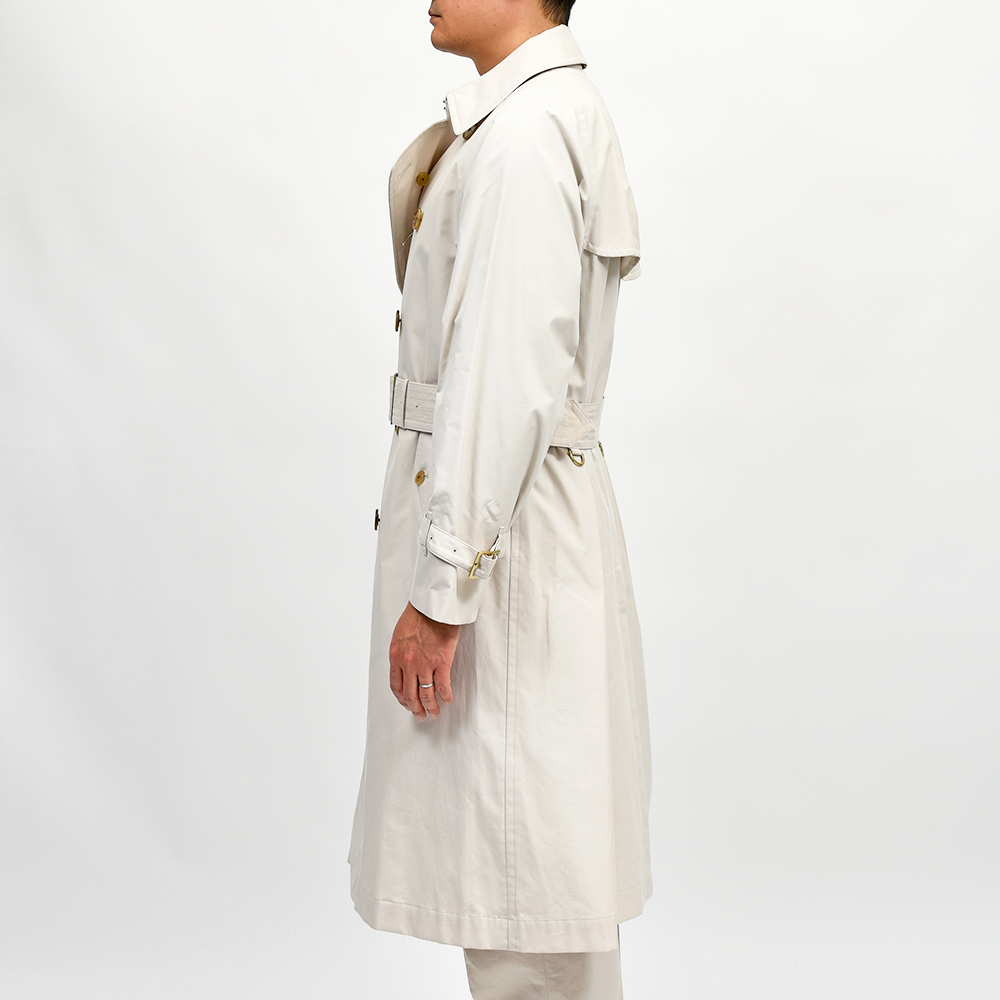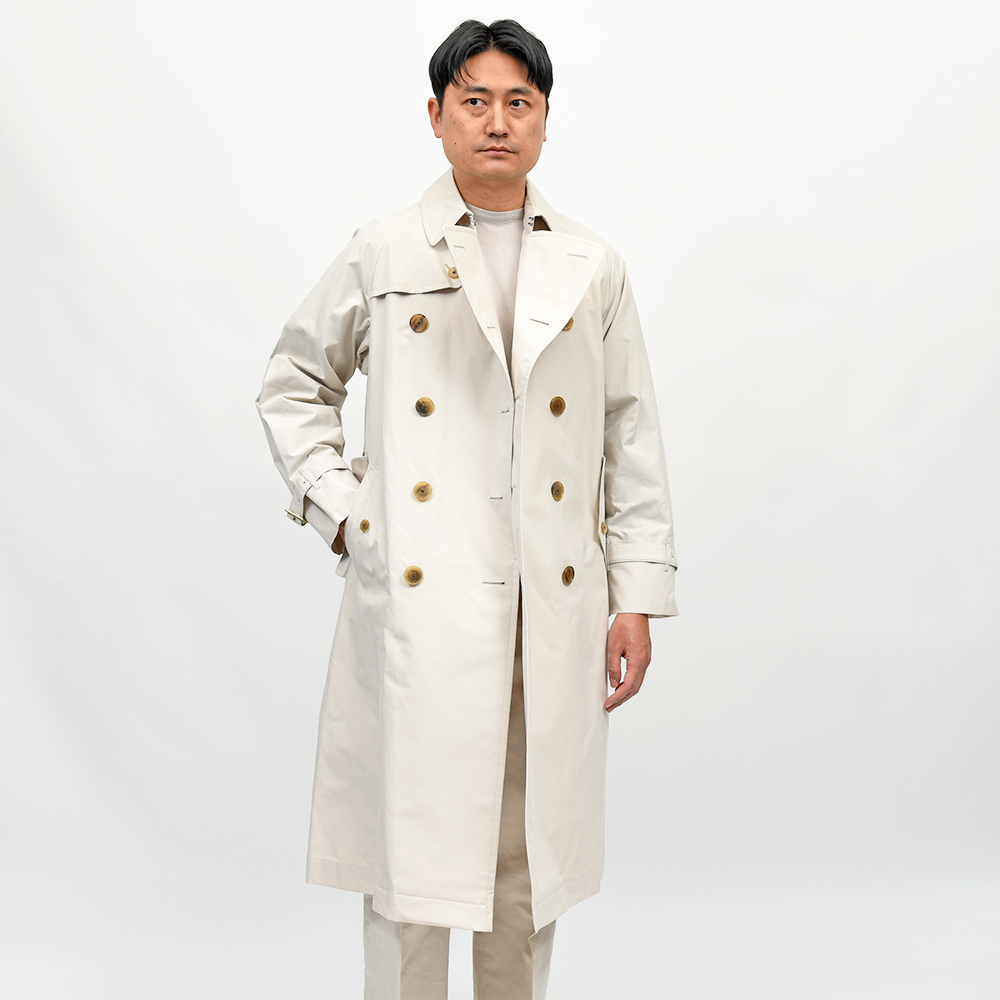 哲学者、作家、ジャーナリストとし活躍した、フランスのノーベル賞作家Albert Camus(アルベール・カミュ)が1950年代に着たエポレットの無い一枚仕立てのラグランスリーブに、下半身の動きやすさを求めたハイウェストで着丈の長いトレンチコートAL(アル)。WWI/WWII期のミリタリークローズとしての仕様を参照し、足裁きを妨げないハイウェストなベルト位置、工夫が凝らされたアームホールの裁断によって、広い稼動域を確保した一枚パネルのラグランスリーブ等を融合しています。