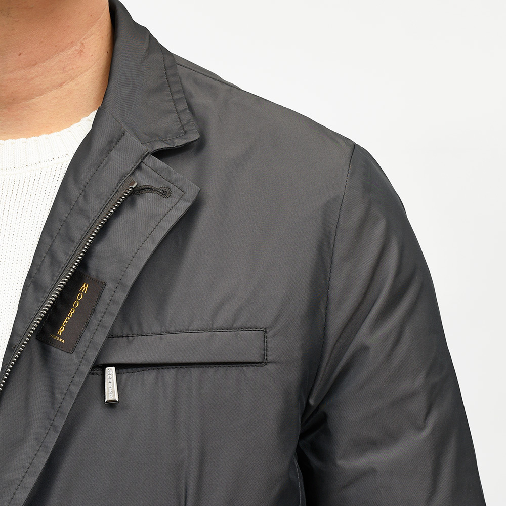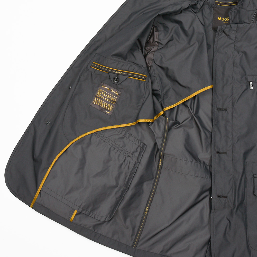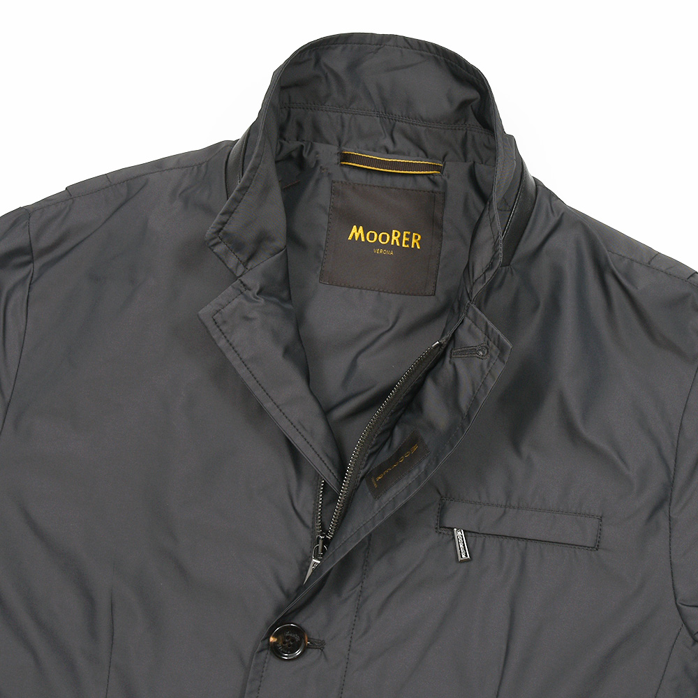 特注のスナップボタン、ファスナーやホーン釦などの拘りに、裏地のナイロン素材の美しさ加えてパイピング処理を施した丁寧な仕上げ。MooRERのアウターに死角はありません。