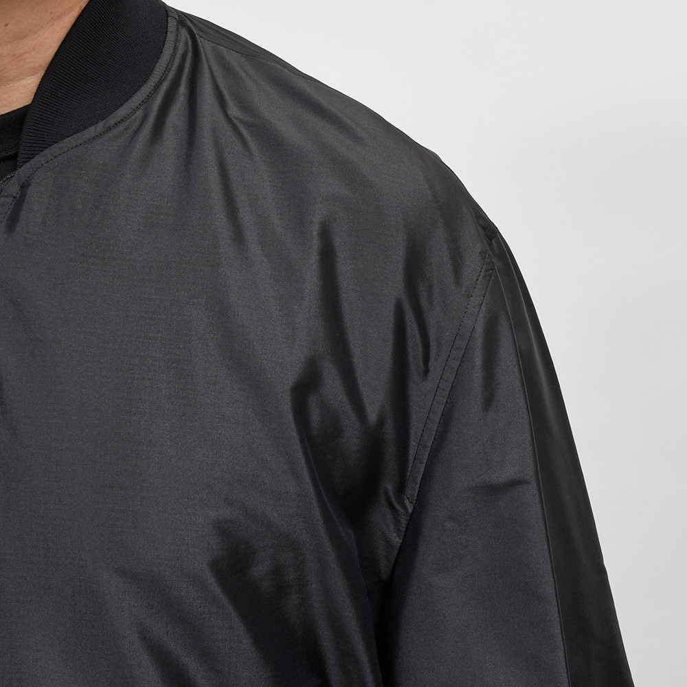 オーバーサイズシルエットのボンバージャケット。ドロップショルダーにゆったりとした身幅とアームホールが、リラックスした雰囲気を作り上げています。シャツ生地のような軽さで羽織れるパラシュートクロスですので、ドレープ感が生まれ光沢感と合わさることで上品な表情を生んでいます。