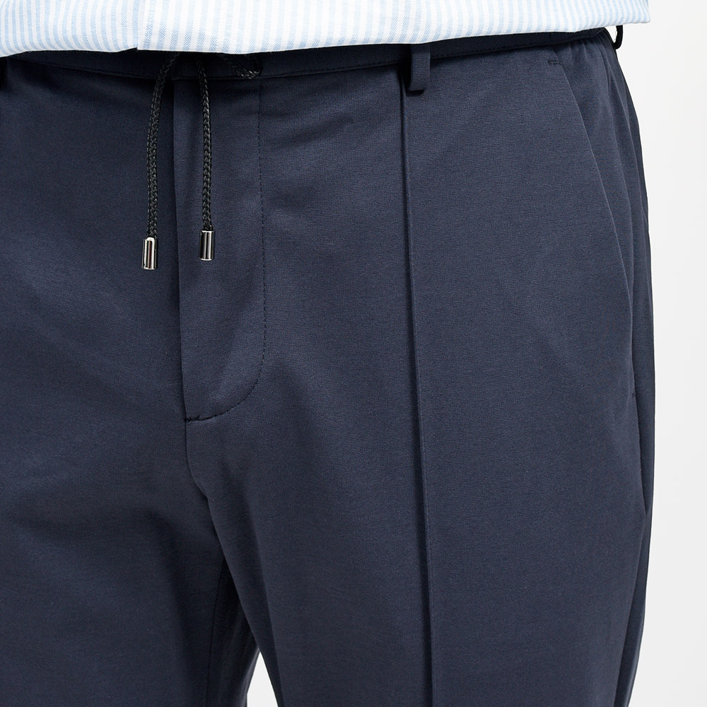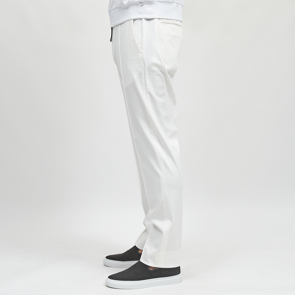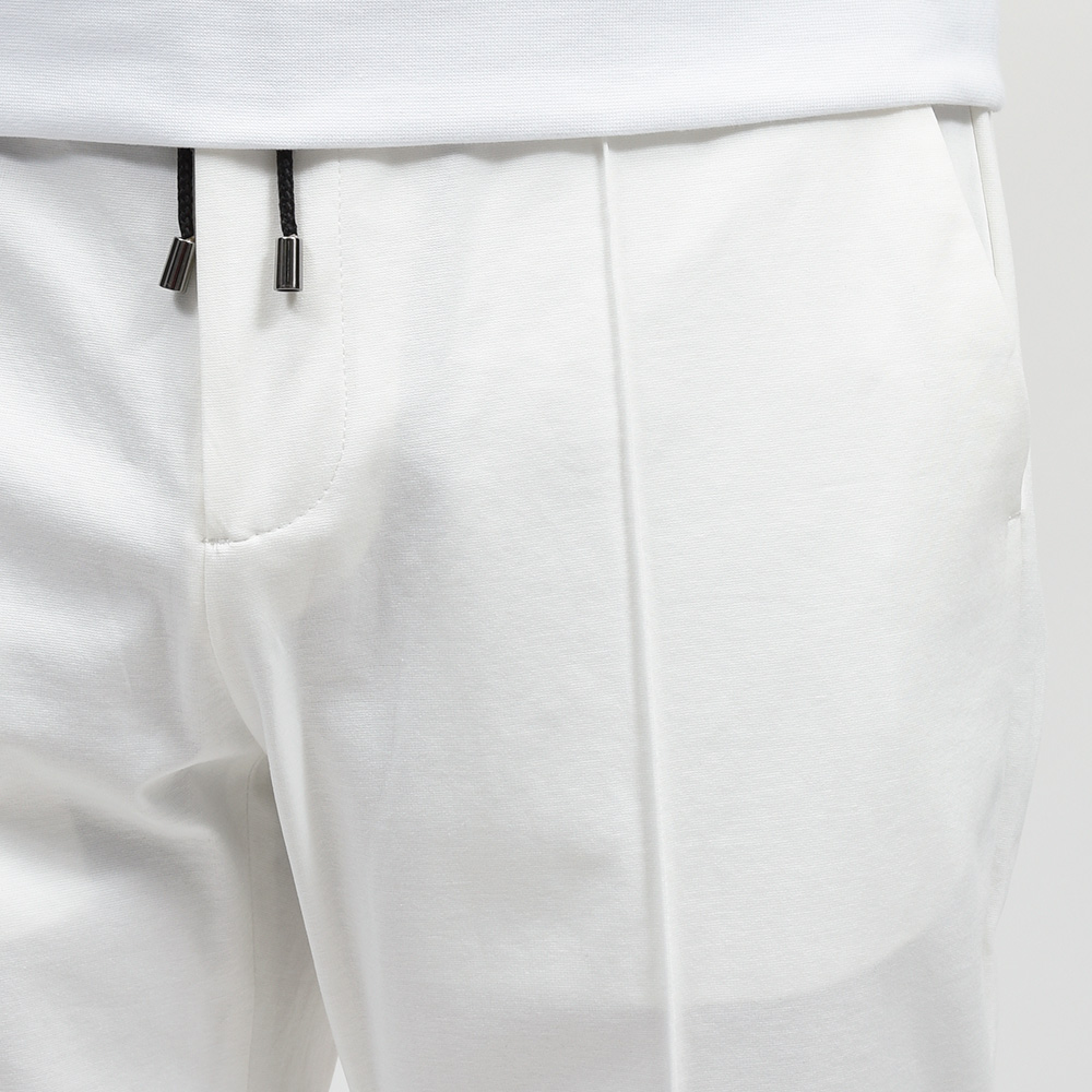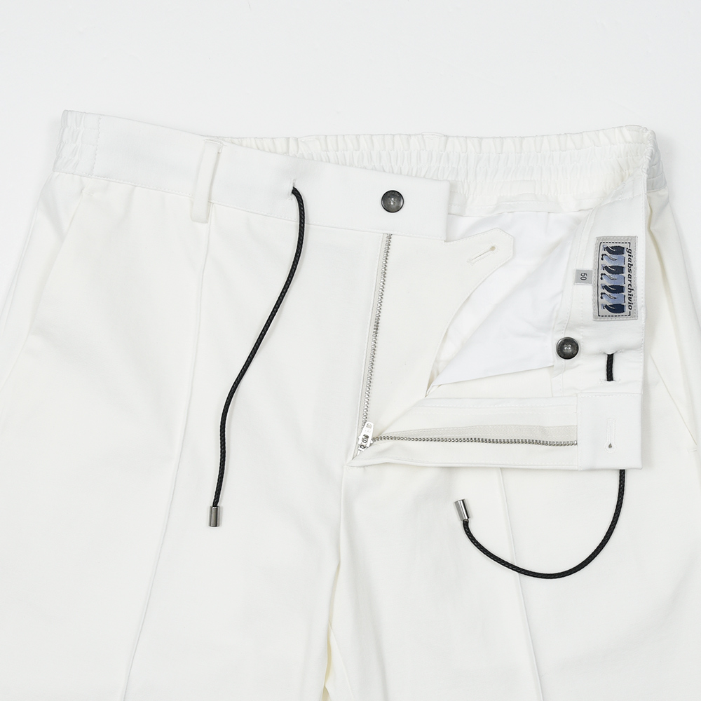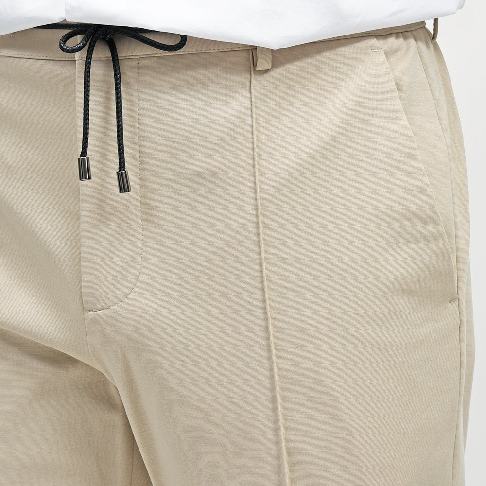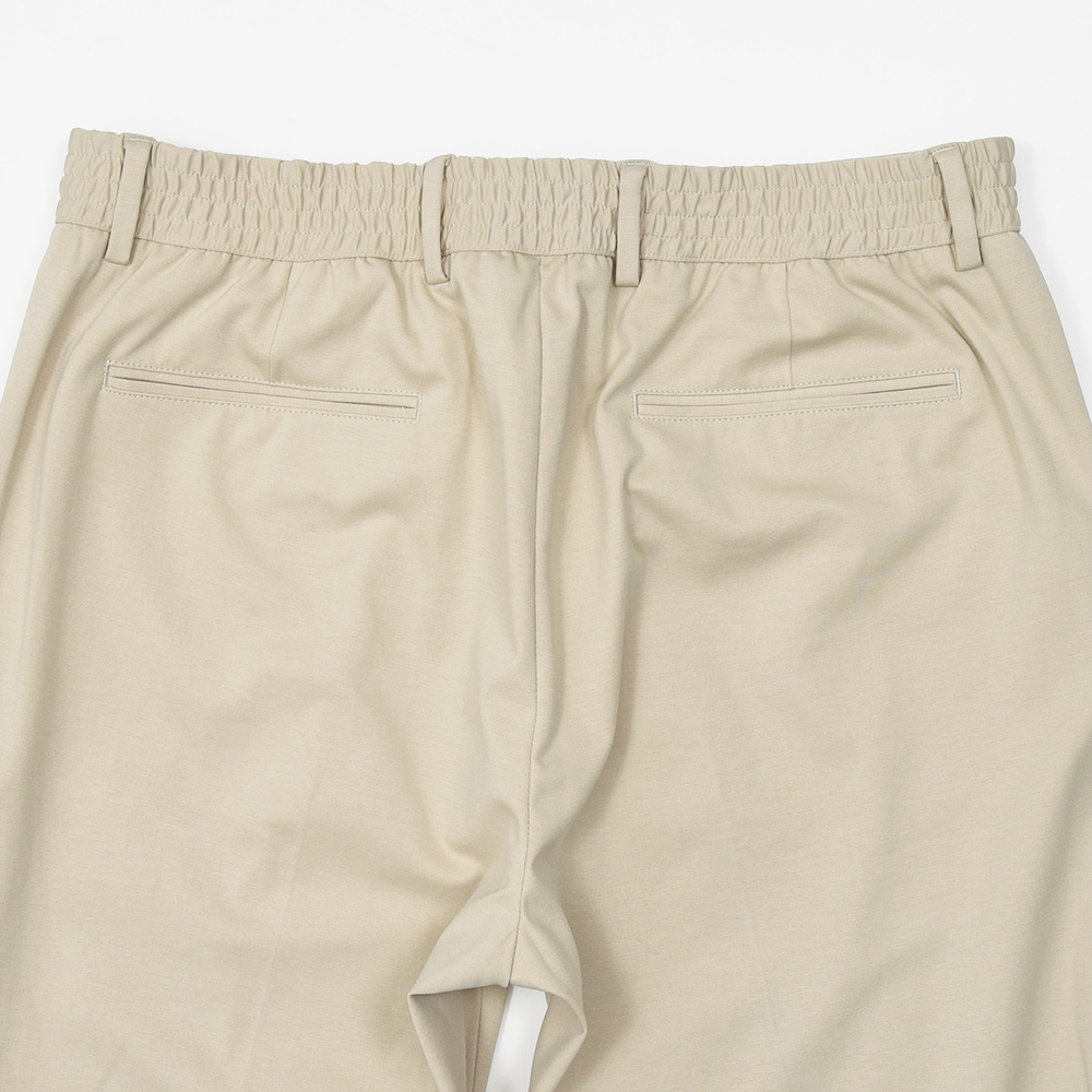 MASACCIO/3GはMASACCIOの特徴である永久クリースや、内側に隠せるドローコードなどのディティールを継承しつつも、現代的なフィッティングに再解釈したモデルになります。こちらの別注モデルでは、通常ウエストのサイドのみに施されたゴムを、後半身がシャーリング仕様となりより高い伸縮性を持たせています。