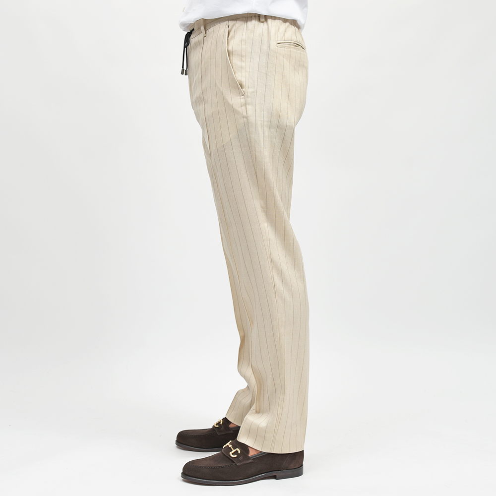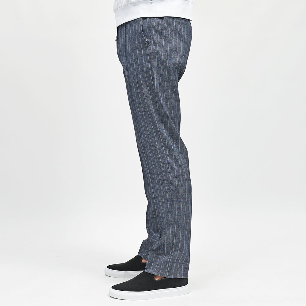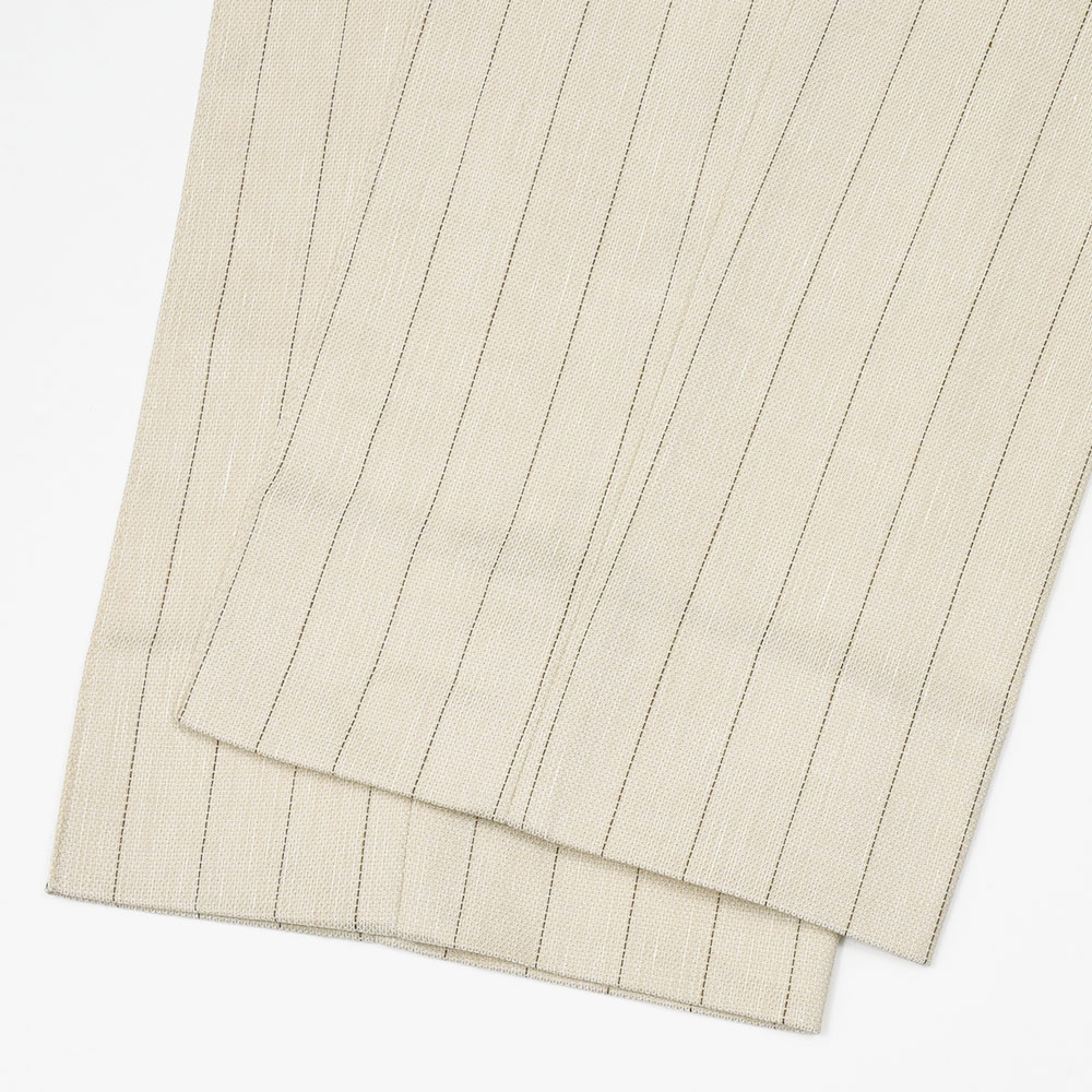 今シーズンに新登場したファブリック“HAIR LINE LINEN”。リネンらしいドライなタッチの質感を持たせながらも、ジャージーのような柔らかさとストレッチ性を持たせた実用的なリネンパンツになります。目付けは270gと軽く、また細いピッチのストライプが清涼感を生んでいる、暑い季節にピッタリな一本となっています。