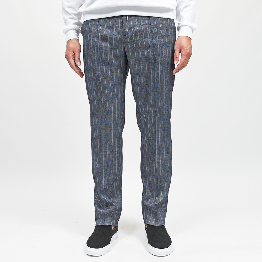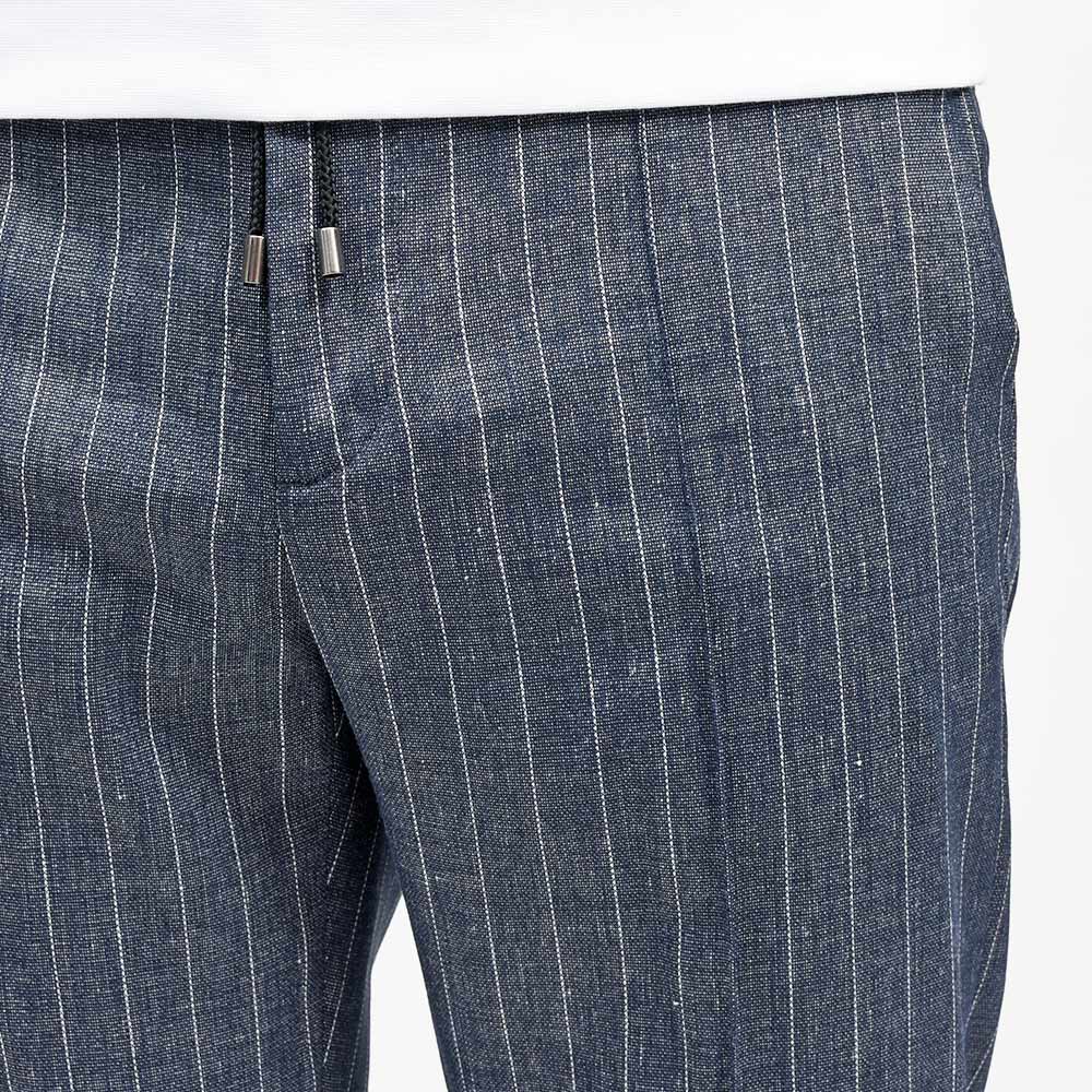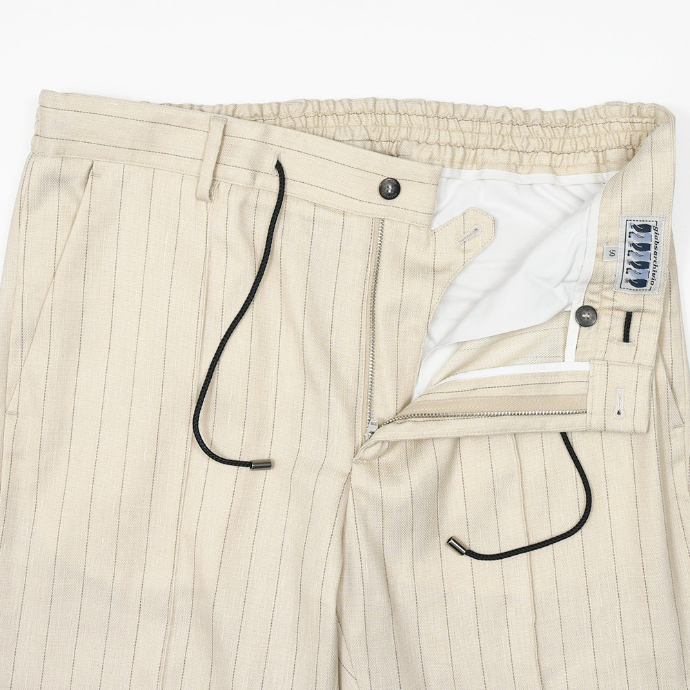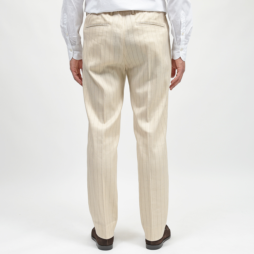 今シーズンに新登場したファブリック“HAIR LINE LINEN”。リネンらしいドライなタッチの質感を持たせながらも、ジャージーのような柔らかさとストレッチ性を持たせた実用的なリネンパンツになります。目付けは270gと軽く、また細いピッチのストライプが清涼感を生んでいる、暑い季節にピッタリな一本となっています。