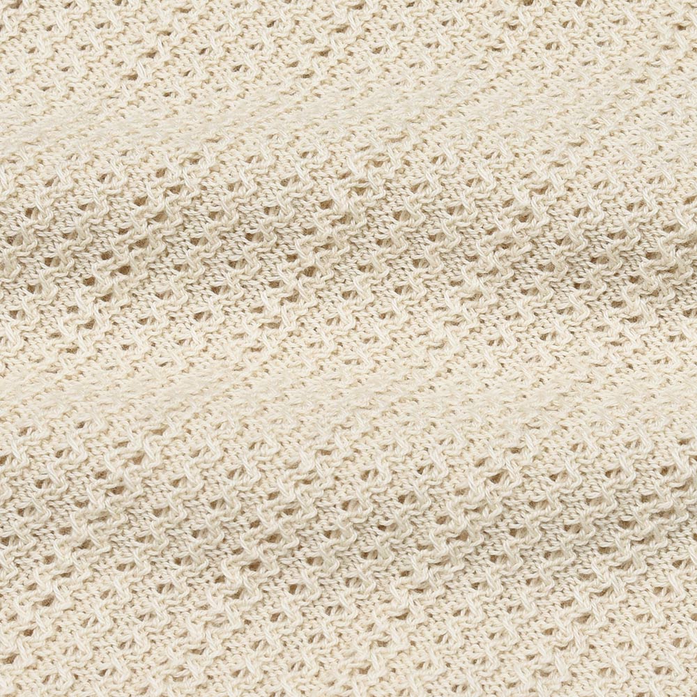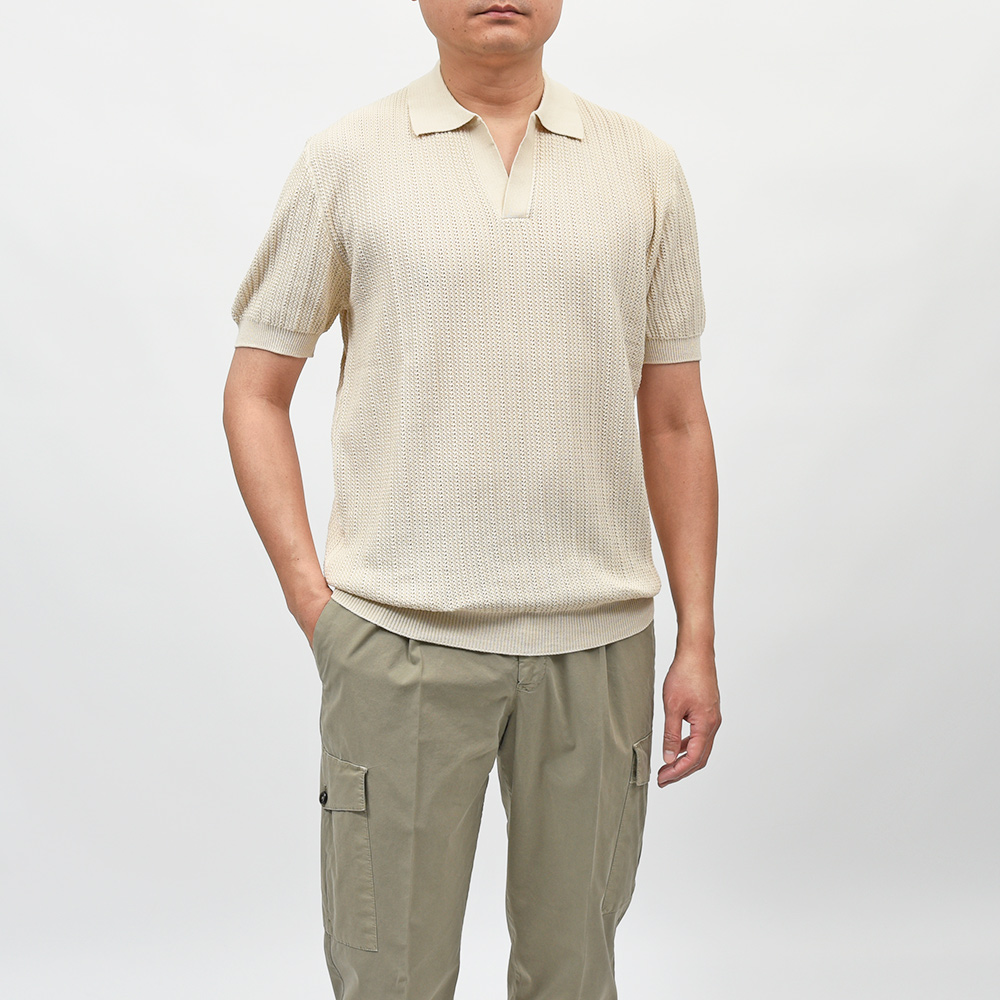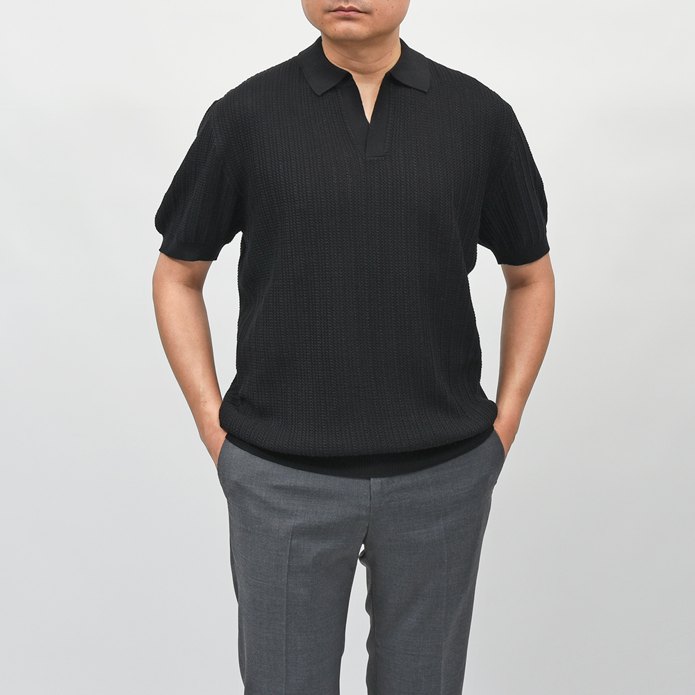 上質なコットン素材を使用した、非常に滑らかで柔らかなタッチのスキッパーニットポロ。リンクス編みと呼ばれる表目と裏目で形成される編み地は、縦横の伸縮性に優れており、凹凸感が生まれるため清涼感のある質感となっています。またこちらは、ややタイトなサイズ感のモデルのため、リラックスして着用できるように通常よりもサイズアソートをあげてオーダーしております。