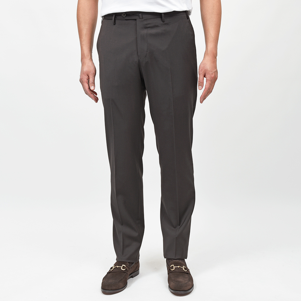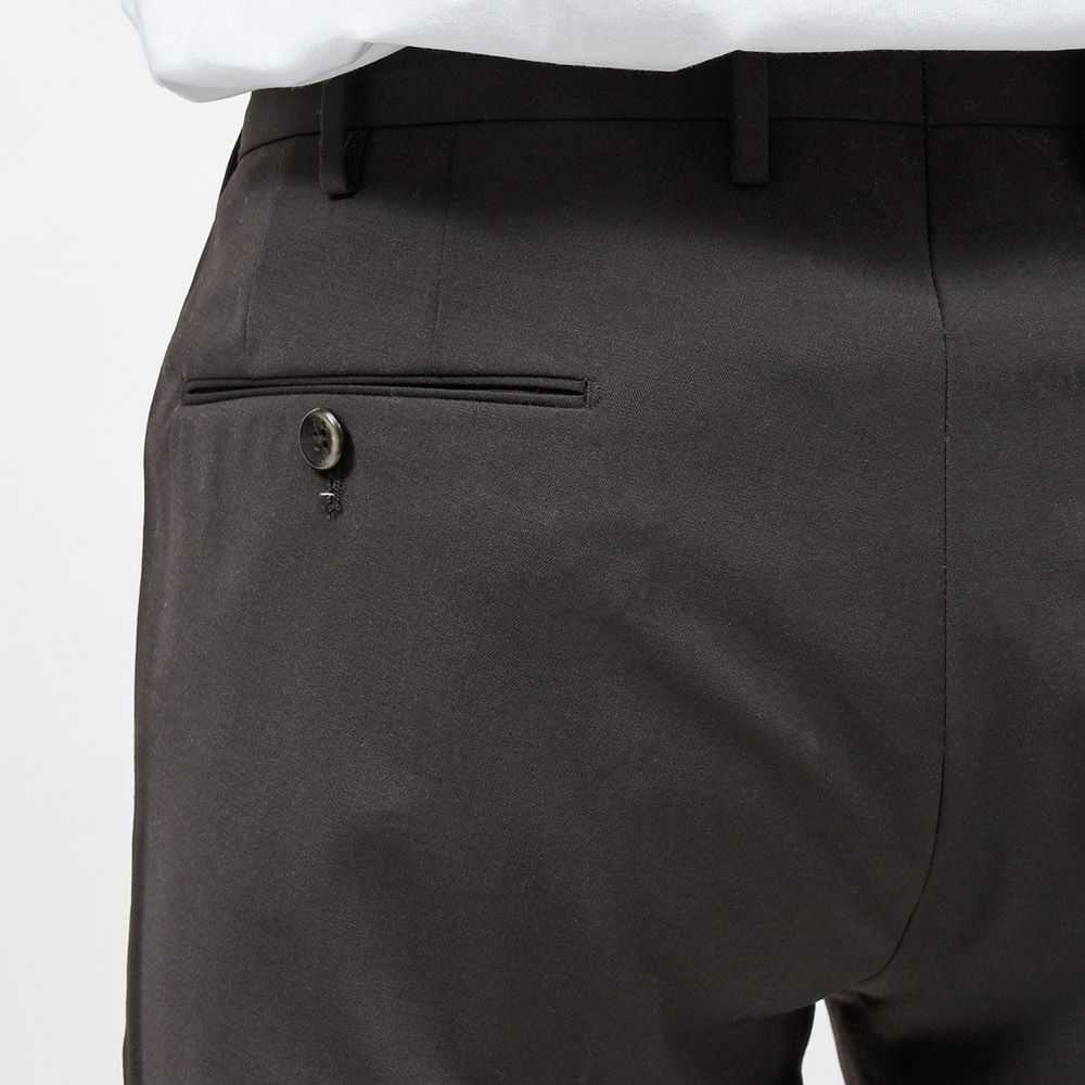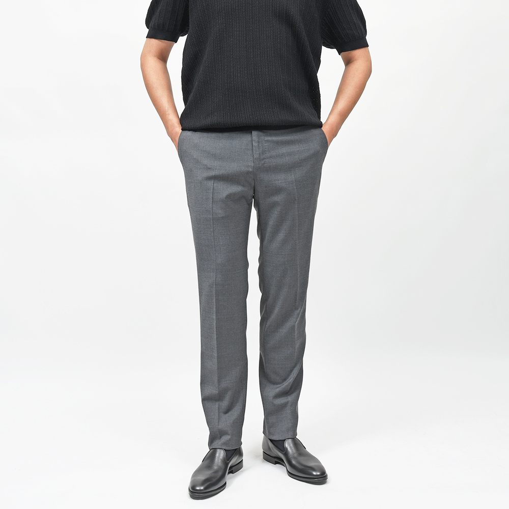 目付け260gの“WASHABLE STRETCH TECHNO WOOL”と名付けられたこちらは、一度穿くとやめられないビジネスパンツの金字塔”Travel”シリーズ。言わずもがなのストレッチが効いたバツグンの穿き心地に、トロピカルウールのドライなタッチは蒸れる日本の風土にぴったり。使用されているポリエステルとウールの混紡素材は柔らかでシワになりにくく、立ったり座ったりを繰り返すビジネスシーンにおいて必須となる機能性。そして何よりも自宅で洗濯でき、アイロンをかける事でシワもスムーズに伸びます。