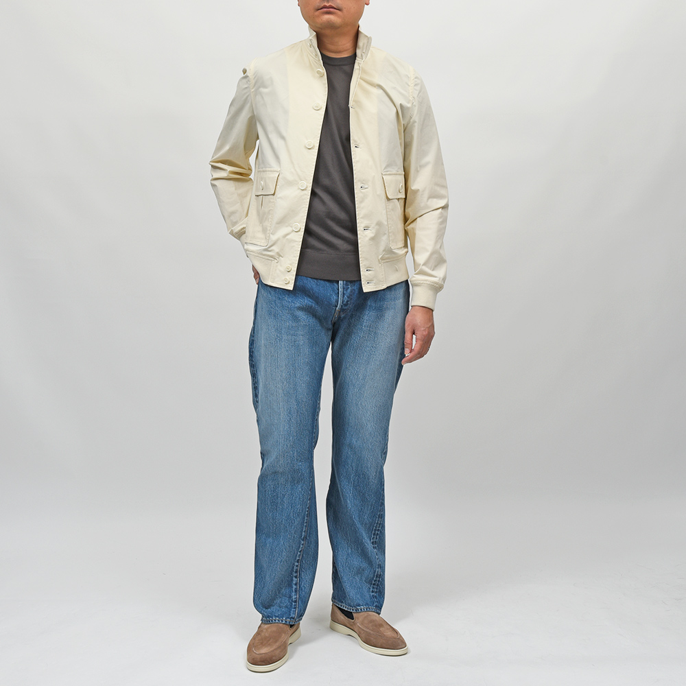 こちらは、ハリのある質感が清涼感をもたらせてくれる薄手なコットンポプリンを使用。ストレッチ性を持たせた生地は、裏地を省いた軽量な仕立てなので非常に快適な着用感をもたらせてくれます。オーセンティックなデザインでありながらも、使い勝手の良い素材を使用することで時代にあった進化を見せてくれる一品です。