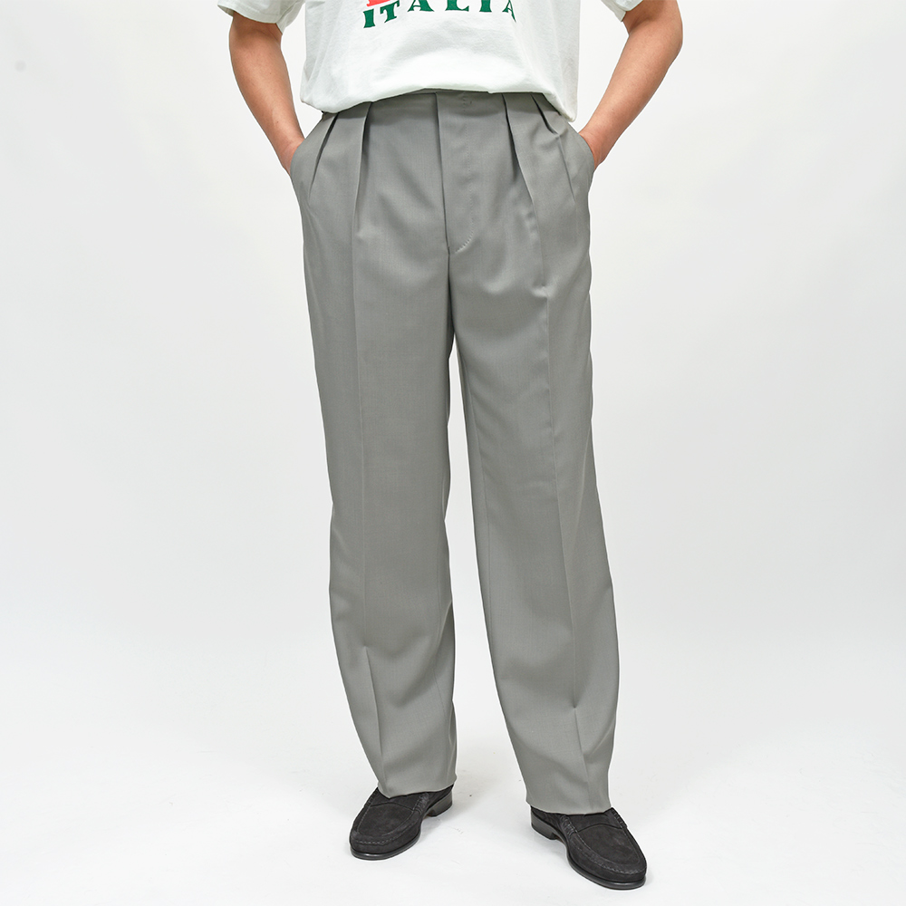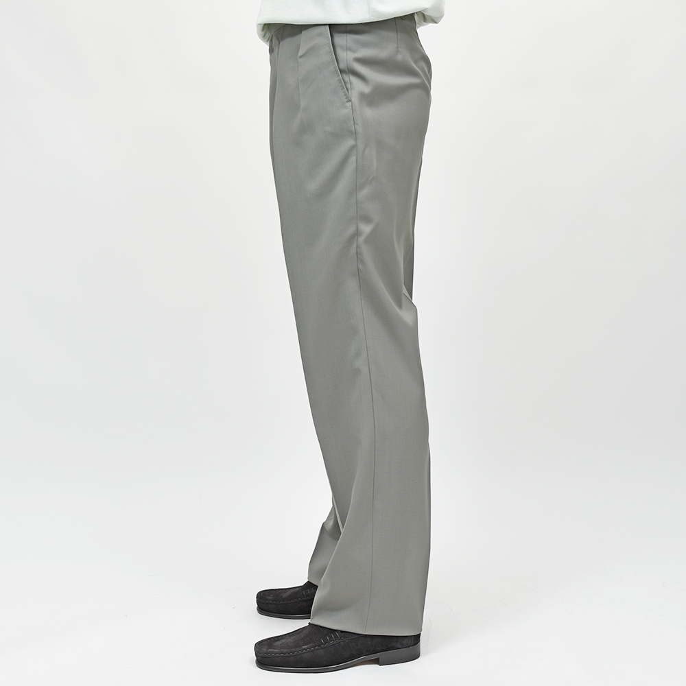 サイズ40でウエストは少しゆとりがあり、2プリーツですが腰回りやヒップはスッキリとしていてキレイなラインがでています。ワタリから裾にかけてゆとりのあるシルエットで、レギュラー以上、ワイドパンツ未満といった印象で今の時代に合った汎用性のあるサイズ感です!