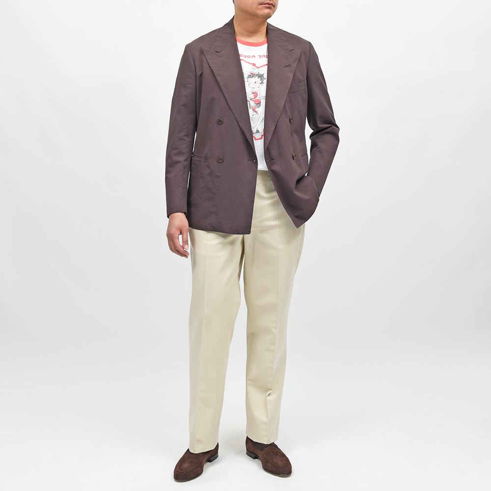 モデル“SPENDER(スペンダー)”は1970〜80年代パリを代表するのセレクトショップの一つHEMISPHERES(エミスフェール)が、BERNARD ZINSに別注していたモデルの復刻になります。切り替えのないワンピースカットにややハイバックなウエストに、ノープリーツのスッキリとした腰回りと、特徴的なシンチバック。ストレートに見える緩やかなテーパードシルエットが、今の気分にはピッタリな表情を作り上げてくれます。
