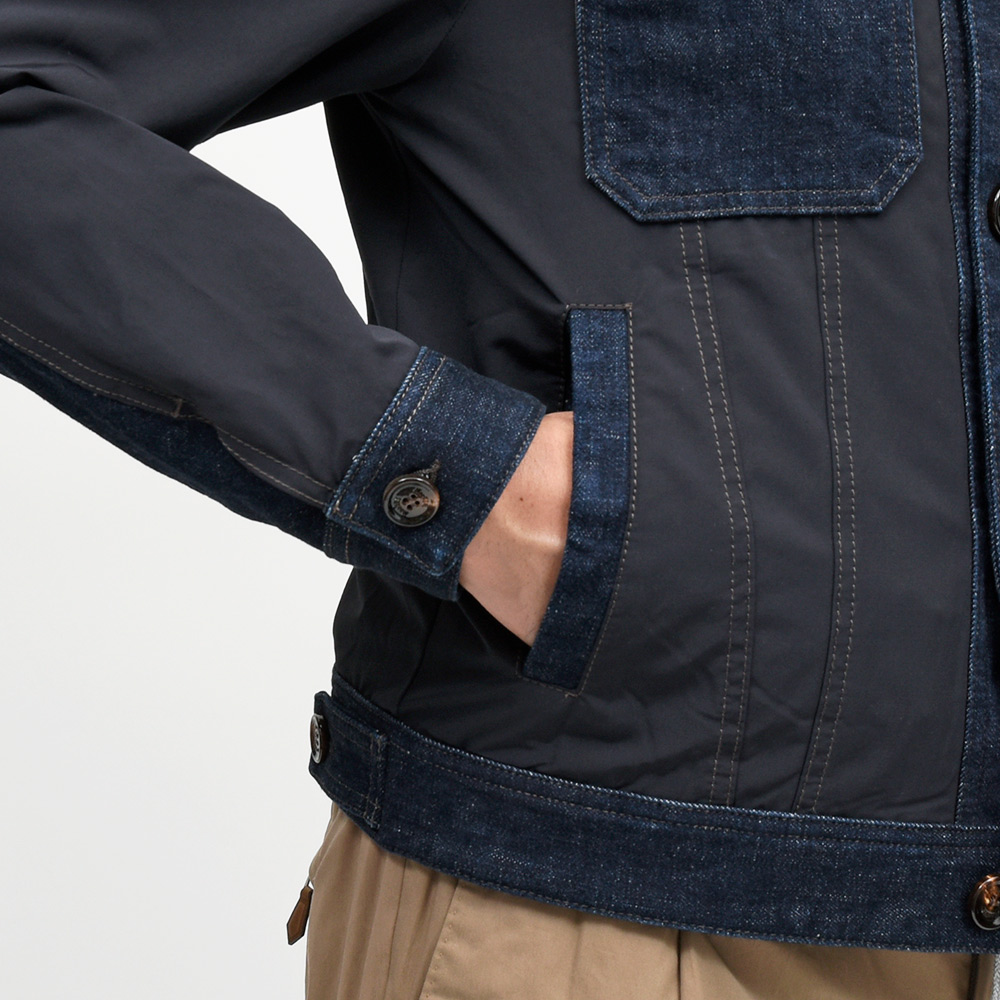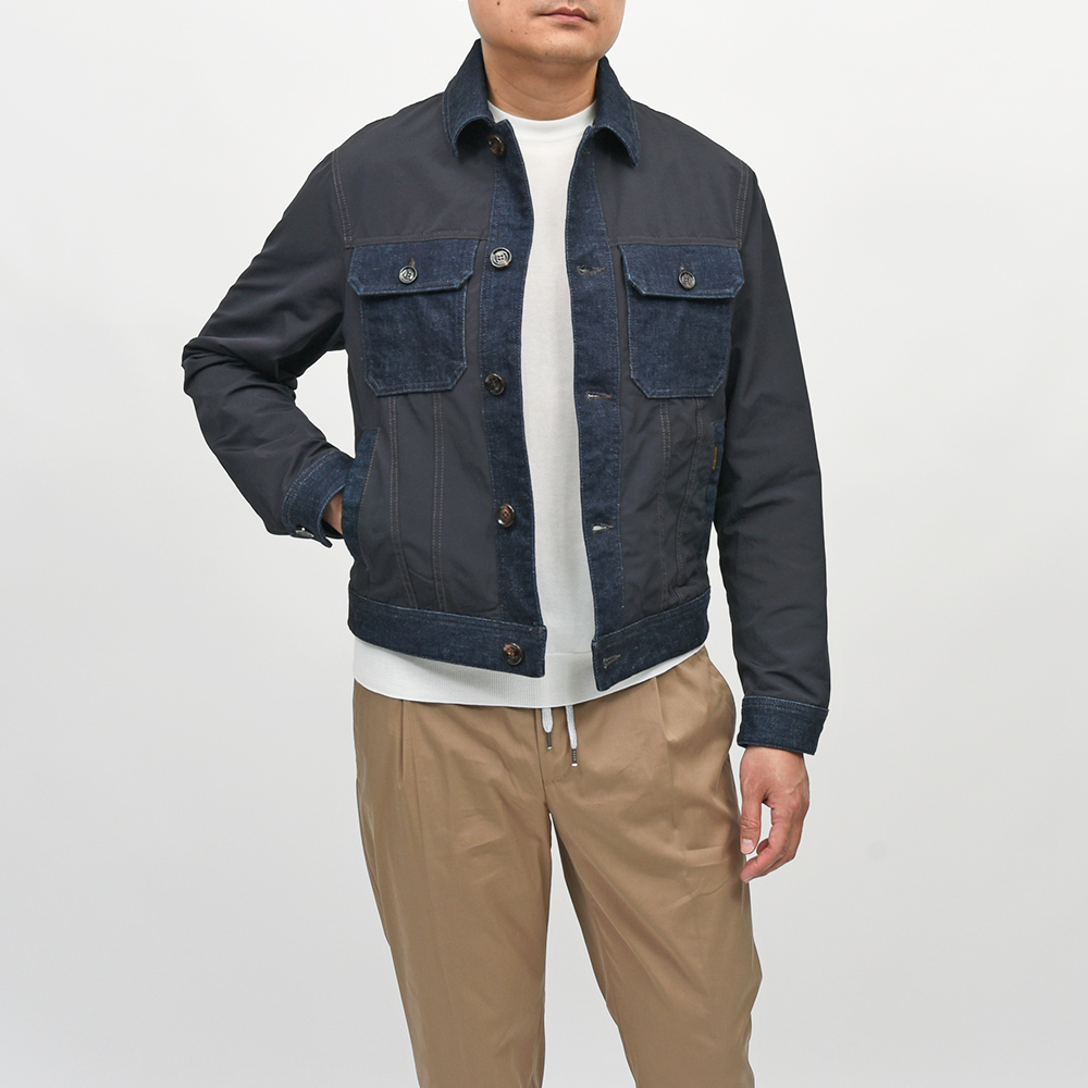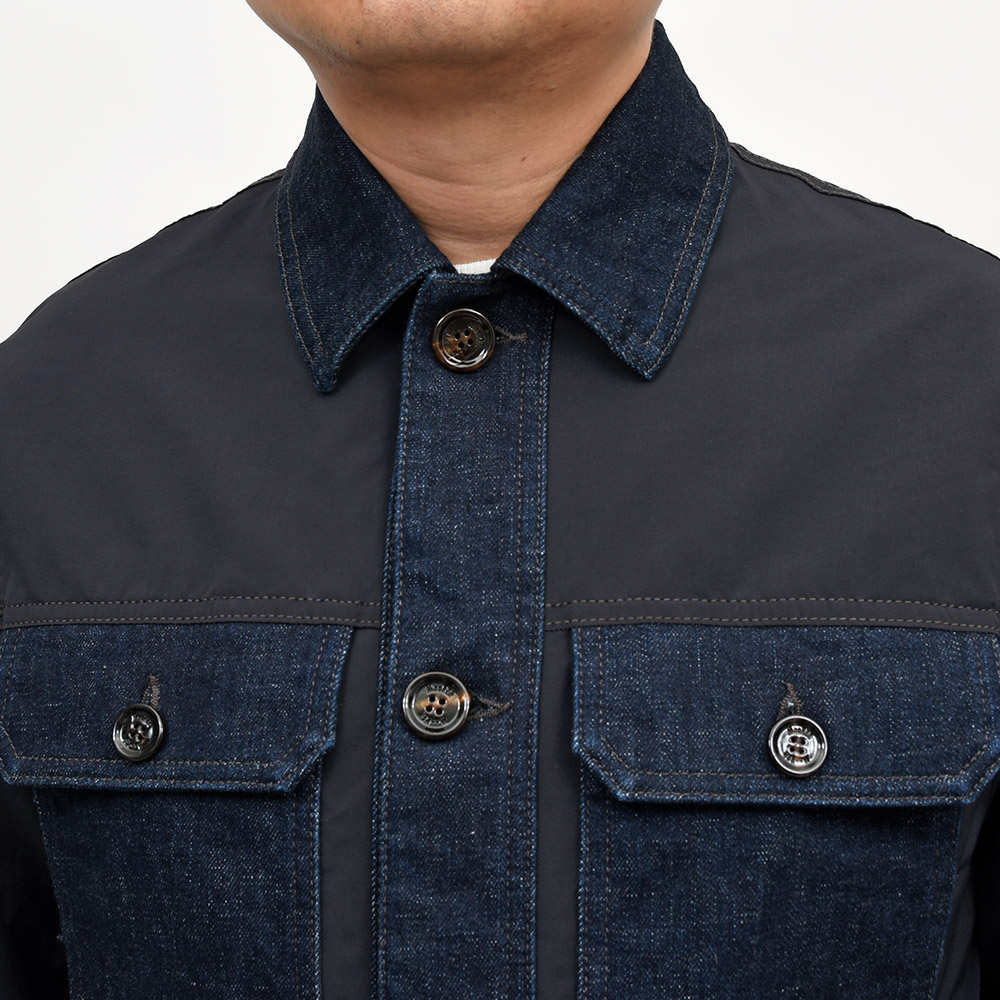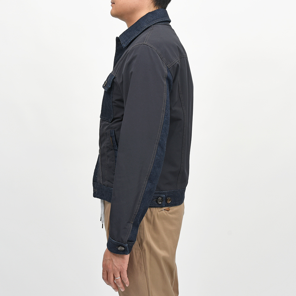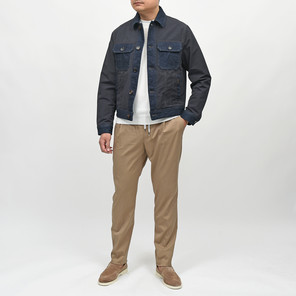 今シーズン新登場した、トラッカージャケットをベースとしたモデル“DANTAS(ダンタス)”。ベーシックな胸ポケットだけではなく、スラントポケットを加えることで実用性を増した着心地となっています。また、コットンポリエステルのオットマン生地をベースに、デニム生地を部分で使用したコンビ使い。酵素ウォッシュ加工を施すことで生地の風合いを高め、ソフトな着心地に仕上がっています。